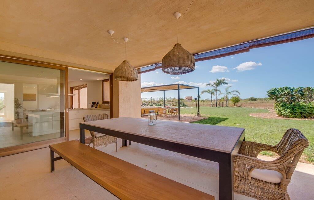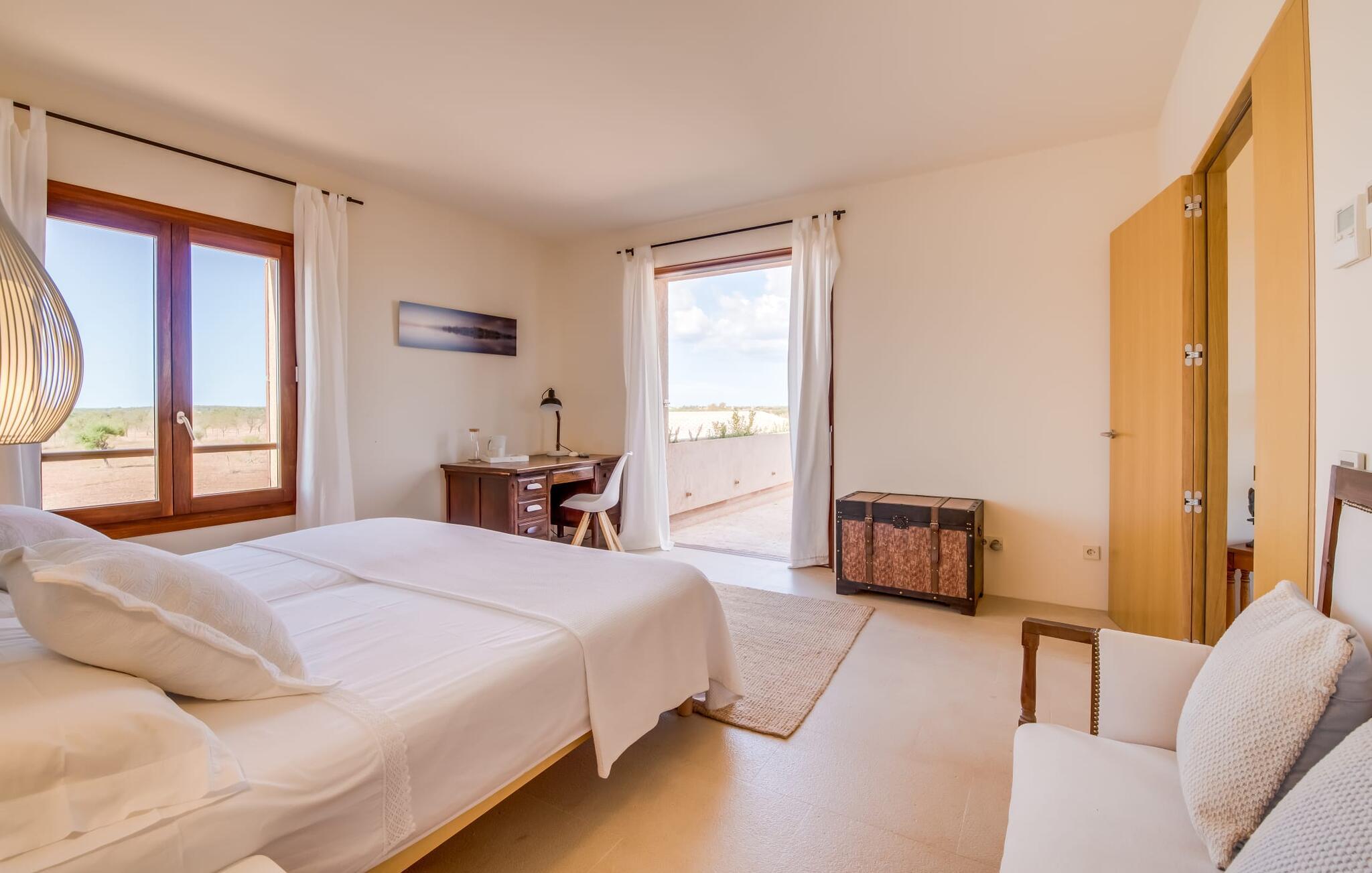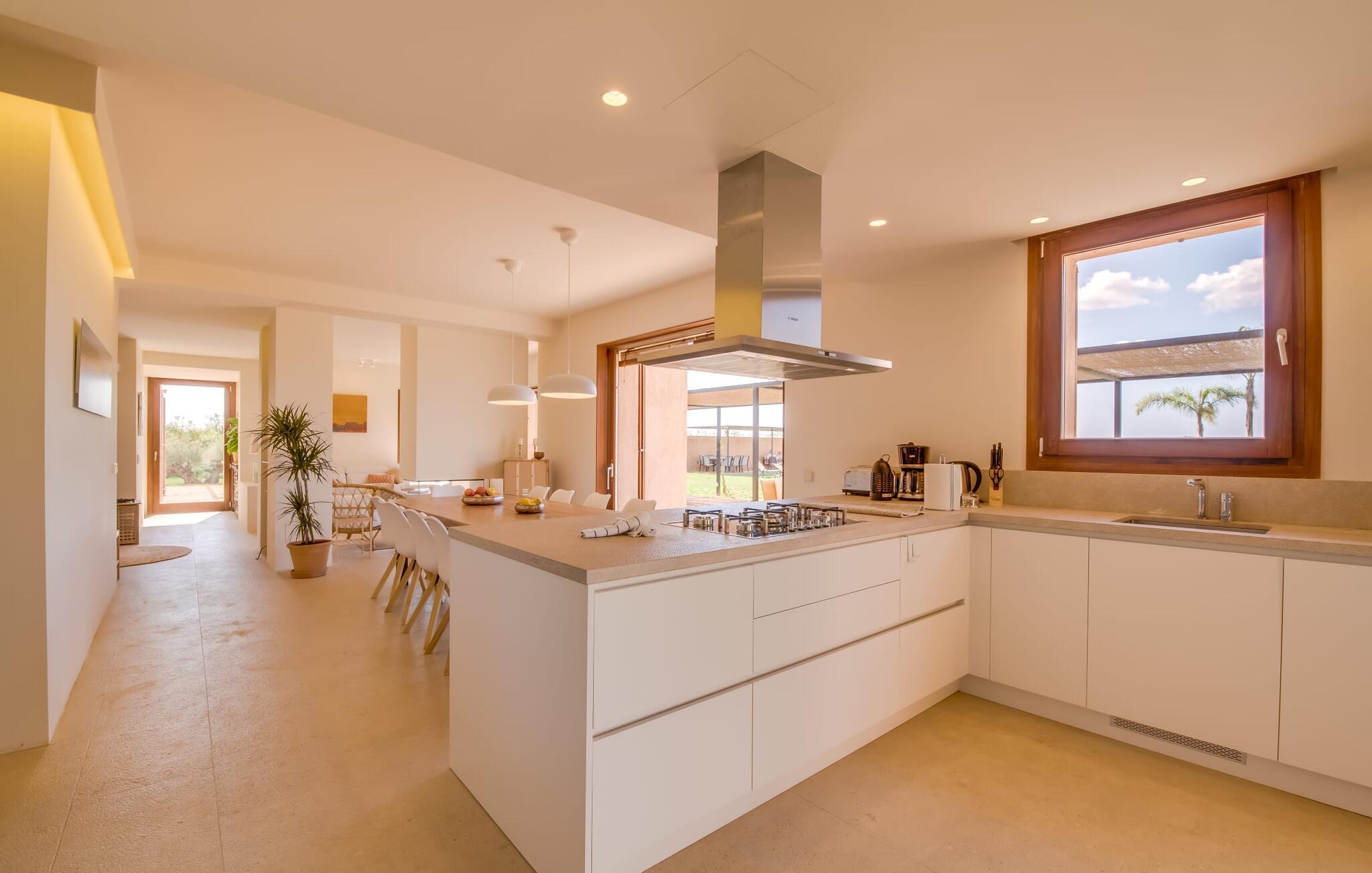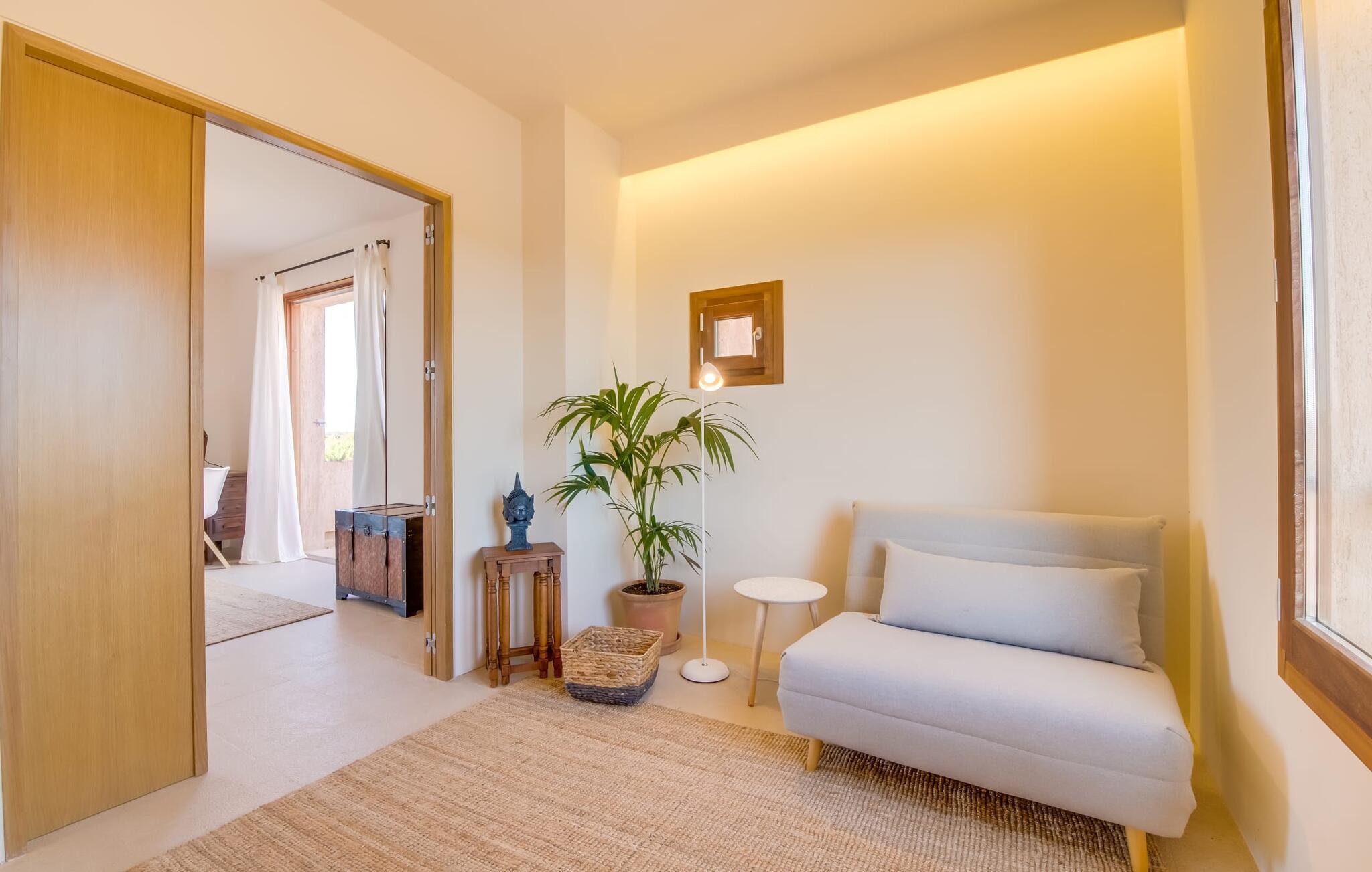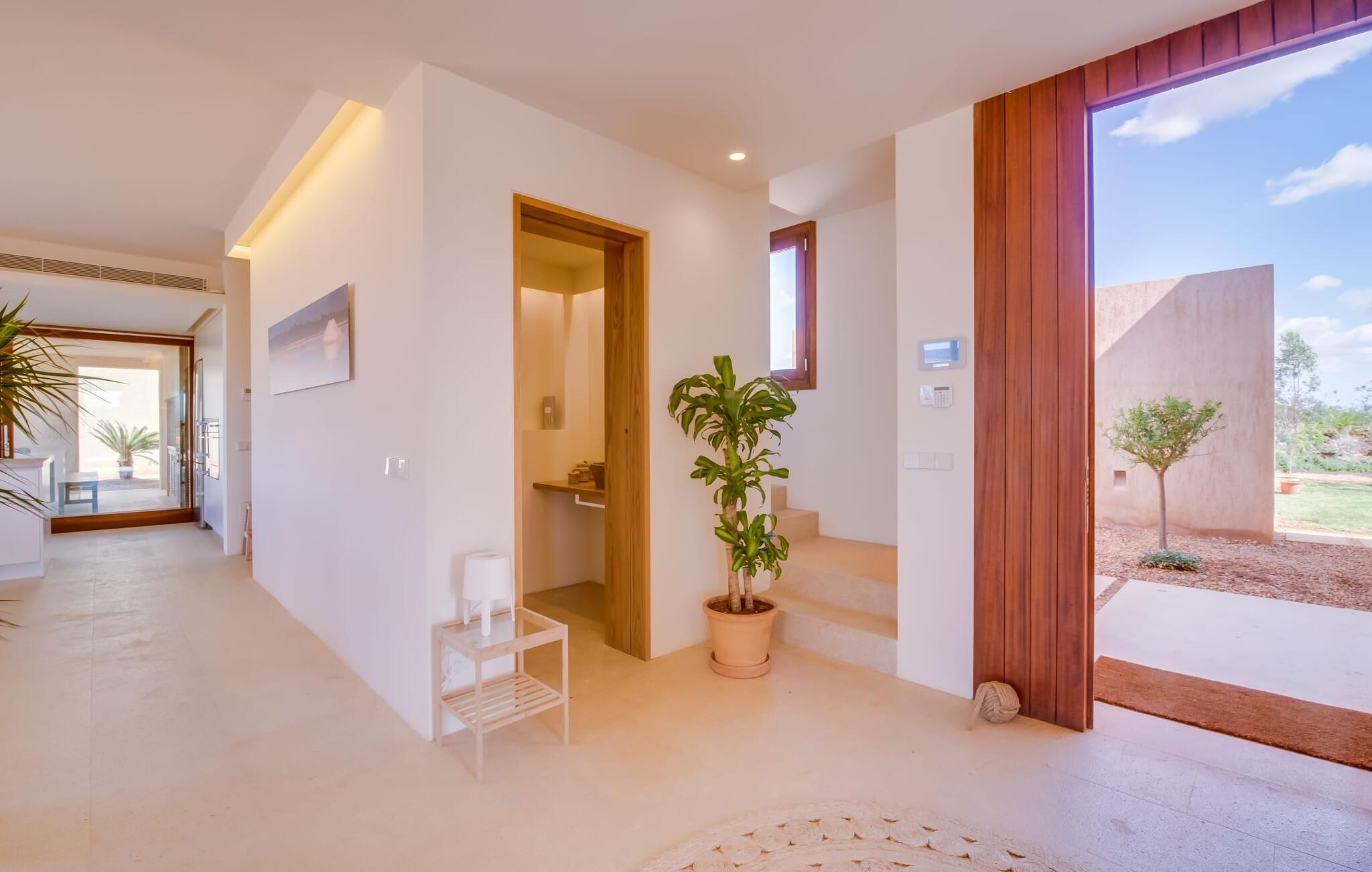 Midt mellem marker i den vidunderlige vidde af den sydlige del af øen vil I opdage den unikke villa "Thalassa d'Es Trenc". Ejendommen er opført i 2018 og imponerer med sin progressive æstetik, hvilket også afspejles i ejendommens udendørsareal. En have med græsplæner og en rummelig pool med børnevenlig dybde er omgivet af palmer. Under den overdækkede terrasse for enden af poolen kan I slappe af i komfortable siddepladser efter svømning eller vie jeres fulde opmærksomhed til solen på de indbydende liggestole. Der er en aflang veranda lige ved siden af bygningen. Morgenkaffe, morgenmad sammen på smagfulde udendørsmøbler eller hjemmelavet sangria om aftenen i den afslappede lounge – her finder I et skønt sted fuld af uhæmmet livsglæde på alle tider af døgnet. Der er terrasser foran de enkelte lejligheder og ikke at forglemme panoramaudsigten fra tagterrassen ved siden af det store soveværelse. Hvis jeres ideelle ferie involverer at lave lækre måltider med venner eller familie og også nyder at gøre det udendørs, så vil I elske den udendørs kabyss lige så meget som vi gør. Det er i bund og grund en forlængelse af det trendy og fuldt udstyrede indendørs køkken, som det har direkte adgang til. Det ser ud til, at arkitekten virkelig var opmærksom på hver detalje i dette imponerende attraktive landsted. "Form følger funktion": Denne bygning inkarnerer dette motto perfekt med sit puristiske udseende. Den lange bygnings lige linjer og rene former danner et hovedhus med en sidefløj, der rummer to separate atelierer med hver sit badeværelse. Studierne er forbundet med hovedhuset, men danner stadig selvstændige enheder med deres egne indgange, hvilket sikrer, at alle privatlivsbehov er opfyldt. Det unikke, minimalistiske interiørdesign i beroligende beige og hvide toner afspejles også i de tidløse, højkvalitetsmøbler lavet af bæredygtige materialer. Designet imponerer med sin enkle, men elegante karakter og er samtidig meget komfortabel. Sidst, men ikke mindst, har det træmøbler, en pejs og gulvvarme, hvilket gør huset til fremragende indkvartering selv i de køligere måneder af lavsæsonen. En elevator sikrer barrierefri adgang til soveværelset på øverste etage. De trendy badeværelser, som præsenterer en matchende, harmonisk lys farveskala, opfylder de samme krav og er udstyret med brusekabine. Afslapning er garanteret – ikke mindst på grund af det vidunderlige design og gennemtænkte arkitektur, der fik os til at forelske os i dette sted. Placeringen af villaen, hvis navn er en hyldest til den nærliggende drømmestrand med caribisk flair, er perfekt. Selv soldyrkere, der foretrækker at svømme nøgne, vil finde det perfekte sted i det fine sand i flere kilometer. På grund af villaens nærhed til landevejen, som indimellem er hørbar, kan I ekstremt hurtigt nå de omkringliggende indre byer og kystbyer og blive overrasket over mulighederne, lige fra turisttilbud til landlige landsbyer. Vores konklusion om "Thalassa d'Es Trenc": Mere end anbefalet og en absolut drømmeplacering, der hjælper jer med at undslippe hverdagens stress. Den nybyggede villa "Thalassa d'Es Trenc" imponerer med sin puristiske æstetik og et smukt udeområde. Det barrierefri hus ligger i den sydlige del af øen mellem Campos og kystbyen Ses Covetes, hvor I kan kombinere jeres shopping med et besøg på stranden. Denne premium ejendom skylder sit navn til sin nærhed til drømmebugten Es Trenc, som ligger omkring 4 km fra villaen. Vi anser denne bolig for tilgængelig for vores gæster med nedsat mobilitet, men vi opfordrer alle gæster til at overveje boligens egnethed baseret på deres egne krav.