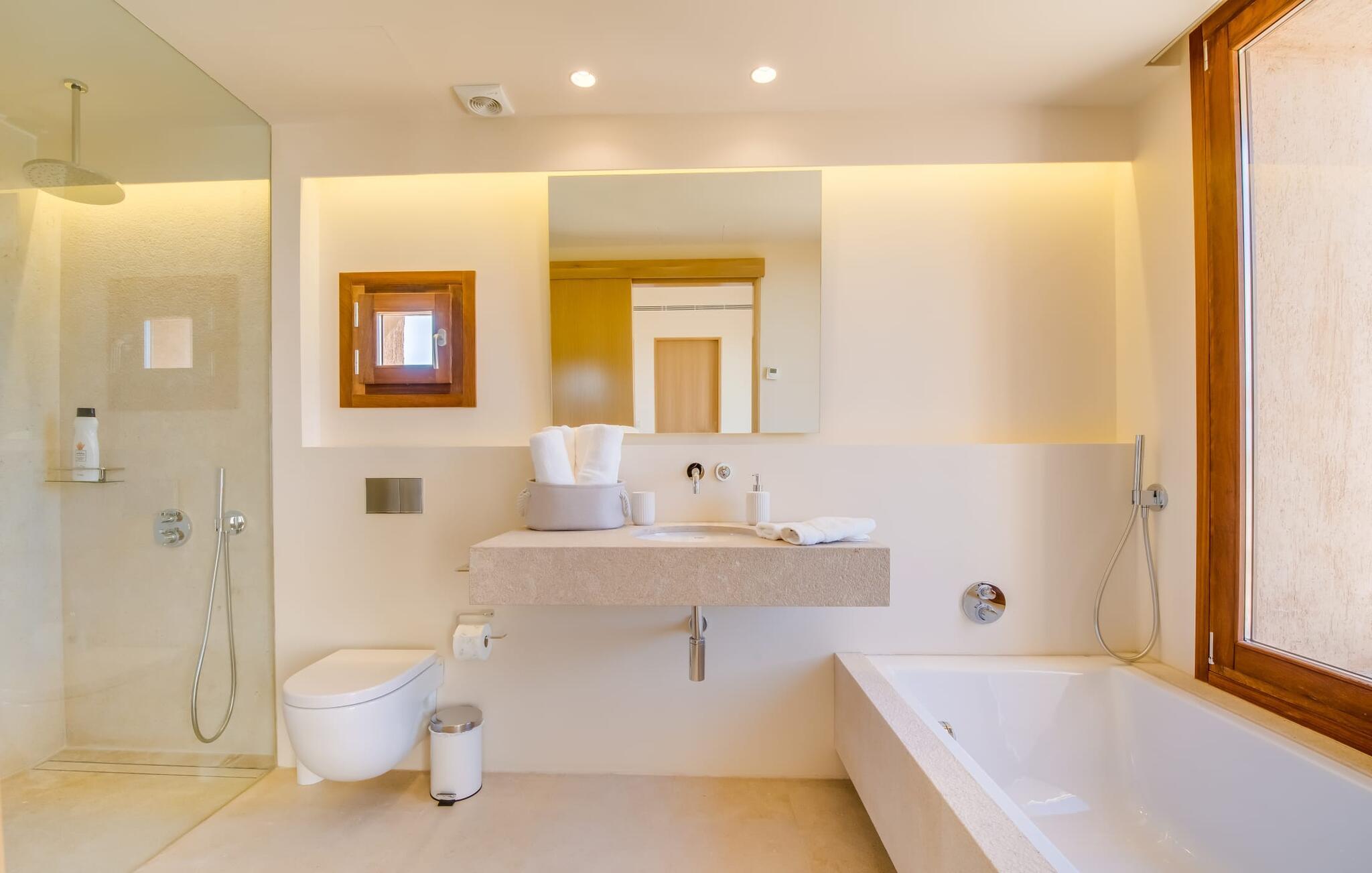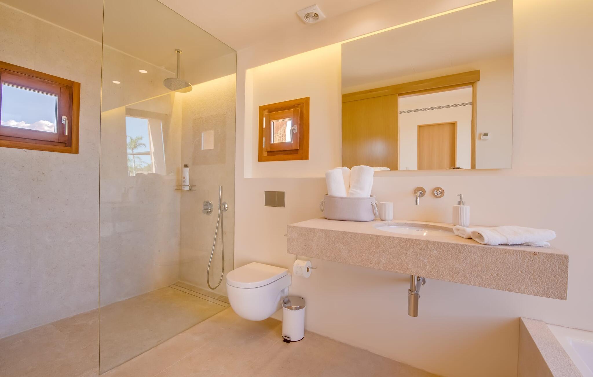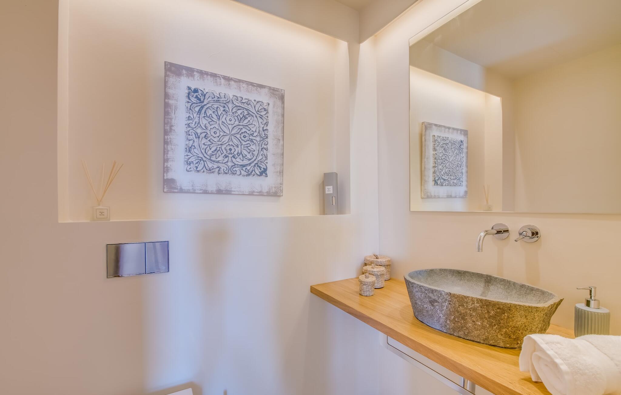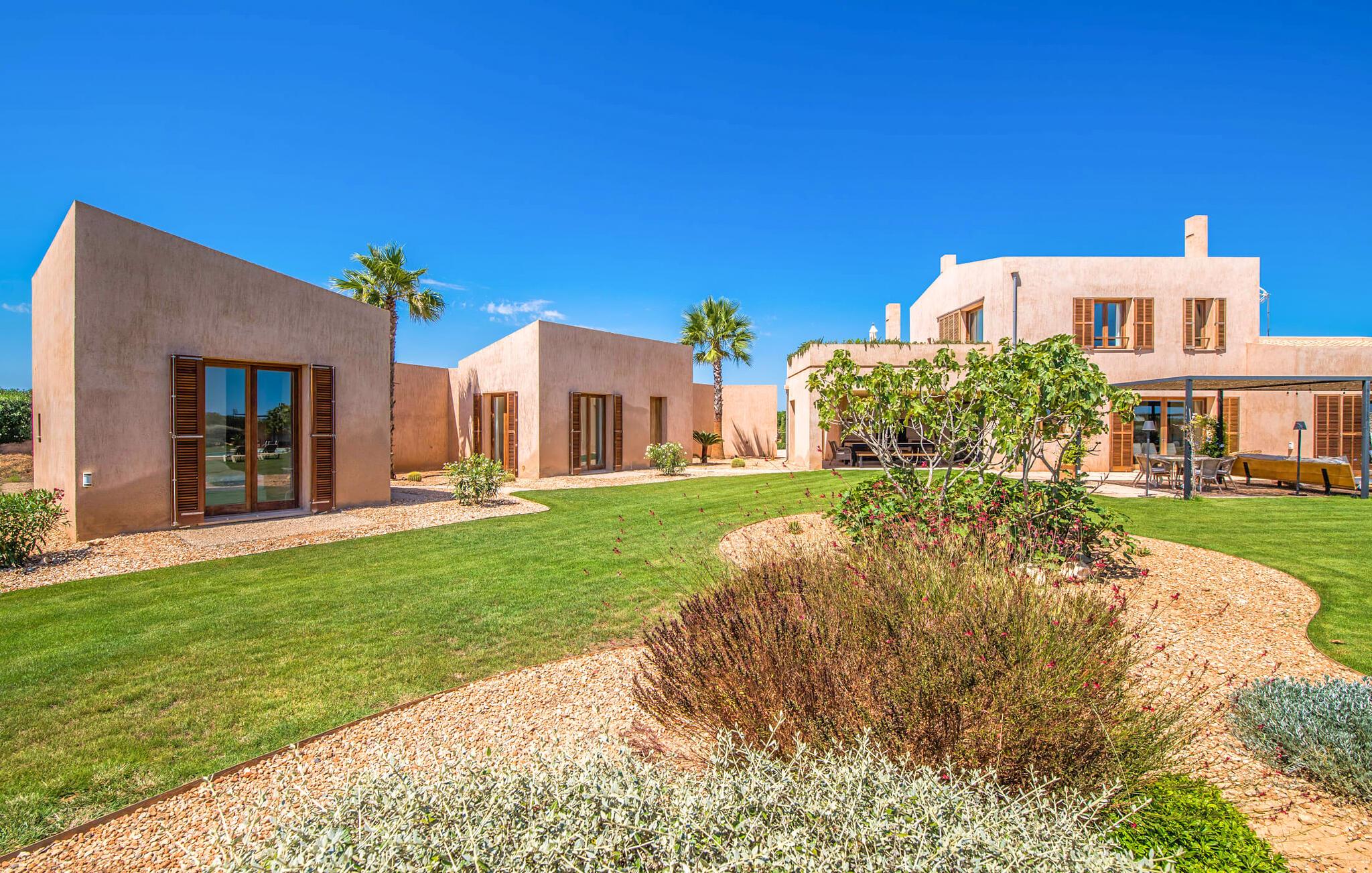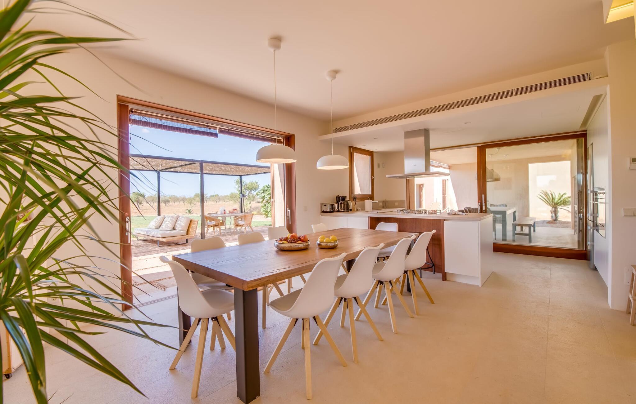 Midt mellem marker i den vidunderlige vidde af den sydlige del af øen vil I opdage den unikke villa "Thalassa d'Es Trenc". Ejendommen er opført i 2018 og imponerer med sin progressive æstetik, hvilket også afspejles i ejendommens udendørsareal. En have med græsplæner og en rummelig pool med børnevenlig dybde er omgivet af palmer. Under den overdækkede terrasse for enden af poolen kan I slappe af i komfortable siddepladser efter svømning eller vie jeres fulde opmærksomhed til solen på de indbydende liggestole. Der er en aflang veranda lige ved siden af bygningen. Morgenkaffe, morgenmad sammen på smagfulde udendørsmøbler eller hjemmelavet sangria om aftenen i den afslappede lounge – her finder I et skønt sted fuld af uhæmmet livsglæde på alle tider af døgnet. Der er terrasser foran de enkelte lejligheder og ikke at forglemme panoramaudsigten fra tagterrassen ved siden af det store soveværelse. Hvis jeres ideelle ferie involverer at lave lækre måltider med venner eller familie og også nyder at gøre det udendørs, så vil I elske den udendørs kabyss lige så meget som vi gør. Det er i bund og grund en forlængelse af det trendy og fuldt udstyrede indendørs køkken, som det har direkte adgang til. Det ser ud til, at arkitekten virkelig var opmærksom på hver detalje i dette imponerende attraktive landsted. "Form følger funktion": Denne bygning inkarnerer dette motto perfekt med sit puristiske udseende. Den lange bygnings lige linjer og rene former danner et hovedhus med en sidefløj, der rummer to separate atelierer med hver sit badeværelse. Studierne er forbundet med hovedhuset, men danner stadig selvstændige enheder med deres egne indgange, hvilket sikrer, at alle privatlivsbehov er opfyldt. Det unikke, minimalistiske interiørdesign i beroligende beige og hvide toner afspejles også i de tidløse, højkvalitetsmøbler lavet af bæredygtige materialer. Designet imponerer med sin enkle, men elegante karakter og er samtidig meget komfortabel. Sidst, men ikke mindst, har det træmøbler, en pejs og gulvvarme, hvilket gør huset til fremragende indkvartering selv i de køligere måneder af lavsæsonen. En elevator sikrer barrierefri adgang til soveværelset på øverste etage. De trendy badeværelser, som præsenterer en matchende, harmonisk lys farveskala, opfylder de samme krav og er udstyret med brusekabine. Afslapning er garanteret – ikke mindst på grund af det vidunderlige design og gennemtænkte arkitektur, der fik os til at forelske os i dette sted. Placeringen af villaen, hvis navn er en hyldest til den nærliggende drømmestrand med caribisk flair, er perfekt. Selv soldyrkere, der foretrækker at svømme nøgne, vil finde det perfekte sted i det fine sand i flere kilometer. På grund af villaens nærhed til landevejen, som indimellem er hørbar, kan I ekstremt hurtigt nå de omkringliggende indre byer og kystbyer og blive overrasket over mulighederne, lige fra turisttilbud til landlige landsbyer. Vores konklusion om "Thalassa d'Es Trenc": Mere end anbefalet og en absolut drømmeplacering, der hjælper jer med at undslippe hverdagens stress. Den nybyggede villa "Thalassa d'Es Trenc" imponerer med sin puristiske æstetik og et smukt udeområde. Det barrierefri hus ligger i den sydlige del af øen mellem Campos og kystbyen Ses Covetes, hvor I kan kombinere jeres shopping med et besøg på stranden. Denne premium ejendom skylder sit navn til sin nærhed til drømmebugten Es Trenc, som ligger omkring 4 km fra villaen. Vi anser denne bolig for tilgængelig for vores gæster med nedsat mobilitet, men vi opfordrer alle gæster til at overveje boligens egnethed baseret på deres egne krav.