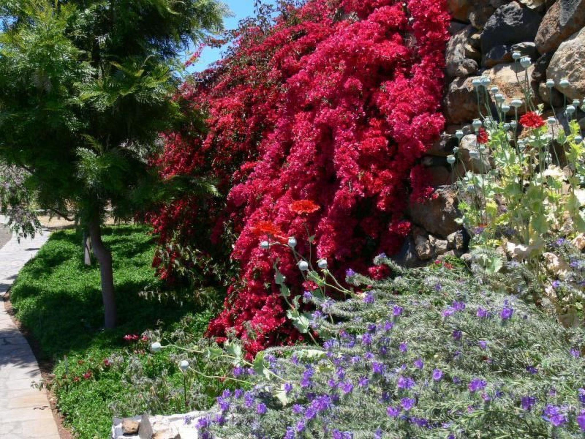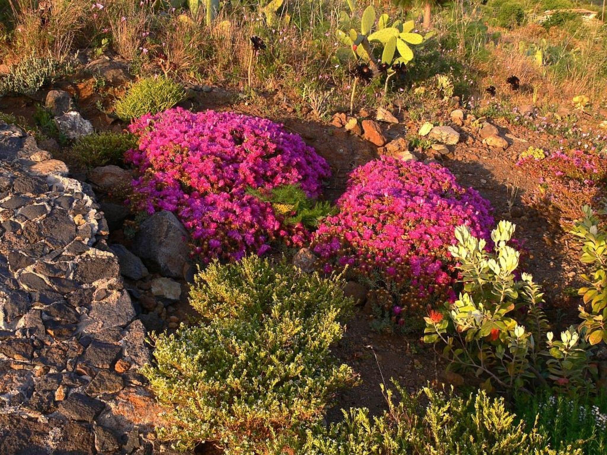 2 sun terraces with garden furniture, sun loungers and parasols, Japanese stone garden, herb corner in the garden with oregano, basil, thyme, marjoram, Sabai; subtropical garden, lawn, ecologically valuable Opuntia (prickly pear), unprocessed waste land with Canarian pine and almond trees, parking in front of the house. The house is ideal for two to three adults; when children or young people are traveling to 16 years, the large sofa bed in Gästebreich is also suitable for two children. Important to compare: The price includes all utilities are included: Hot and cold water, heating (eg underfloor heating in the bathroom), towels, linens, beach towels, Elektritität, ADSL Internet access with WLAN, use of washer and dryer, use of the pool, community fees, parking, final cleaning Family friendly offer: Children and young people up to 16 years are our guests. You pay nothing if they are accompanied by two paying adults. For babies and toddlers are available for free: baby bath, high chair, stroller, carrier frame for hiking.