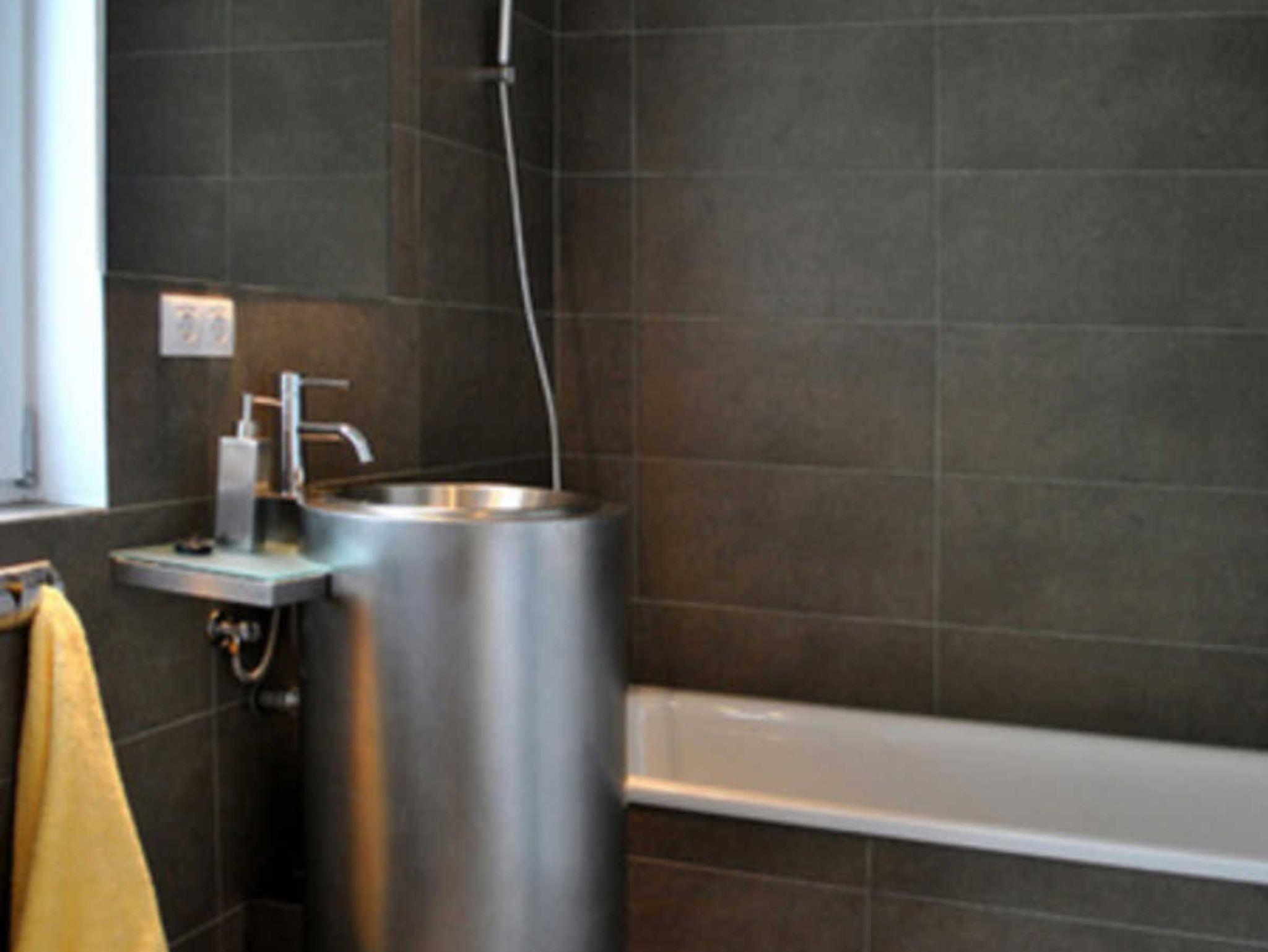 Das en-suite Bad ist in warmem Grau gehalten und verfügt über eine Badewanne mit Dusche, ein formschönes Designerwaschbecken aus Edelstahl, sowie ein WC.