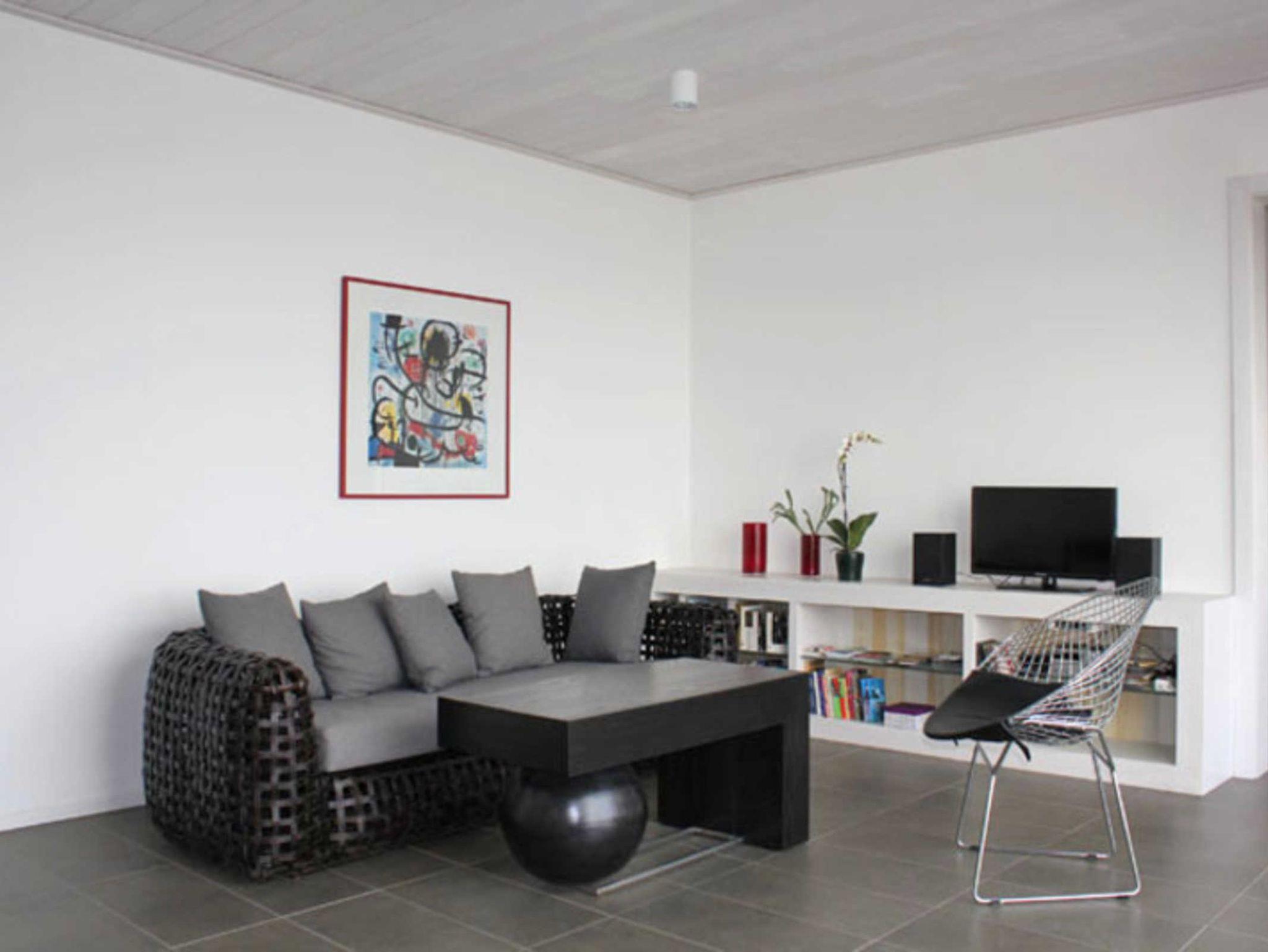 Die in schlichtem Weiß gehaltenen Wände wurden mit einem Grau gefließten Boden kombiniert. Werke von Miró bringen Farbe ins Spiel und ergänzen das Design.