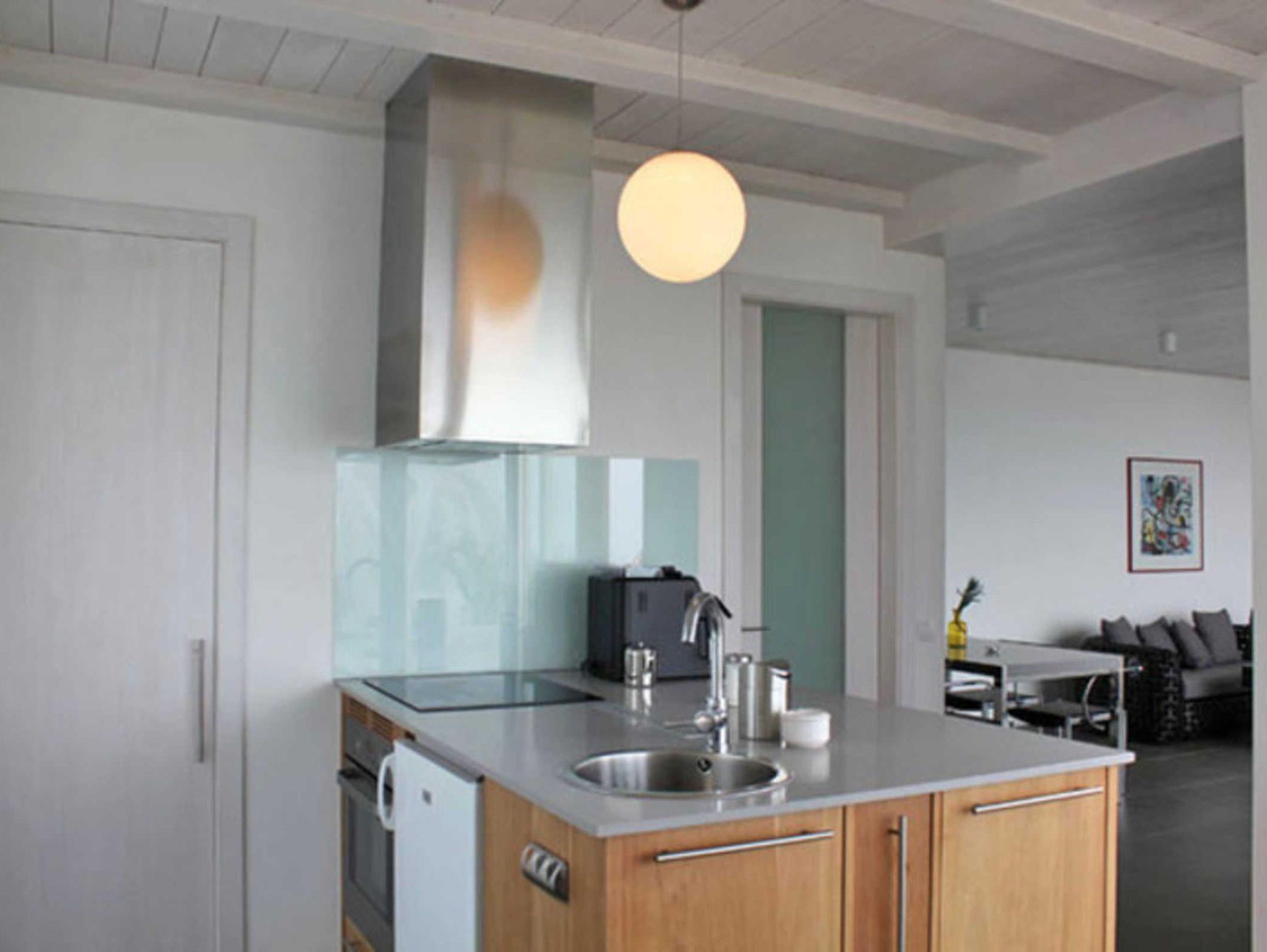 In den holzverkleideten Schränken darunter, sowie in einem kaum sichtbaren Einbauschrank in der Wand, ist viel Stauraum für die Spülmaschine, Kochutensilien und Geschirr. Eine Grundausstattung an Gewürzen steht bereit.