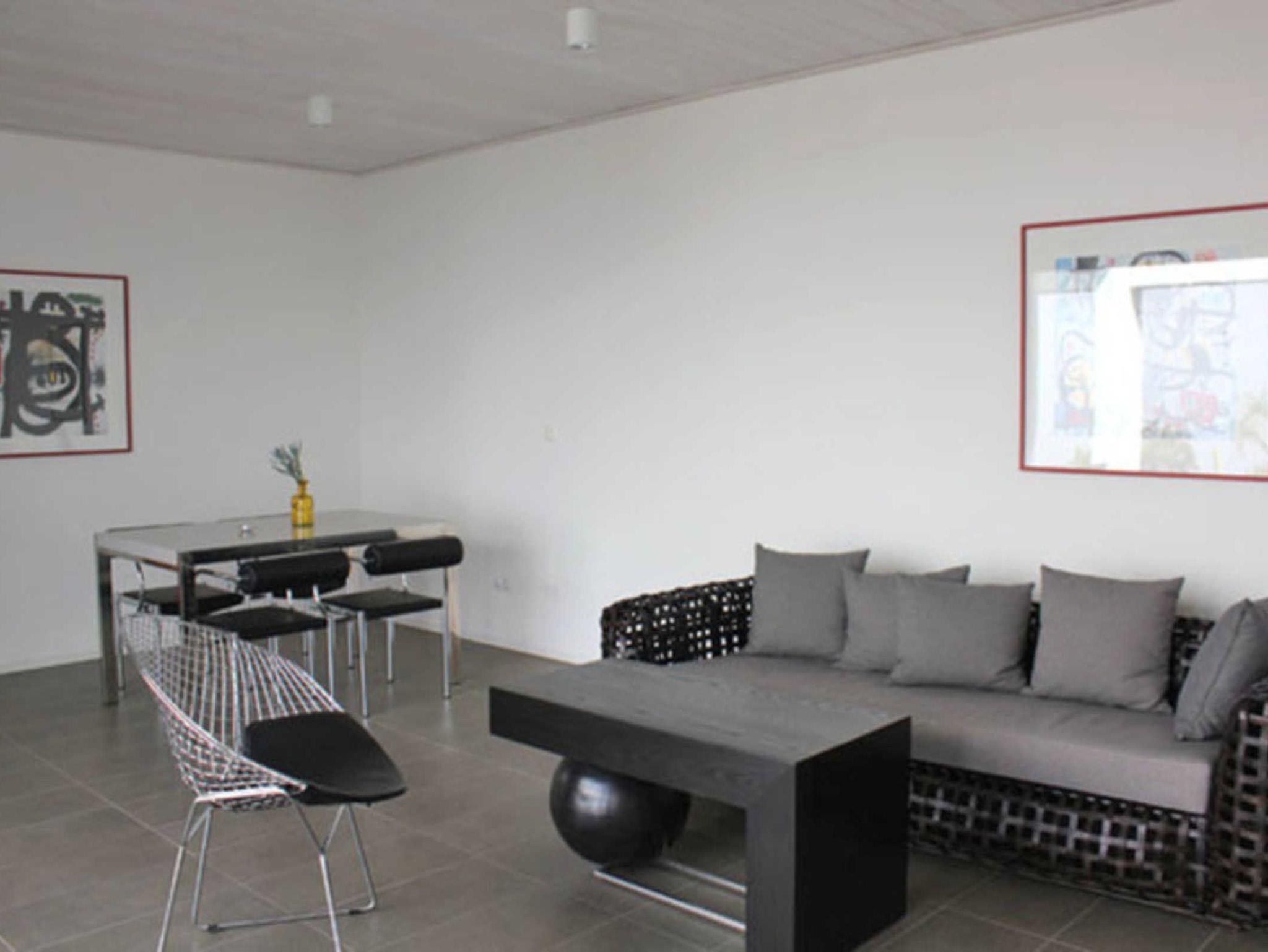 Der offene Wohnbereich bietet Raum für einen Esstisch mit 4 Lederstühlen, sowie eine Couchecke. Blickfang im Wohnbereich ist der von der Eigentümerin selbst entworfene Wohnzimmertisch, der mit der formschönen Couch aus dunklem, grobem Rattan perfekt harmoniert. Von hier geht der Blick durch die große Fensterfront direkt aufs Meer.