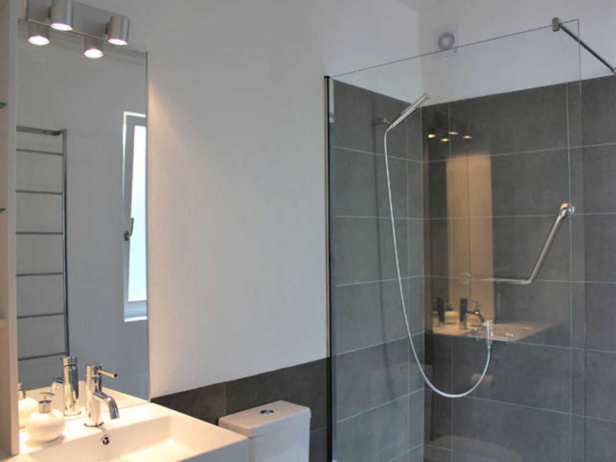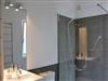 Das zweite Bad ist in Weiß und Grau gehalten und verfügt über Dusche, Waschbecken und WC.