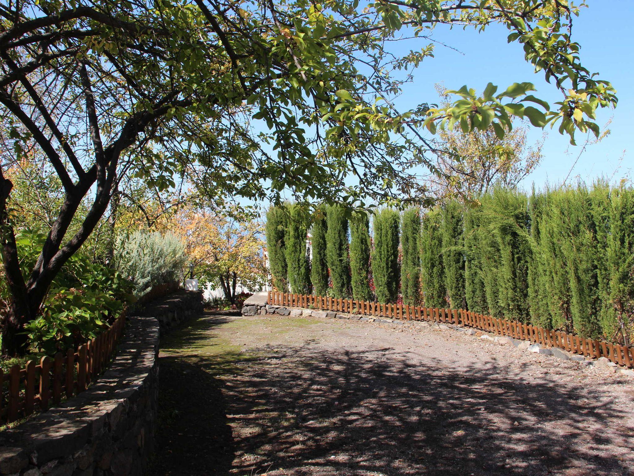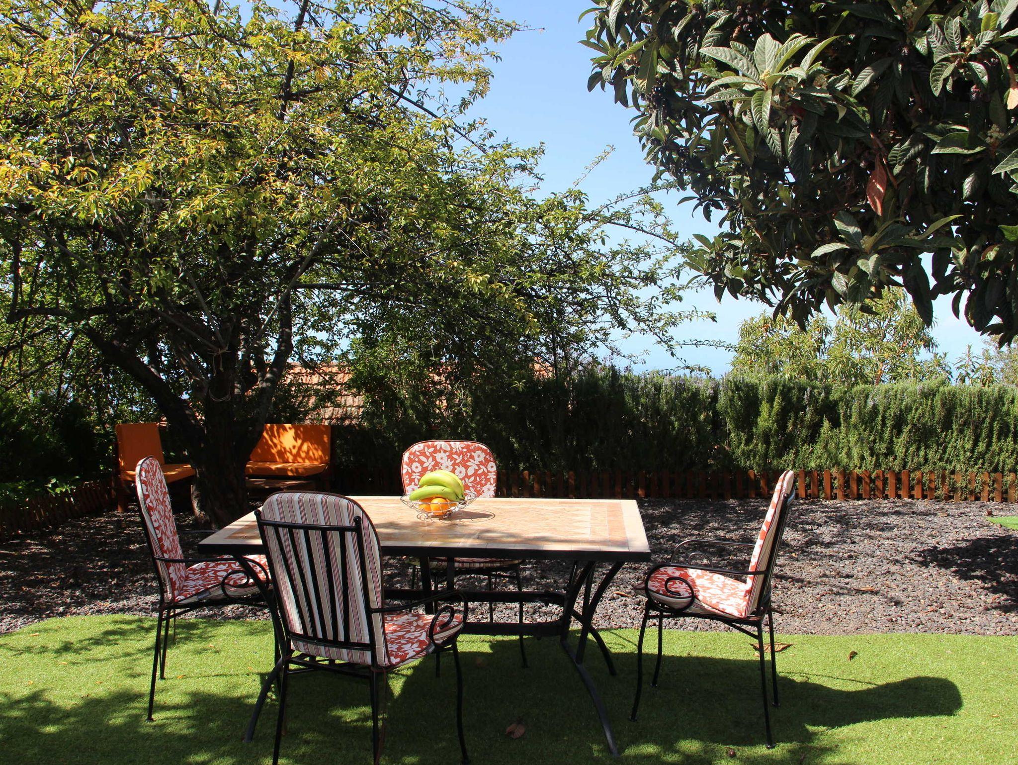 Der große Garten und Aussenbereich wird dominiert von schattenspendenden Obstbäumen. Ein großer überdachter Grill mit Spüle und einem Tisch für 4 Personen sorgt ganzjährig für Gaumenfreuden. Es gibt mehrere Sitzmöglichkeiten. Man kann auf originellen Holzmöbeln unter Bäumen sitzen, direkt am Haus an einem kleinen Tisch mit Stühlen oder auf einem großen Steinbänkchen mit Blick in den Garten und phantastischem Blick hinauf in die Berge. Vom Garten aus kann man in der Ferne auch das Meer sehen.