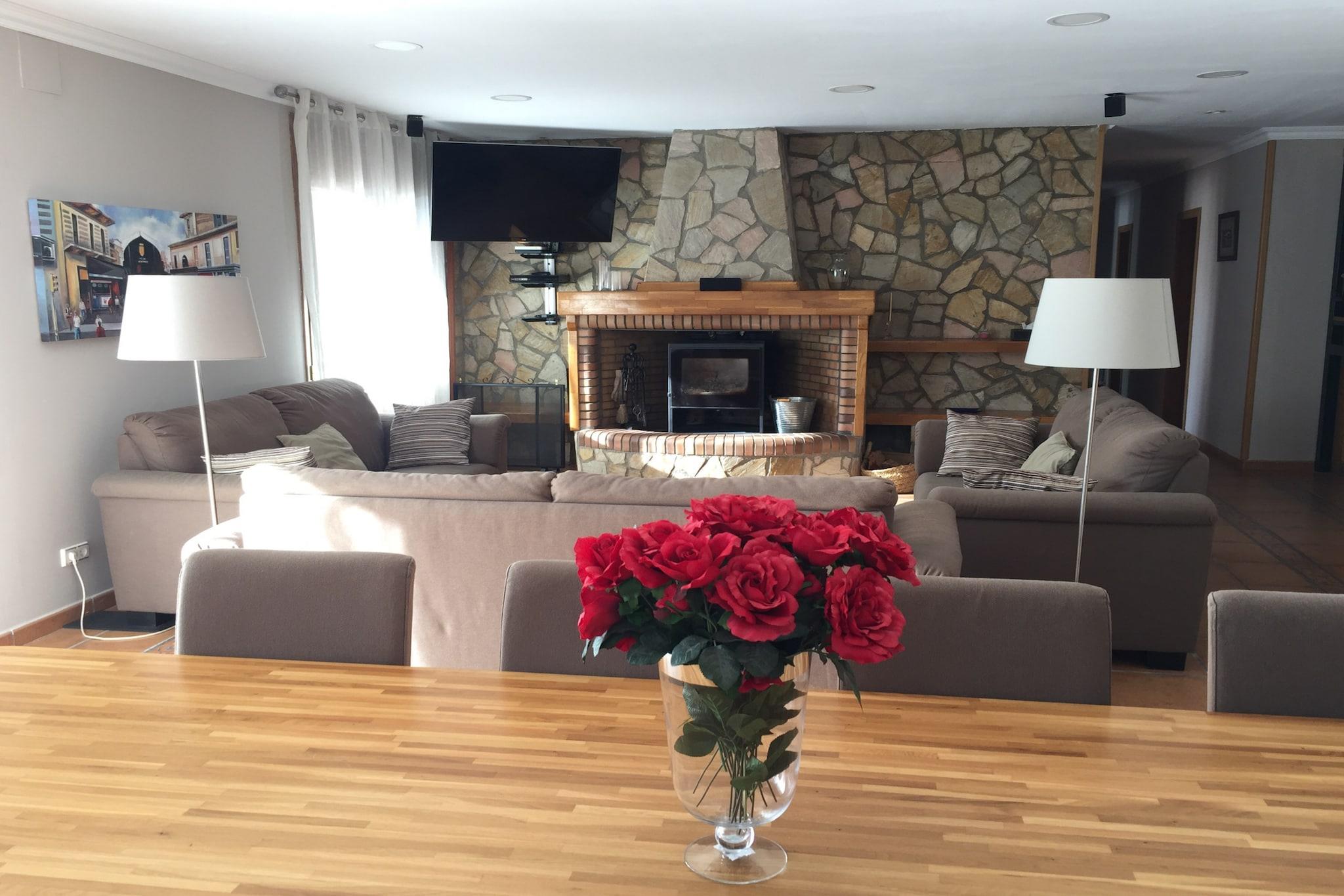Dette rummelige og stilfulde feriehus ligger i det fredelige boligområde Mas Mora, Tordera. Kun en kort køretur fra de pulserende byer Blanes og Lloret de Mar tilbyder det nem adgang til de fantastiske strande på Costa Brava. Med 350 m² boligareal kan denne villa komfortabelt rumme op til 12 gæster fordelt på seks soveværelser - fem dobbeltværelser og et værelse med to enkeltsenge - hvilket gør den ideel til store familier eller grupper, der søger en afslappende ferie. Villaens udendørsområde er et sandt højdepunkt med en privat saltvandspool (7m x 4m), en grill og et dedikeret udendørs spiseområde, der er perfekt til at nyde måltider under åben himmel. Indenfor finder du en stor, komfortabel opholds- og spisestue med en hyggelig pejs, et fuldt udstyret køkken, tre badeværelser og masser af underholdningsmuligheder, herunder et spillerum, bordtennisbord og fitnesscenter. Parkering til tre køretøjer og gratis Wi-Fi sikrer bekvemmelighed under hele dit ophold. Villa Kiros er forpligtet til bæredygtighed og minimerer miljøpåvirkningen ved at maksimere naturressourcerne og fremme genbrug. Beliggende kun en time fra Barcelona og 20 minutter fra Girona, er den perfekt placeret til at udforske regionens attraktioner. Bemærk venligst, at villaen kun byder familier og modne grupper (25+) velkommen, og kæledyr, rygning eller fester er ikke tilladt, hvilket sikrer en fredelig atmosfære for alle gæster.
