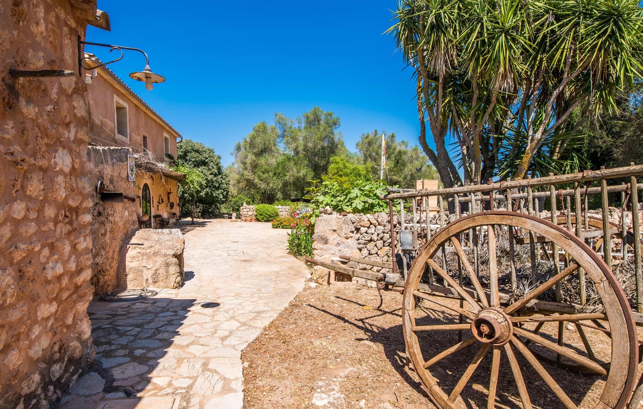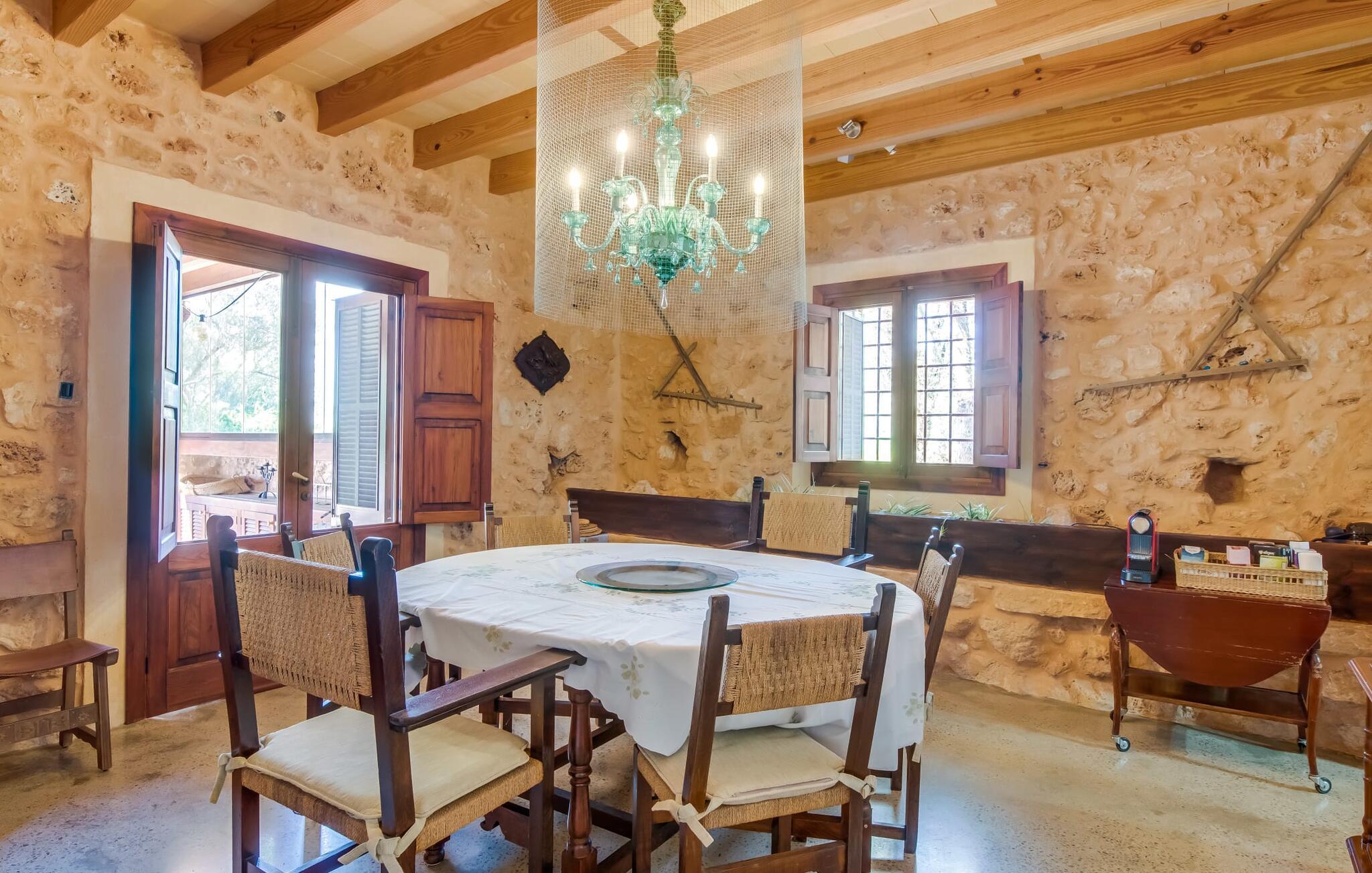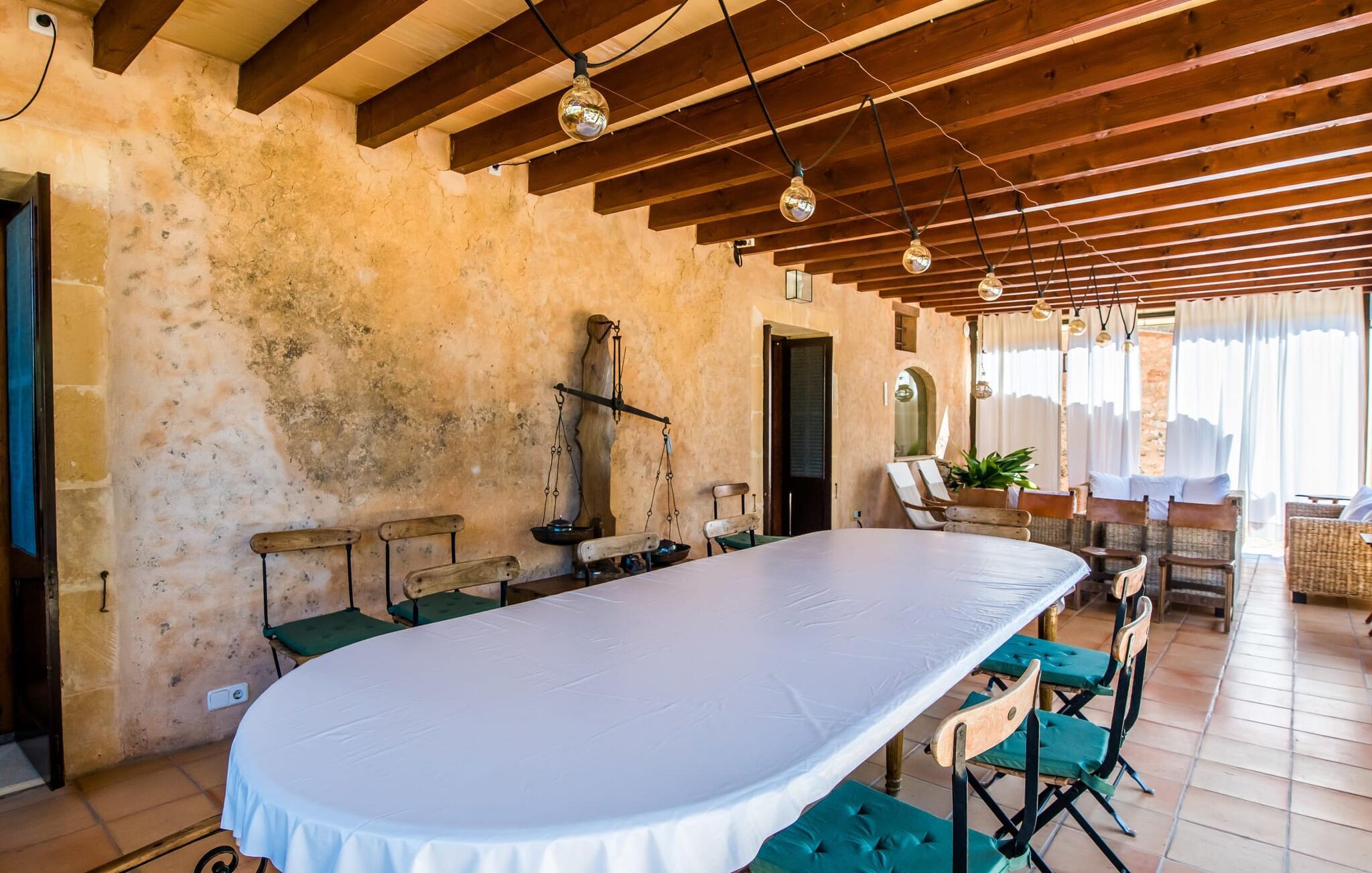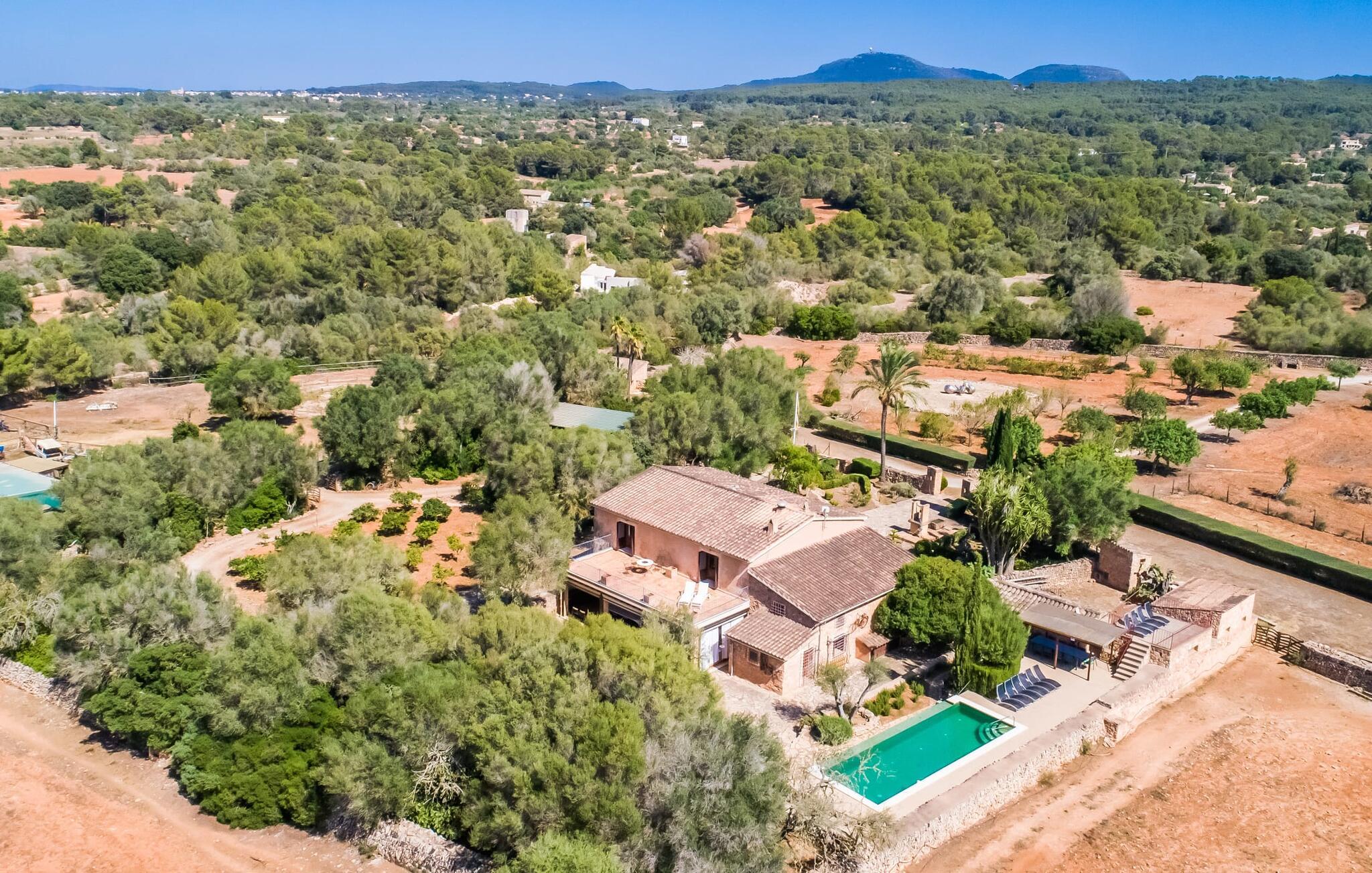 Hvis I vil have mere end blot at tilbringe jeres ferie på Mallorca; Hvis I også vil nyde den typiske mallorcanske charme, er I kommet til det rigtige sted i villaen "Torre d'en Huc". Både inde og ude har ejerne lagt stor vægt på, at ølivets oprindelige karakter ikke blot bevares, men også blandes med moderne elementer. Og hvad er slutresultatet? En stor ejendom, hvis sans for detaljer altid minder jer om, hvor I er. Her og der på væggene kan man finde redskaber, der minder om øboernes hverdag, før Mallorca blev opdaget som turistmål, hvor landbruget dominerede landskabet. I dag står dørene åbne for gæster, der sætter pris på autentisk stil. Alt her er blevet restaureret med stil; Når I træder ind i ejendommen, bliver I mødt af en stor gårdhave, hvor I vil finde jeres første valg af komfortable siddepladser ved siden af et springvand. Nu er I forkælet med valg med hensyn til, hvor I skal slappe af i solen, der er så mange at vælge imellem. En overdækket terrasse, en terrasse på første sal, et lille rum under svajende grene, stenbænke langs en mur og poolområdet. Beplantningen varieres uden at fremstå kunstig eller "planlagt og designet" på nogen måde. Takket være denne vellykkede balancegang, er I garanteret at tilbringe mange dejlige timer i den friske luft og føle en følelse af afslapning, der kun er mulig, når den mest gennemprøvede opskrift på en vellykket ferie er sammensat: Tag ind i en ejendom fyldt med karakter, drømmende, idyllisk sted, hvor I næsten kan læse jeres sind og derefter være tilgængelig for at opfylde alle jeres ønsker; Tilføj lækre grillspecialiteter og stimulerende samtale. Top det hele af med endeløse sommeraftener afkølet af en mild brise. På et tidspunkt vil I endelig trække jer tilbage til villaen - og så har I så meget desto mere grund til at ånde et suk af tilfredshed. Det samme gør sig gældende for interiøret: sans for detaljer, udsøgte møbler, autentiske genstande fra villaens begivenhedsrige fortid og moderne kunstform en så fremragende blanding, at I helt sikkert vil bruge lidt mere tid i en af de to hyggelige stuer eller i den rustikke Pejs i indgangspartiet, før man for alvor skal kalde det en dag. Dette hus er perfekt udstyret til større grupper - især da alle fem dobbeltværelser (fire af dem med eget klimaanlæg) har eget badeværelse med en enkelt undtagelse. En af dem har endda svømmehallens lillebror, et smukt badekar (vil I også have saltvand her, skal I selv hente det fra havet). Fra stuen fører en trappe til en mezzanin, hvor der er noget fitnessudstyr til at holde jer i form under jeres ophold. I mellemtiden vil yngre gæster nyde den næsten livstore legetøjshest, der stolt står her. Her er også to enkeltsenge; Den hulelignende natur på dette åbne område gør det særligt velegnet til ældre børn, der er mindre bekymrede for privatlivets fred. Der er yderligere tre soveværelser ovenpå - hvoraf det ene har adgang til den førnævnte terrasse på første sal med liggestole, siddepladser og planter. Dette er det perfekte sted til jeres morgenkop kaffe! Og måske for at planlægge, hvad I vil udforske og opdage i dag. Villaens bekvemme beliggenhed giver mange muligheder for dette. På trods af sin afsides beliggenhed - som er en lettelse for ørerne og nervesystemet - er Algaida kun 10 minutter væk til hverdagens væsentlige ting. Om fredagen er det værd at besøge det farverige ugentlige marked på "Sa Plaza" og nyde en spadseretur efterfulgt af en lækker Café Cortado. For kultur, strande og shopping tag til Palma med sin smukke katedral kun 30 minutter væk. Den solbeskinnede bugt Cala Pi i den sydlige del af øen kan nås på 40 minutter. Golfentusiaster er i gode hænder i Son Gual, kun 15 km væk, hvor de kan arbejde på deres handicap og se frem til at tage hjem sidst på dagen - når alt kommer til alt, vil I i hele jeres ferie være beboere i en virkelig storslået villa. Villaen "Torre d'en Huc" er en stor ejendom, hvor de endda holder heste. Masser af rustik charme, et traditionelt præg og moderne accenter mødes i en smuk, landlig, afsides beliggenhed nær byen Algaida og sikrer en meget speciel ferieoplevelse. Til hverdagsindkøb er Algaida kun 10 minutter væk. Øens hovedstad Palma, med sine mange indkøbs- og fritidsmuligheder samt adgang til havet, ligger kun 30 minutter væk i bil.