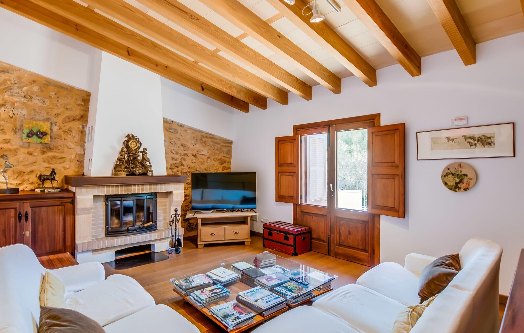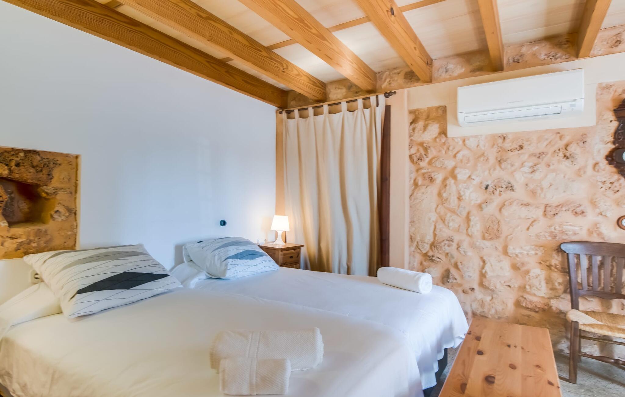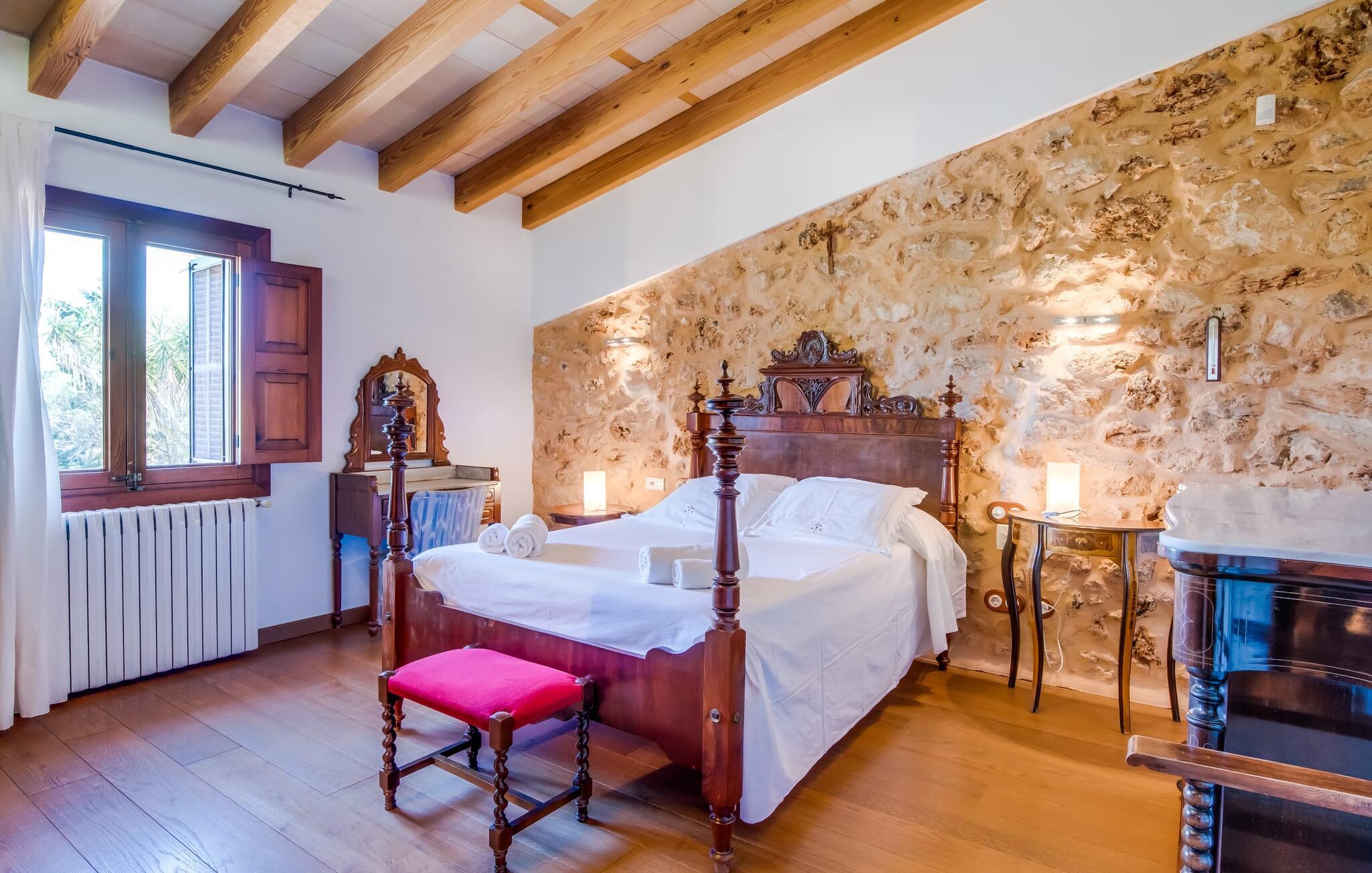 Hvis I vil have mere end blot at tilbringe jeres ferie på Mallorca; Hvis I også vil nyde den typiske mallorcanske charme, er I kommet til det rigtige sted i villaen "Torre d'en Huc". Både inde og ude har ejerne lagt stor vægt på, at ølivets oprindelige karakter ikke blot bevares, men også blandes med moderne elementer. Og hvad er slutresultatet? En stor ejendom, hvis sans for detaljer altid minder jer om, hvor I er. Her og der på væggene kan man finde redskaber, der minder om øboernes hverdag, før Mallorca blev opdaget som turistmål, hvor landbruget dominerede landskabet. I dag står dørene åbne for gæster, der sætter pris på autentisk stil. Alt her er blevet restaureret med stil; Når I træder ind i ejendommen, bliver I mødt af en stor gårdhave, hvor I vil finde jeres første valg af komfortable siddepladser ved siden af et springvand. Nu er I forkælet med valg med hensyn til, hvor I skal slappe af i solen, der er så mange at vælge imellem. En overdækket terrasse, en terrasse på første sal, et lille rum under svajende grene, stenbænke langs en mur og poolområdet. Beplantningen varieres uden at fremstå kunstig eller "planlagt og designet" på nogen måde. Takket være denne vellykkede balancegang, er I garanteret at tilbringe mange dejlige timer i den friske luft og føle en følelse af afslapning, der kun er mulig, når den mest gennemprøvede opskrift på en vellykket ferie er sammensat: Tag ind i en ejendom fyldt med karakter, drømmende, idyllisk sted, hvor I næsten kan læse jeres sind og derefter være tilgængelig for at opfylde alle jeres ønsker; Tilføj lækre grillspecialiteter og stimulerende samtale. Top det hele af med endeløse sommeraftener afkølet af en mild brise. På et tidspunkt vil I endelig trække jer tilbage til villaen - og så har I så meget desto mere grund til at ånde et suk af tilfredshed. Det samme gør sig gældende for interiøret: sans for detaljer, udsøgte møbler, autentiske genstande fra villaens begivenhedsrige fortid og moderne kunstform en så fremragende blanding, at I helt sikkert vil bruge lidt mere tid i en af de to hyggelige stuer eller i den rustikke Pejs i indgangspartiet, før man for alvor skal kalde det en dag. Dette hus er perfekt udstyret til større grupper - især da alle fem dobbeltværelser (fire af dem med eget klimaanlæg) har eget badeværelse med en enkelt undtagelse. En af dem har endda svømmehallens lillebror, et smukt badekar (vil I også have saltvand her, skal I selv hente det fra havet). Fra stuen fører en trappe til en mezzanin, hvor der er noget fitnessudstyr til at holde jer i form under jeres ophold. I mellemtiden vil yngre gæster nyde den næsten livstore legetøjshest, der stolt står her. Her er også to enkeltsenge; Den hulelignende natur på dette åbne område gør det særligt velegnet til ældre børn, der er mindre bekymrede for privatlivets fred. Der er yderligere tre soveværelser ovenpå - hvoraf det ene har adgang til den førnævnte terrasse på første sal med liggestole, siddepladser og planter. Dette er det perfekte sted til jeres morgenkop kaffe! Og måske for at planlægge, hvad I vil udforske og opdage i dag. Villaens bekvemme beliggenhed giver mange muligheder for dette. På trods af sin afsides beliggenhed - som er en lettelse for ørerne og nervesystemet - er Algaida kun 10 minutter væk til hverdagens væsentlige ting. Om fredagen er det værd at besøge det farverige ugentlige marked på "Sa Plaza" og nyde en spadseretur efterfulgt af en lækker Café Cortado. For kultur, strande og shopping tag til Palma med sin smukke katedral kun 30 minutter væk. Den solbeskinnede bugt Cala Pi i den sydlige del af øen kan nås på 40 minutter. Golfentusiaster er i gode hænder i Son Gual, kun 15 km væk, hvor de kan arbejde på deres handicap og se frem til at tage hjem sidst på dagen - når alt kommer til alt, vil I i hele jeres ferie være beboere i en virkelig storslået villa. Villaen "Torre d'en Huc" er en stor ejendom, hvor de endda holder heste. Masser af rustik charme, et traditionelt præg og moderne accenter mødes i en smuk, landlig, afsides beliggenhed nær byen Algaida og sikrer en meget speciel ferieoplevelse. Til hverdagsindkøb er Algaida kun 10 minutter væk. Øens hovedstad Palma, med sine mange indkøbs- og fritidsmuligheder samt adgang til havet, ligger kun 30 minutter væk i bil.