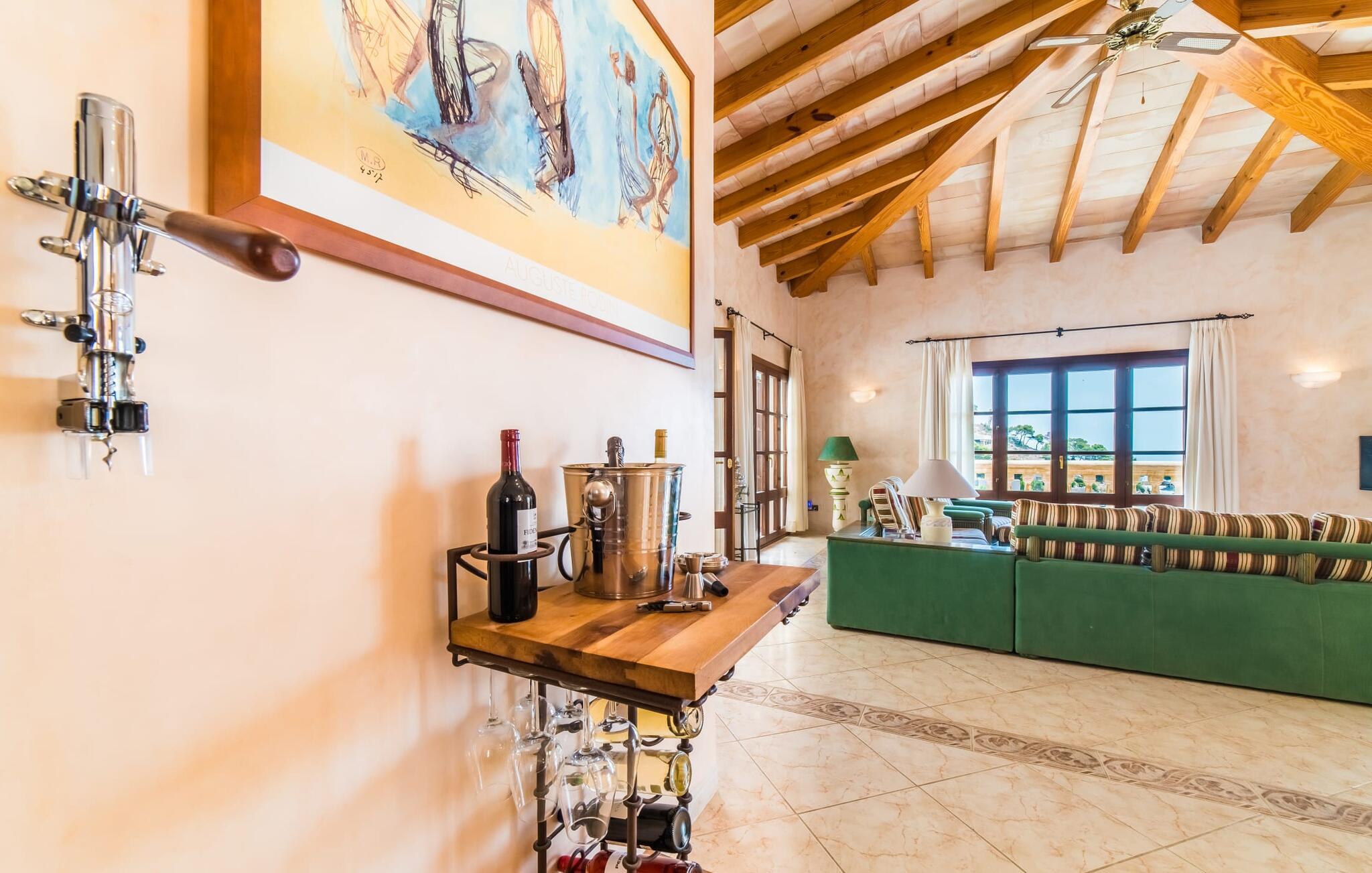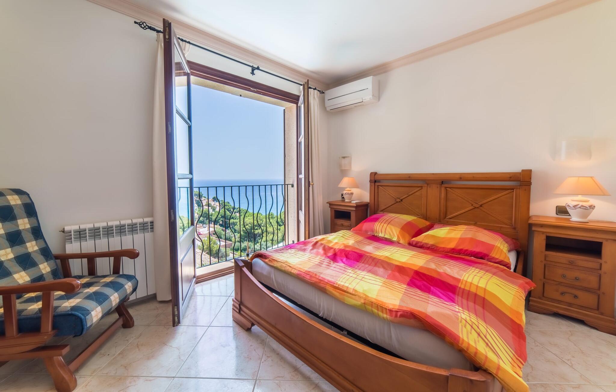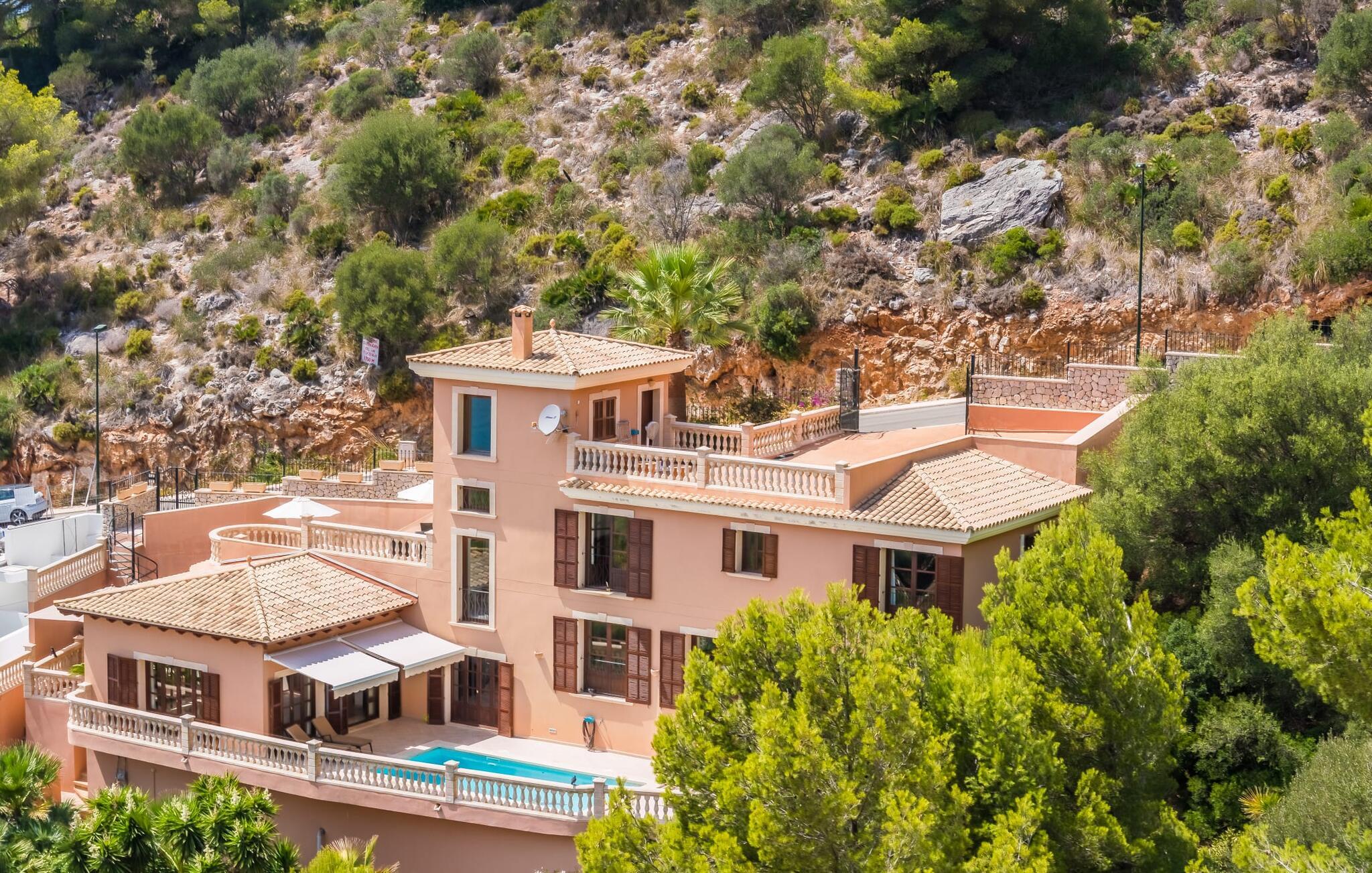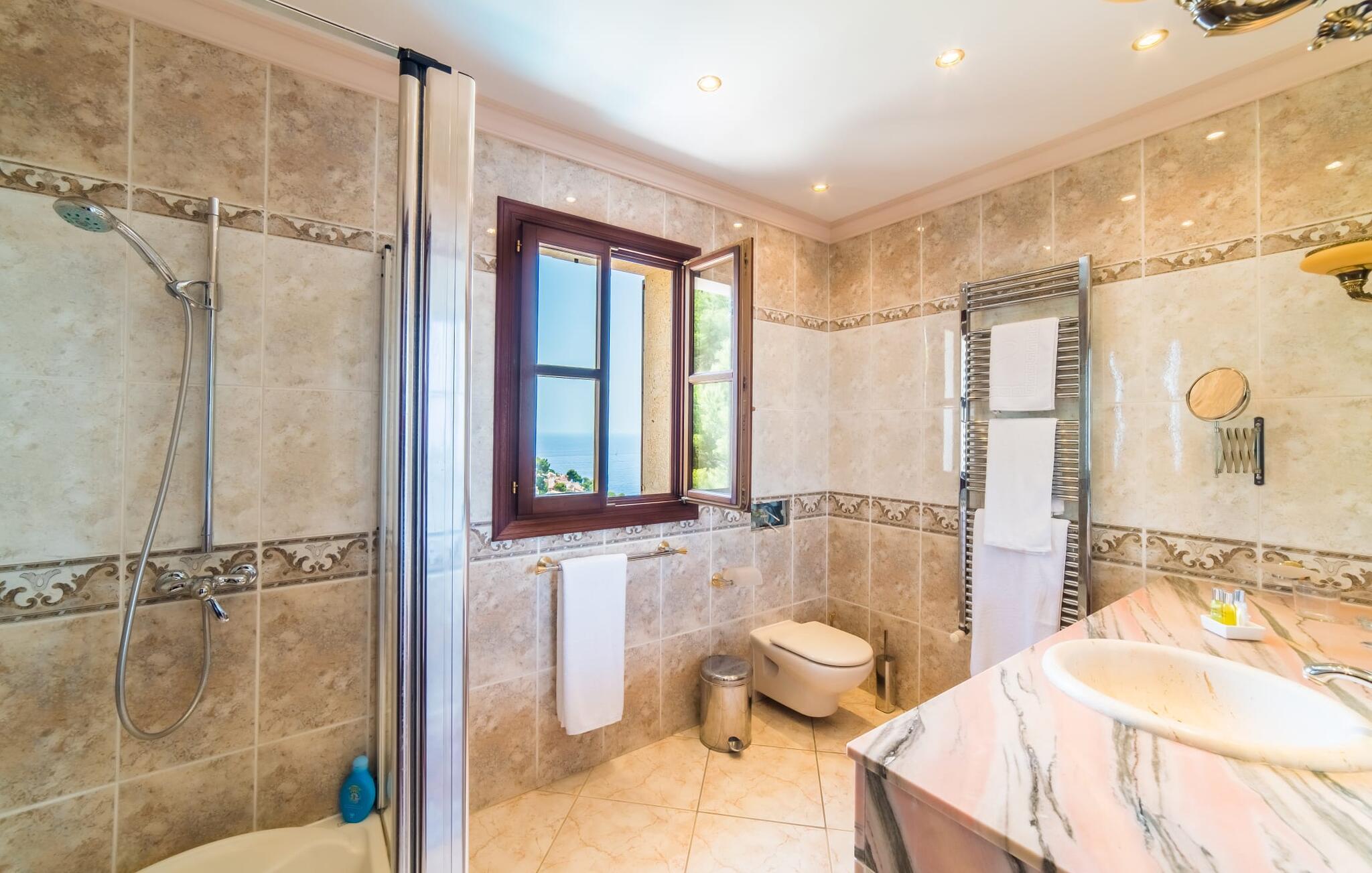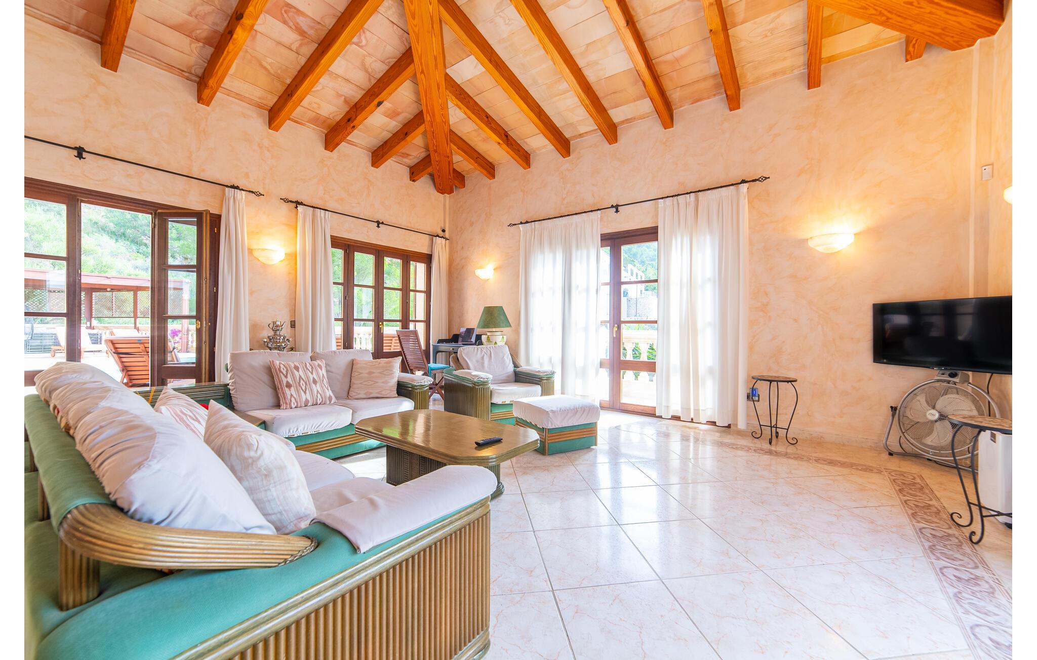 Villaens hjerte er en rummelig, lys stue med integreret, fuldt udstyret køkken, som giver direkte adgang til pool og grillterrasse. Der er også et gæstebadeværelse på denne etage. Gå op ad den udvendige vindeltrappe til det øverste niveau og find et luksuriøst soveværelse med havudsigt med eget badeværelse. På næste etage er der yderligere tre soveværelser med dobbeltsenge, et med en-suite badeværelse og to med et fælles badeværelse, alle udstyret med træmøbler og generøst udstyret.