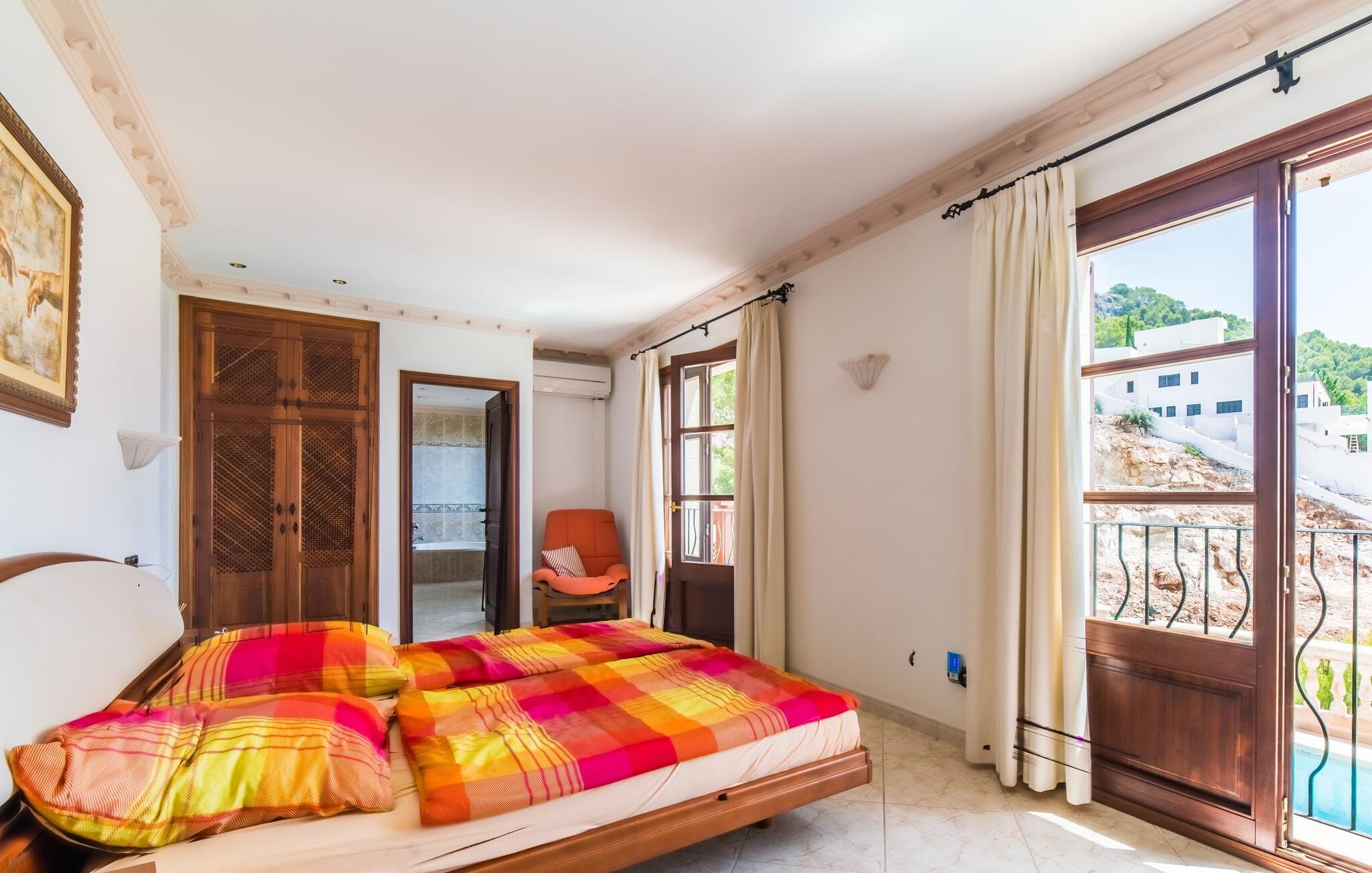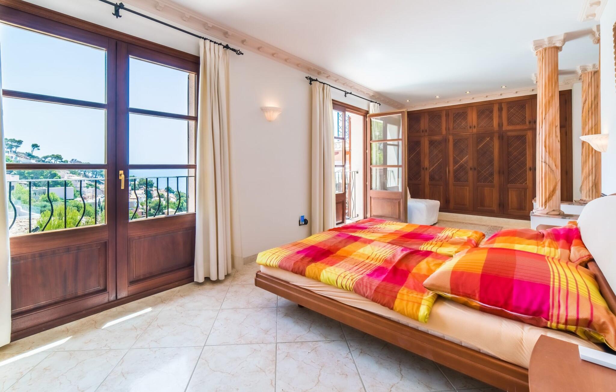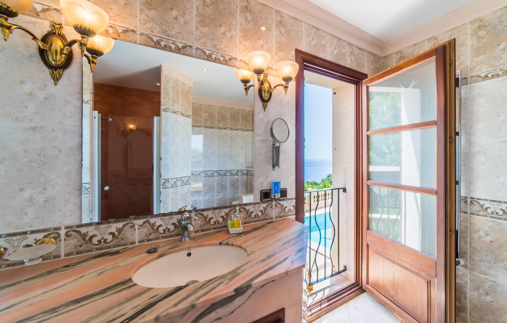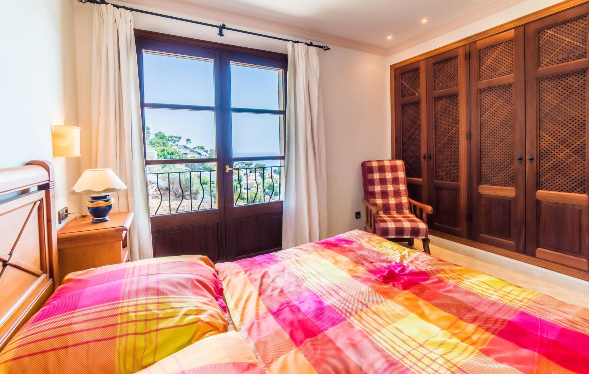 Villaens hjerte er en rummelig, lys stue med integreret, fuldt udstyret køkken, som giver direkte adgang til pool og grillterrasse. Der er også et gæstebadeværelse på denne etage. Gå op ad den udvendige vindeltrappe til det øverste niveau og find et luksuriøst soveværelse med havudsigt med eget badeværelse. På næste etage er der yderligere tre soveværelser med dobbeltsenge, et med en-suite badeværelse og to med et fælles badeværelse, alle udstyret med træmøbler og generøst udstyret.