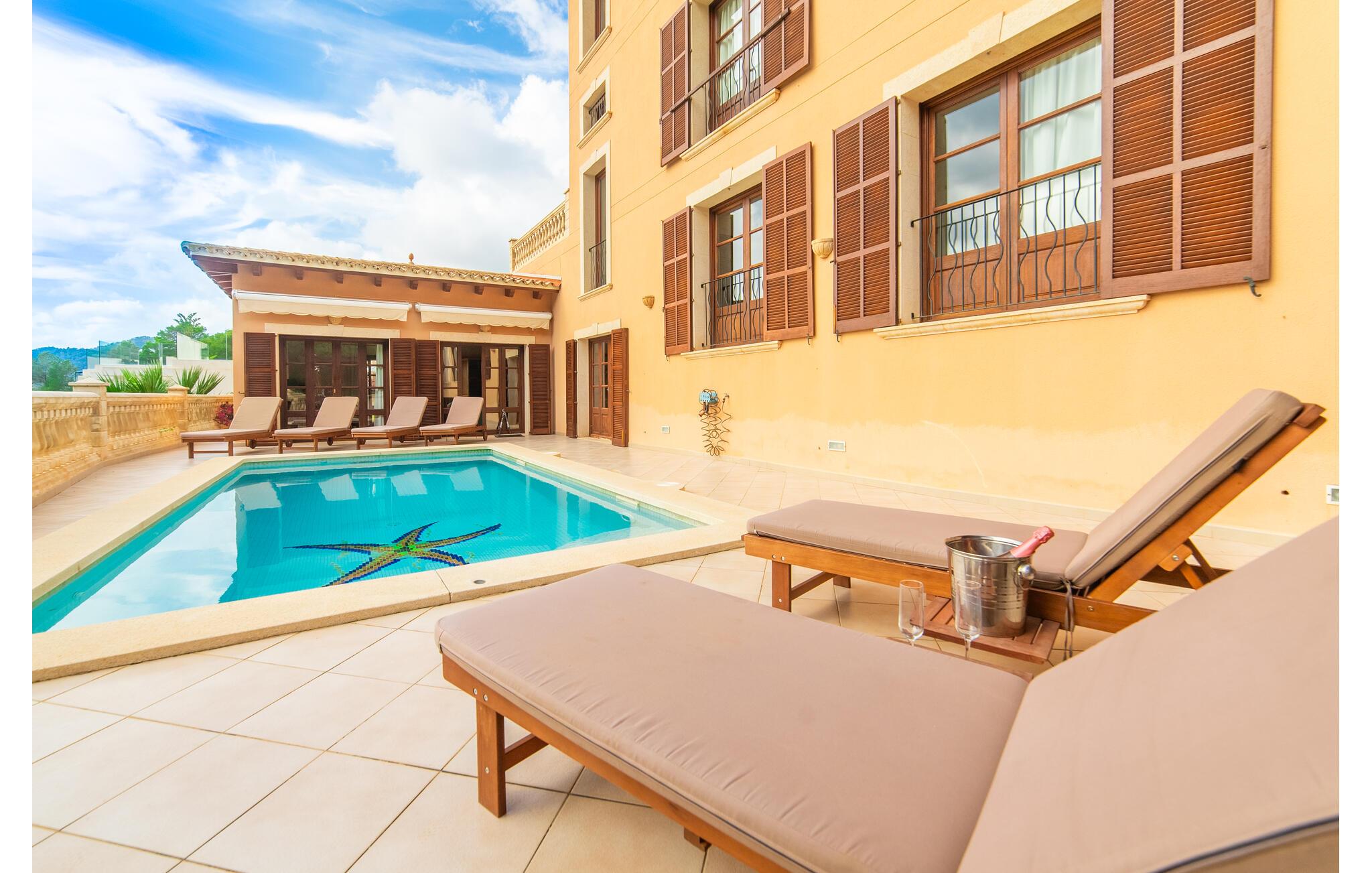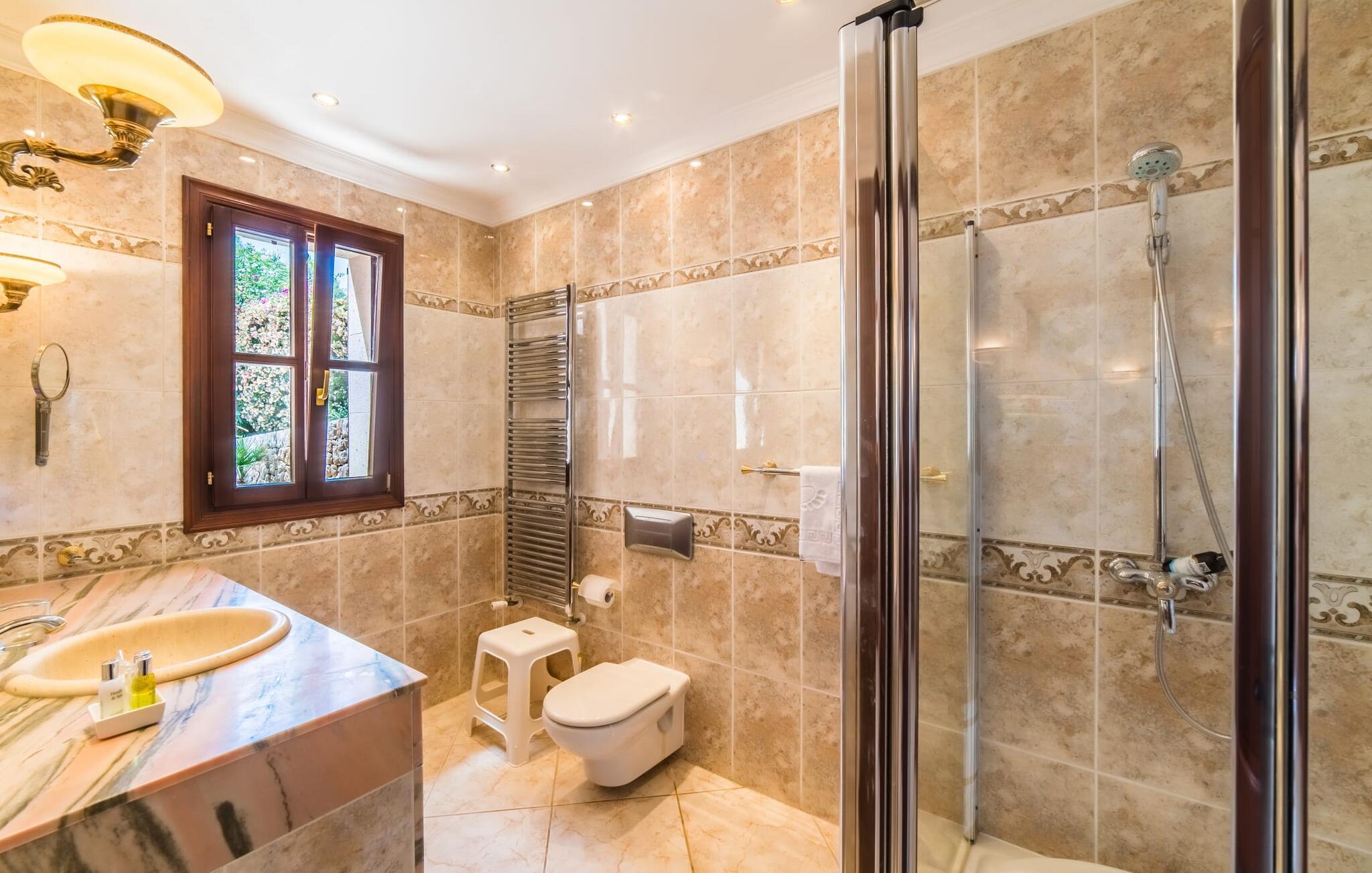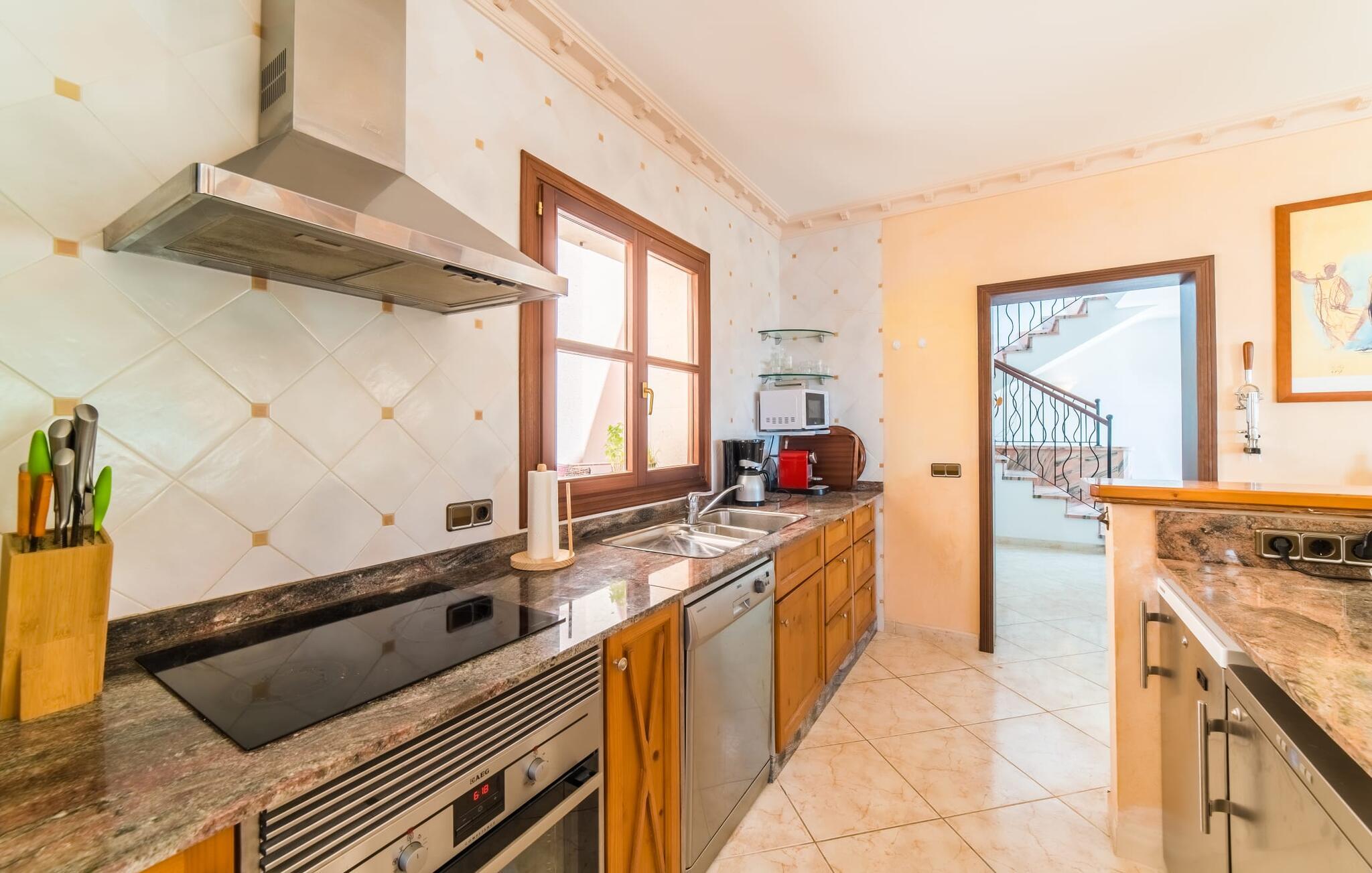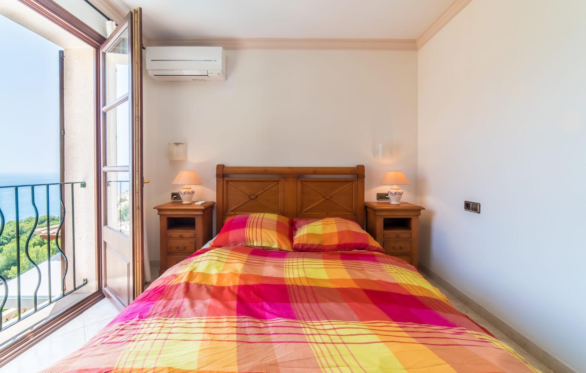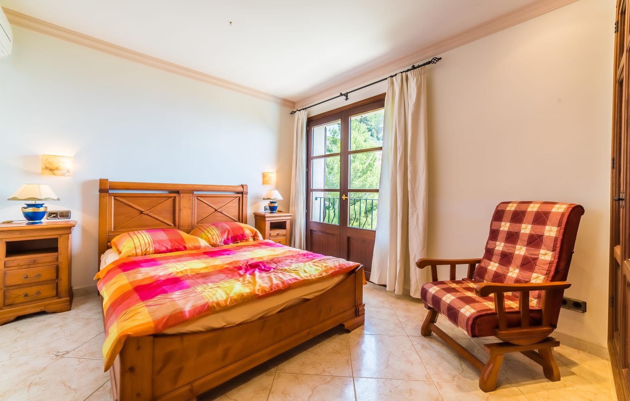 Villaens hjerte er en rummelig, lys stue med integreret, fuldt udstyret køkken, som giver direkte adgang til pool og grillterrasse. Der er også et gæstebadeværelse på denne etage. Gå op ad den udvendige vindeltrappe til det øverste niveau og find et luksuriøst soveværelse med havudsigt med eget badeværelse. På næste etage er der yderligere tre soveværelser med dobbeltsenge, et med en-suite badeværelse og to med et fælles badeværelse, alle udstyret med træmøbler og generøst udstyret.