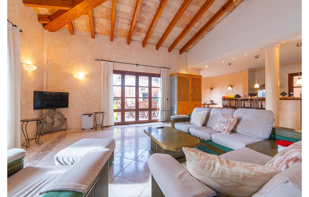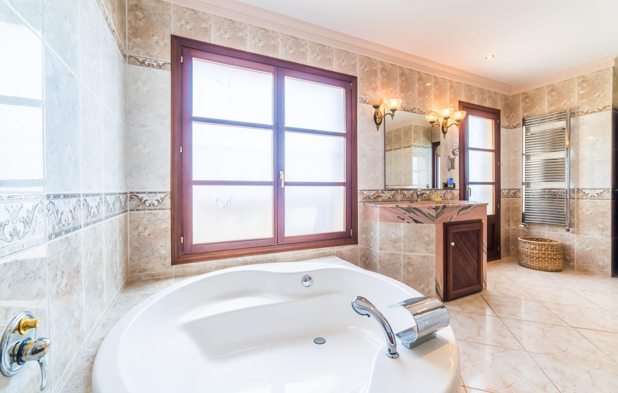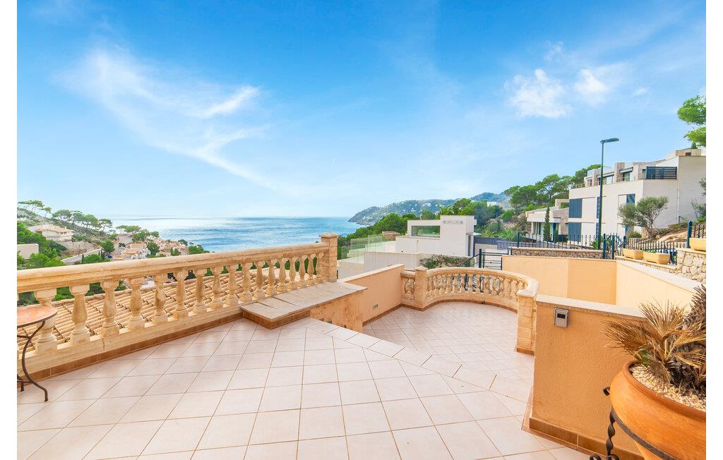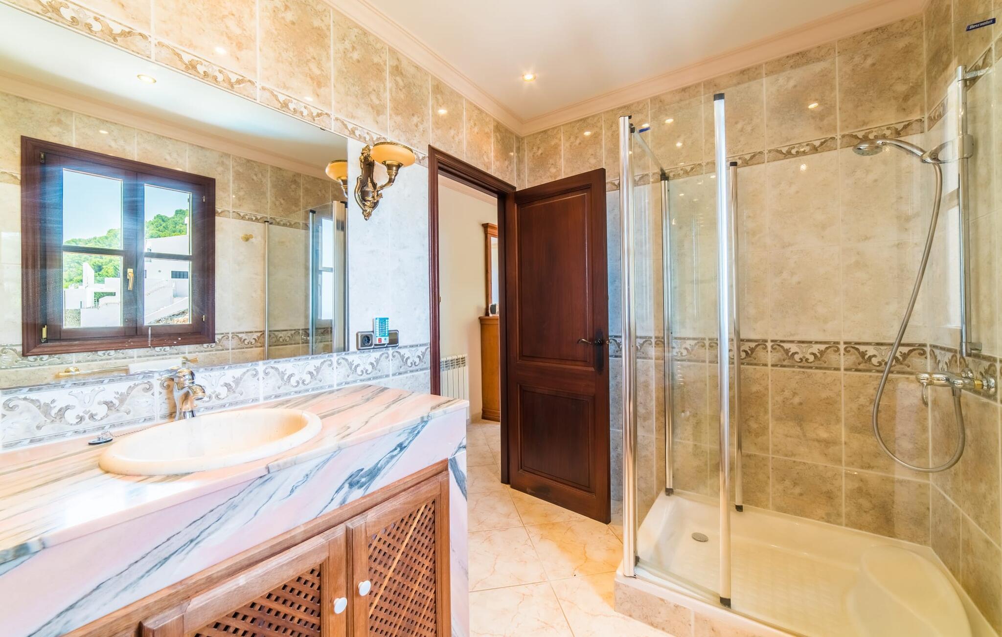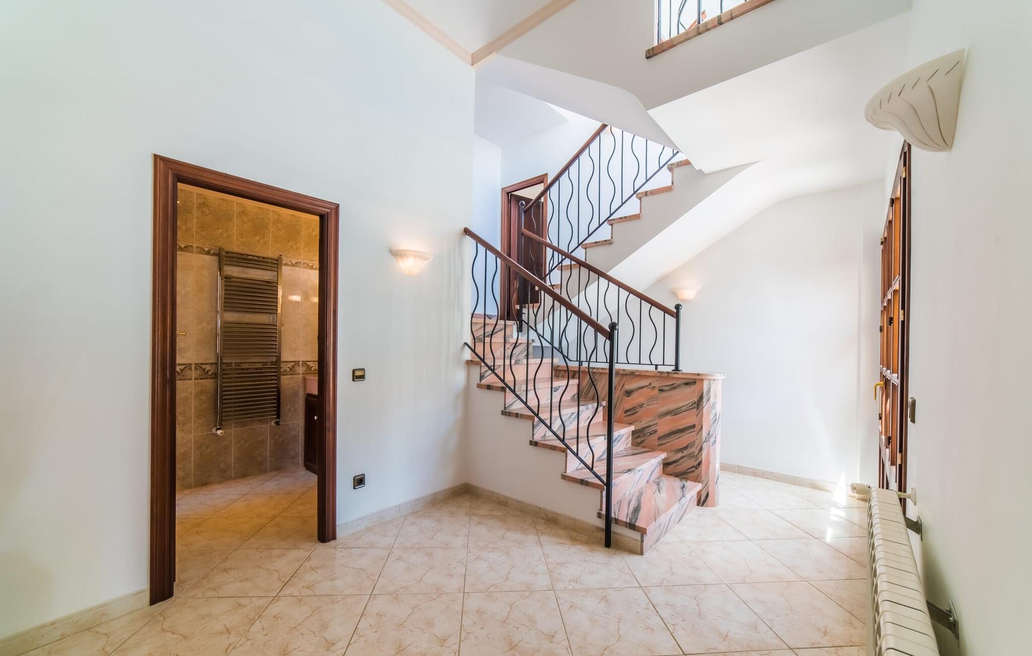 Villaens hjerte er en rummelig, lys stue med integreret, fuldt udstyret køkken, som giver direkte adgang til pool og grillterrasse. Der er også et gæstebadeværelse på denne etage. Gå op ad den udvendige vindeltrappe til det øverste niveau og find et luksuriøst soveværelse med havudsigt med eget badeværelse. På næste etage er der yderligere tre soveværelser med dobbeltsenge, et med en-suite badeværelse og to med et fælles badeværelse, alle udstyret med træmøbler og generøst udstyret.