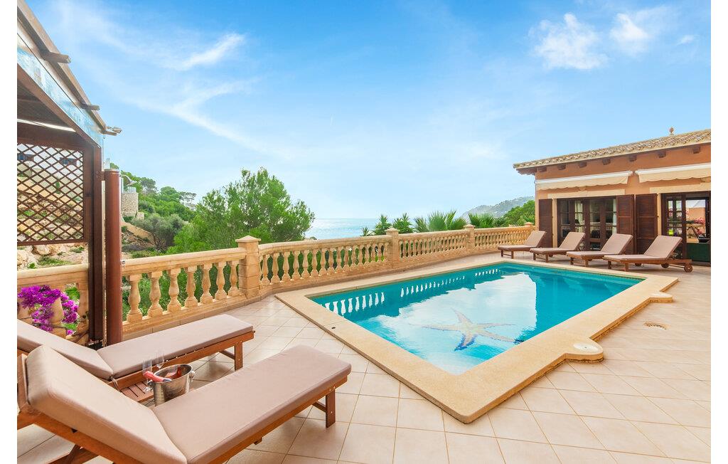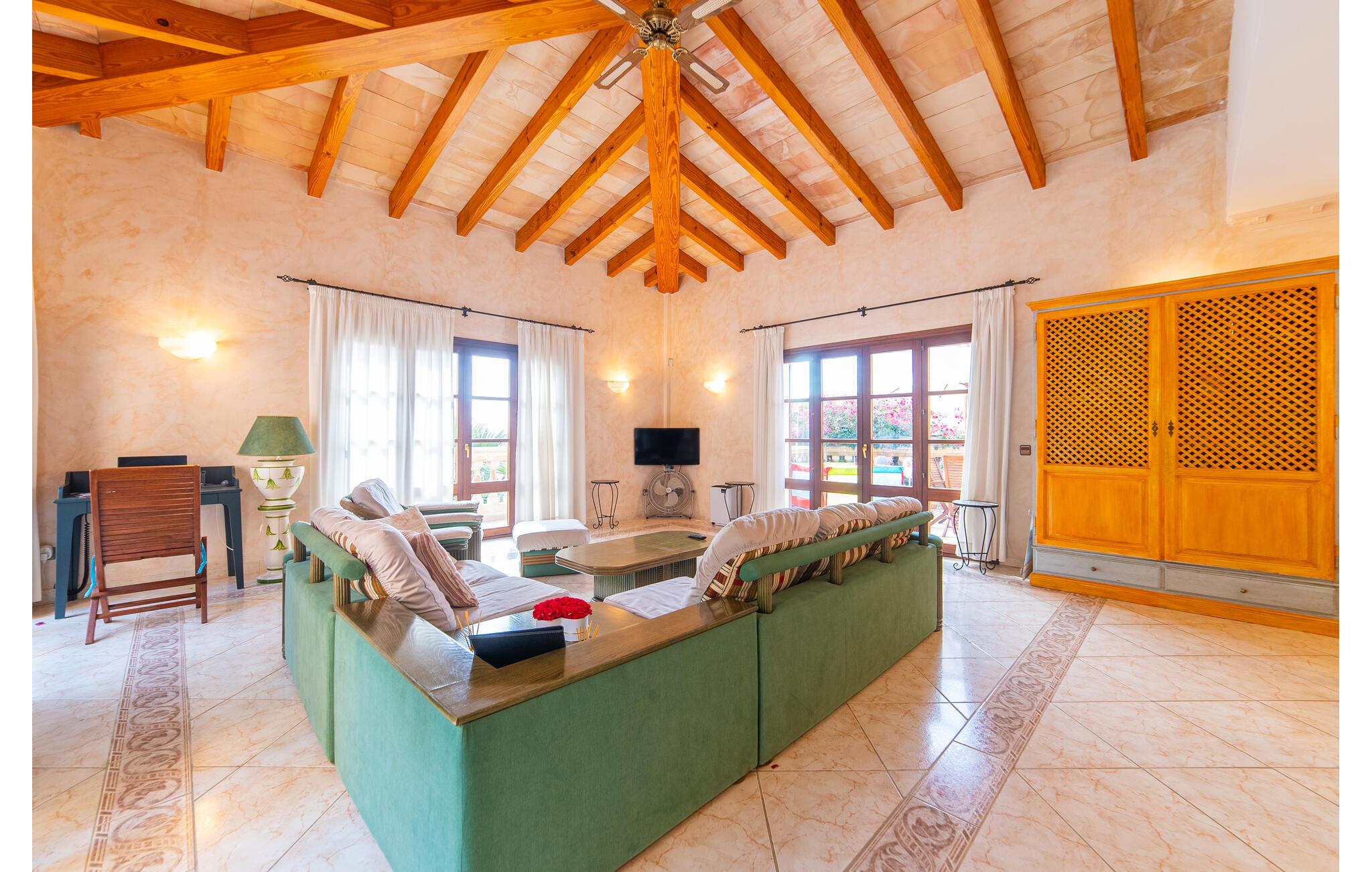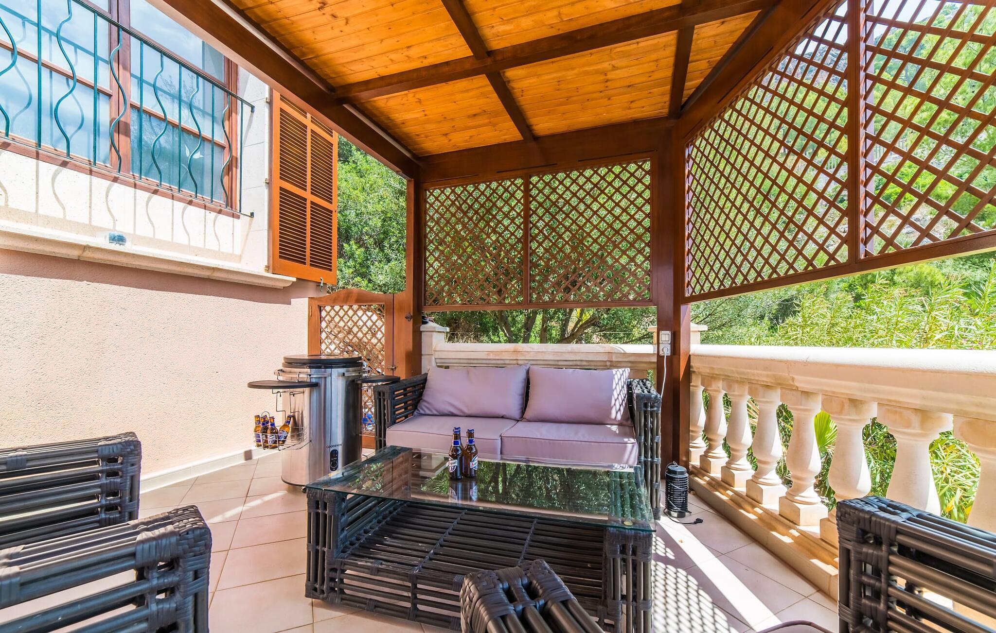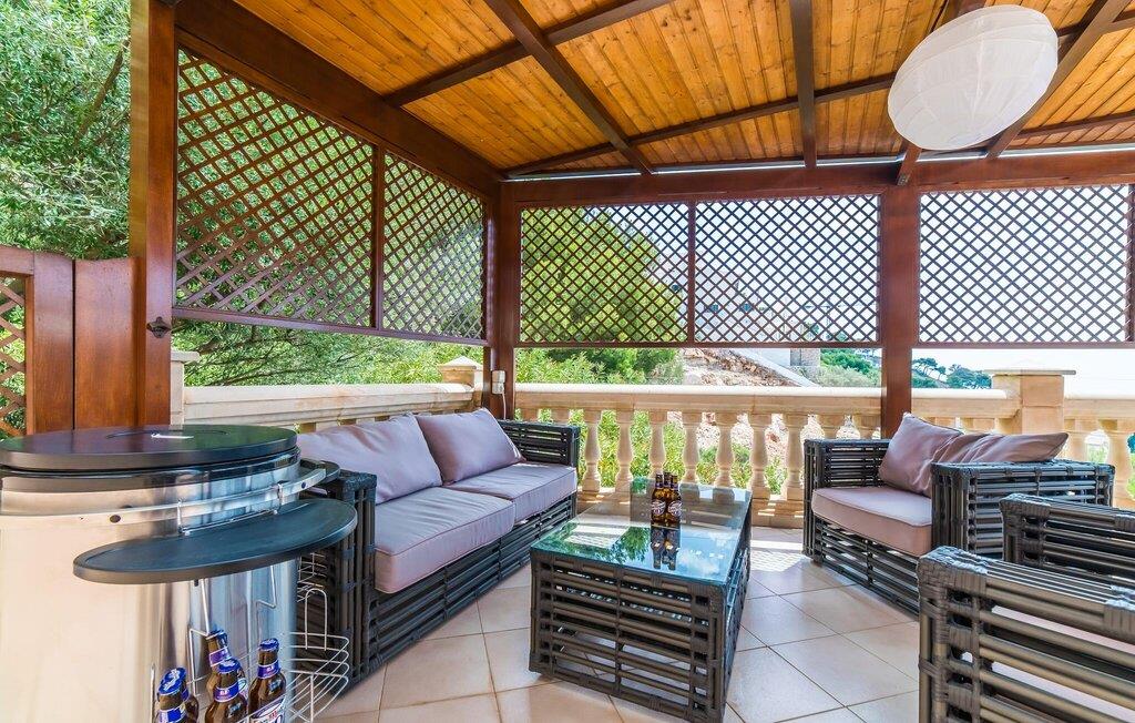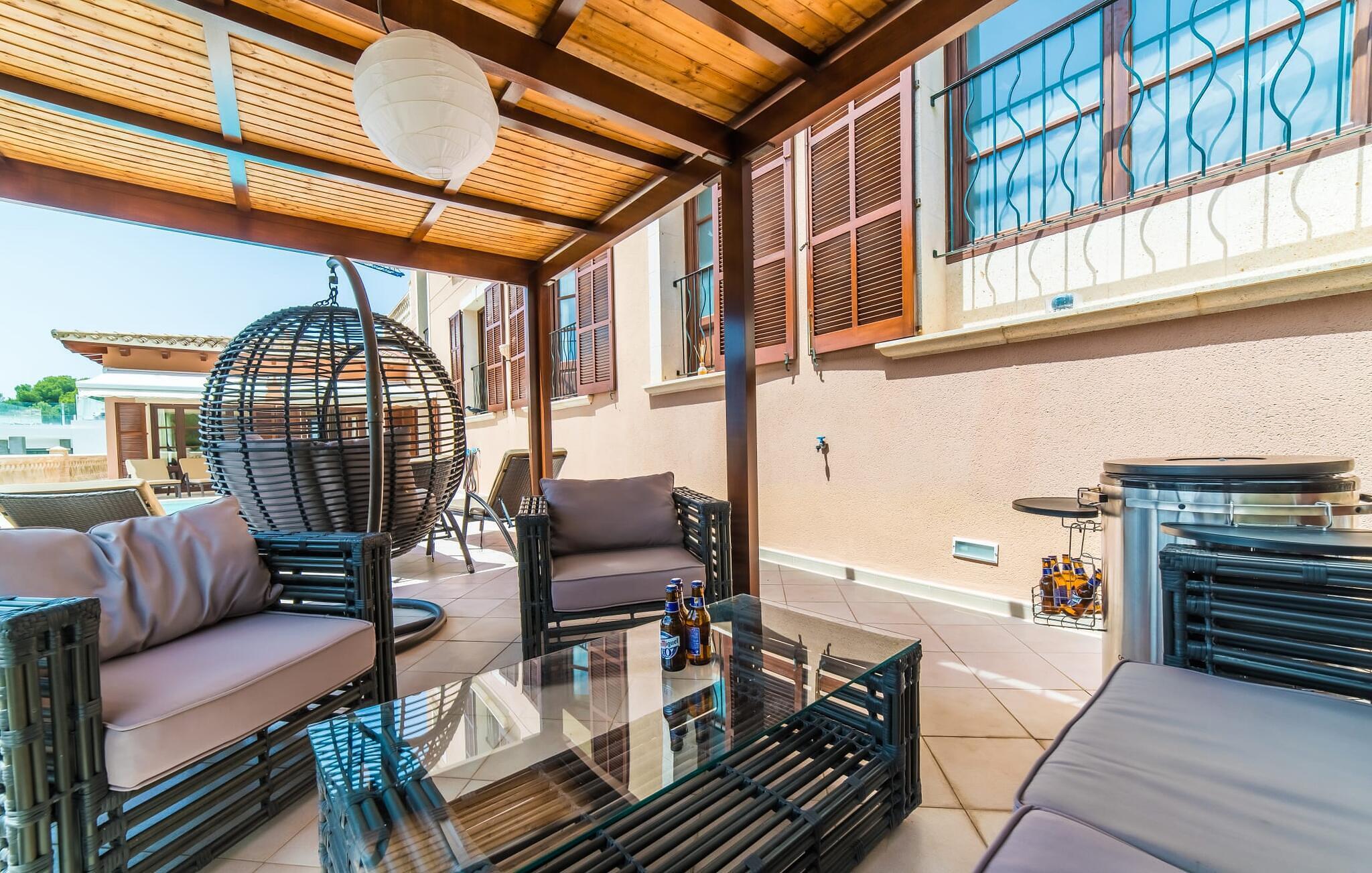 Denne skønne grund har et alsidigt udendørs rum, der giver gæsterne mulighed for at nyde solen eller skyggen, når de bevæger sig mellem terrasserne. Tag en forfriskende svømmetur i poolen, før I slapper af på liggestolene, eller hvis I føler jer energisk, kan I gå ned ad trappen til stranden.