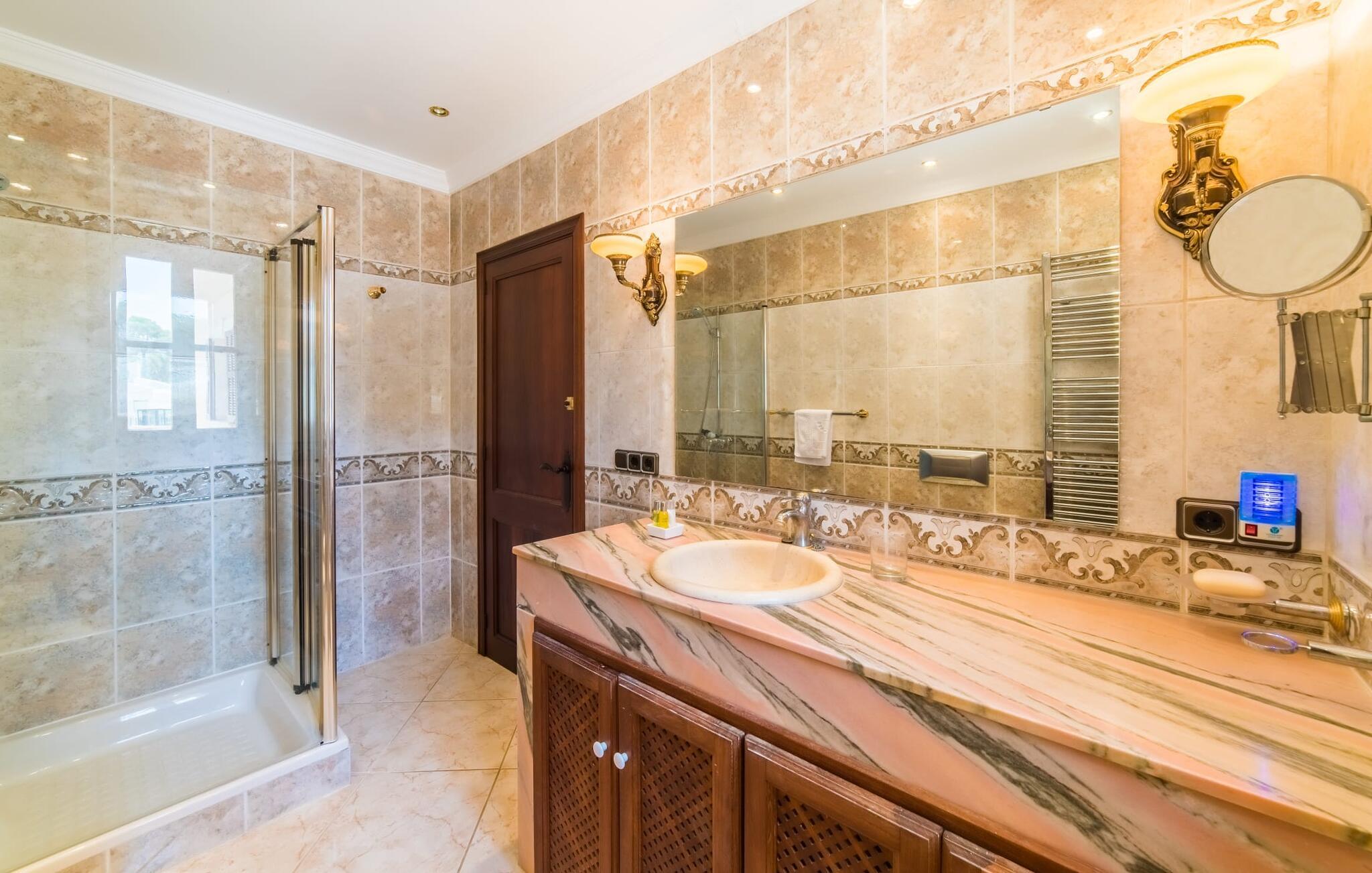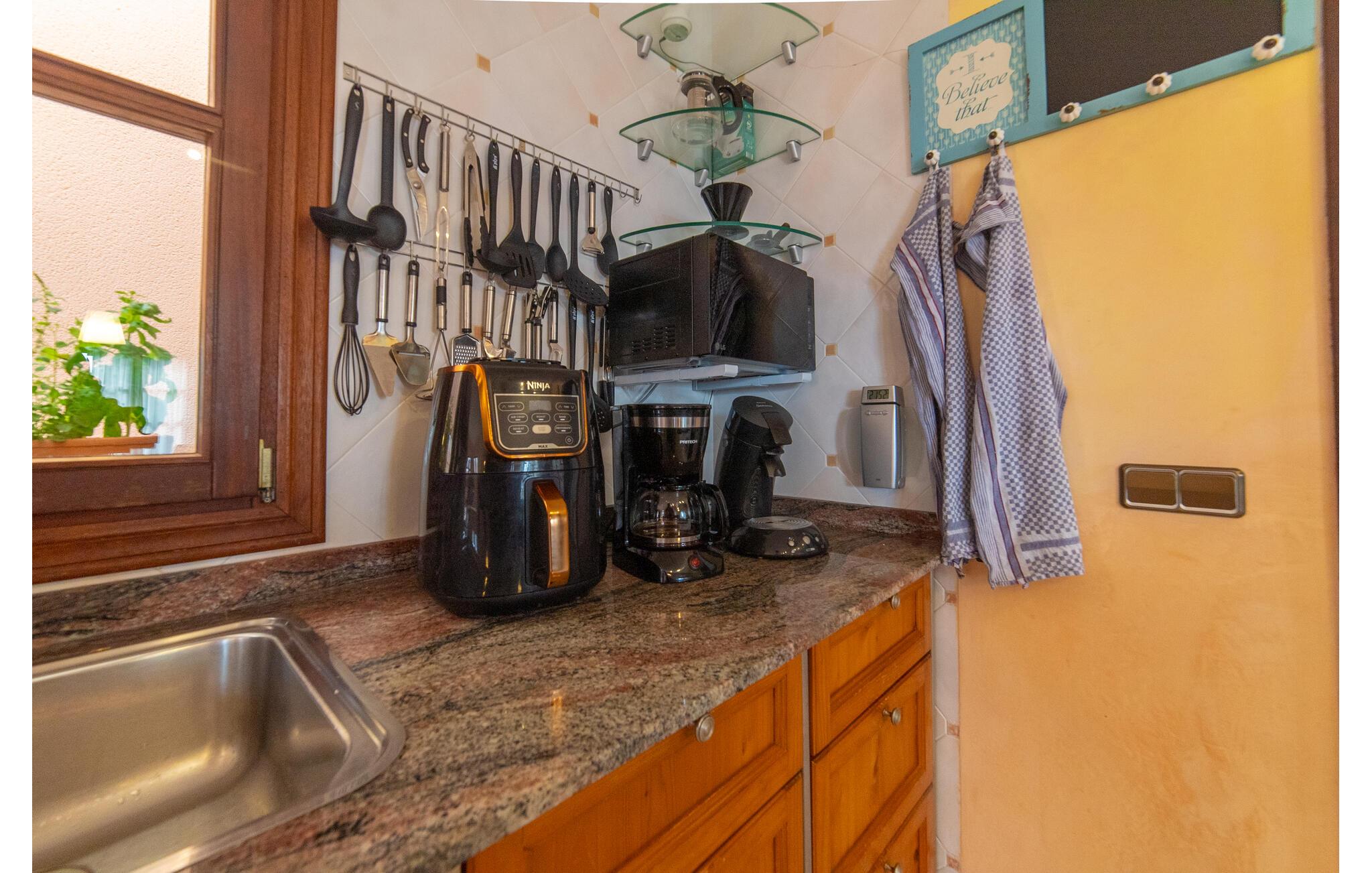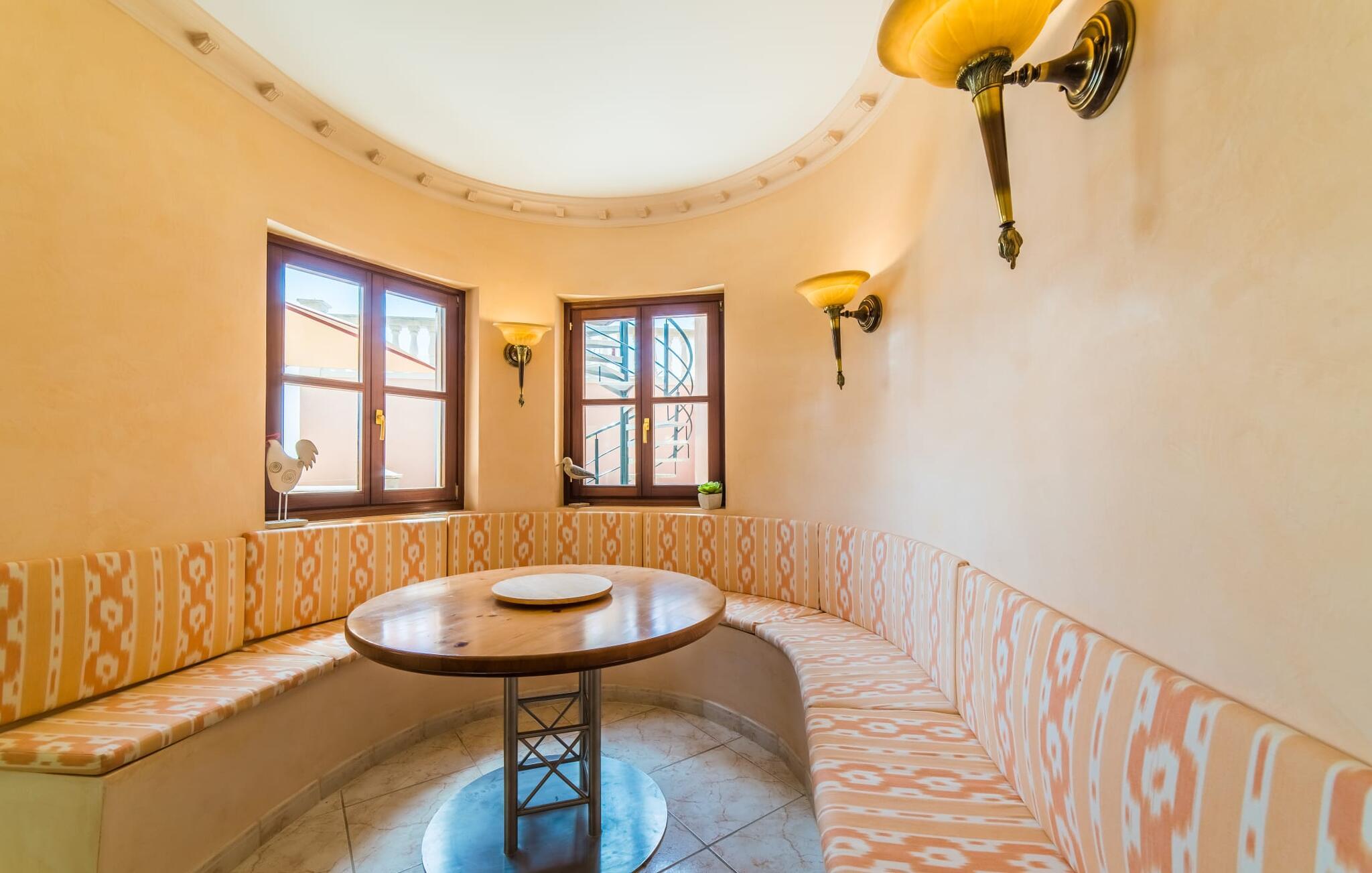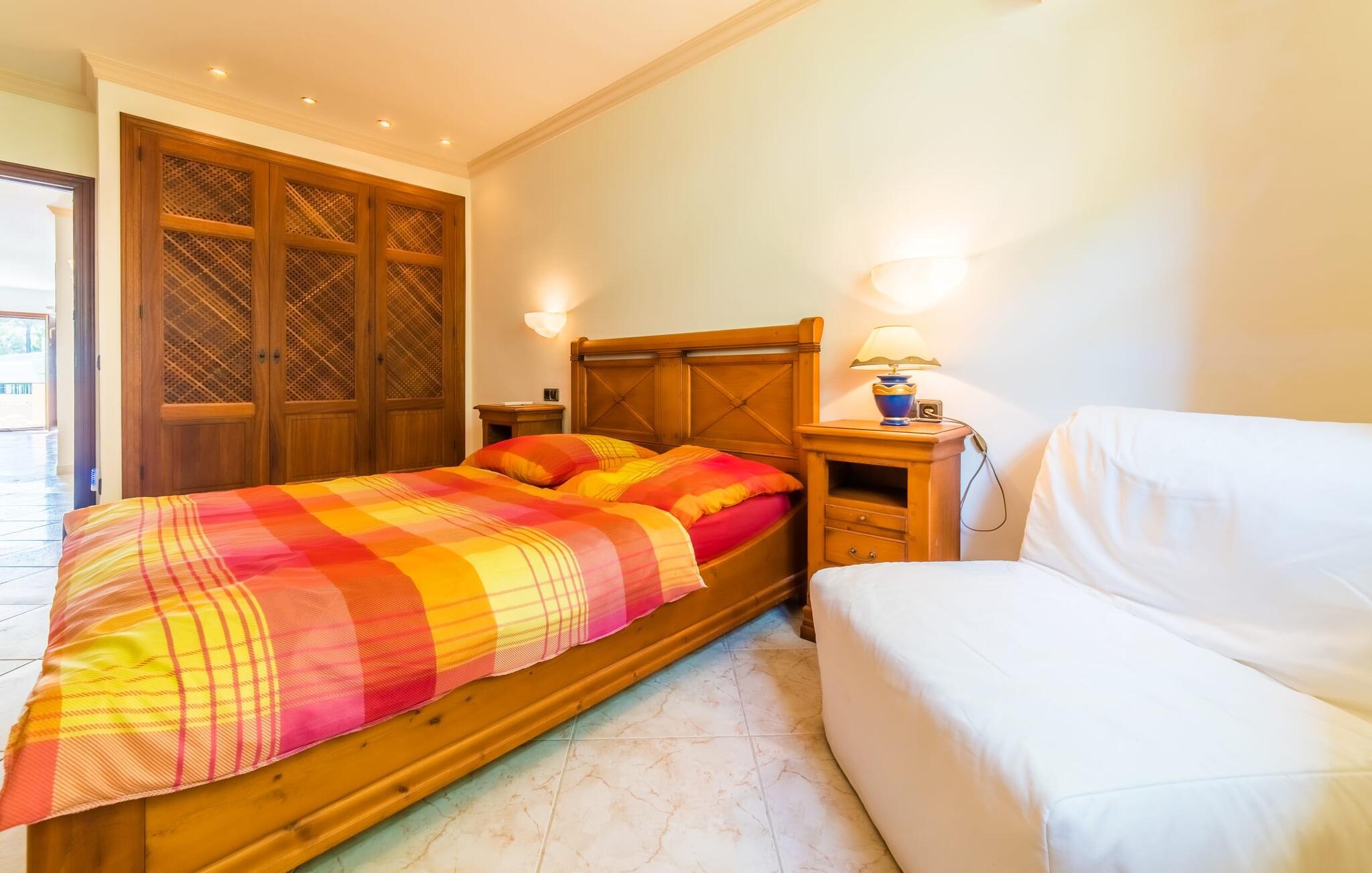 Denne skønne grund har et alsidigt udendørs rum, der giver gæsterne mulighed for at nyde solen eller skyggen, når de bevæger sig mellem terrasserne. Tag en forfriskende svømmetur i poolen, før I slapper af på liggestolene, eller hvis I føler jer energisk, kan I gå ned ad trappen til stranden.