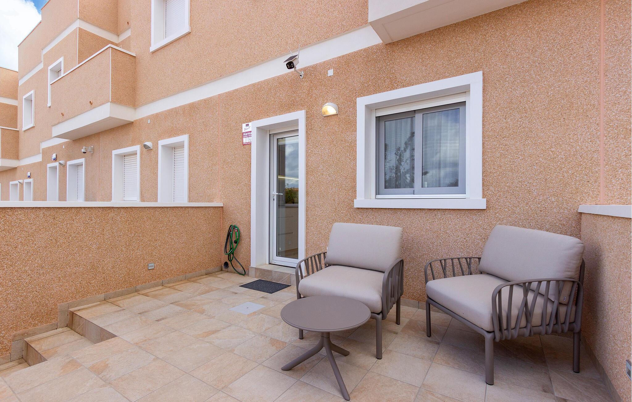 De private terrasser, både i stueetagen og på øverste etage, er perfekte til fælles måltider eller afslapning. Begynd dagen med en friskbrygget kaffe og nyd de smukke solopgange, der giver jeres ferie en magisk begyndelse. Tag en forfriskende dukkert i den store fælles pool eller gå en kort tur til Middelhavet for en badeoplevelse ved de kridhvide sandstrande.