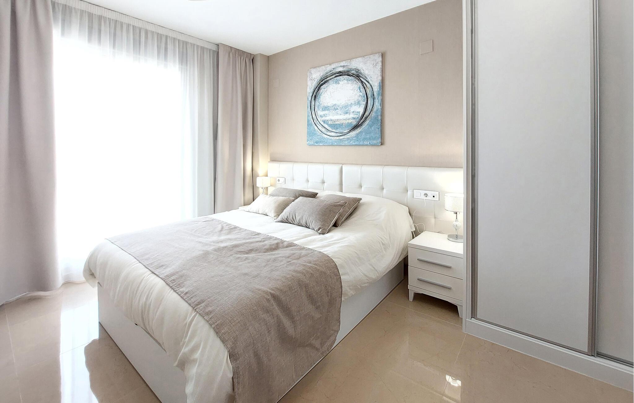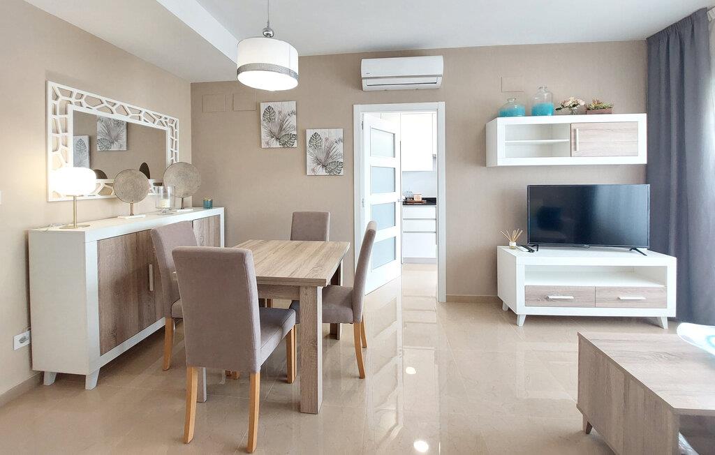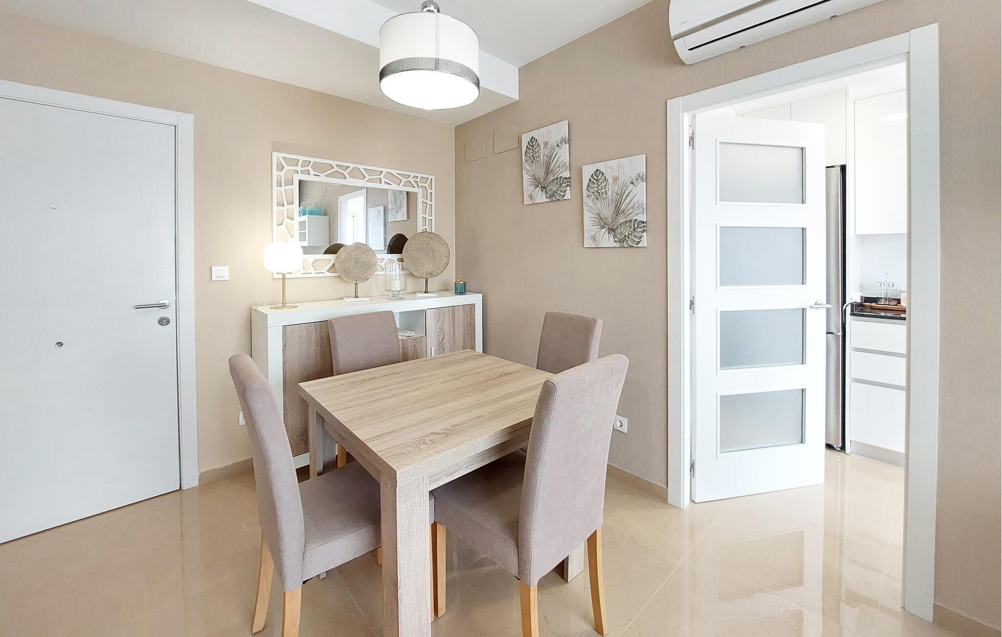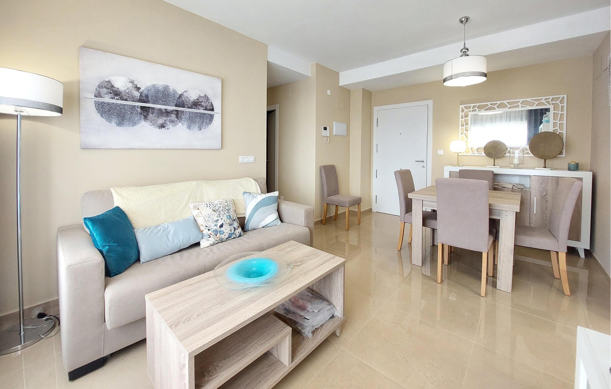 Lyse og hyggelige rum lægger op til en afslappende pause ved havet i denne smagfulde lejlighed. Varme farver og komfortable møbler skaber en beroligende atmosfære, hvor I kan slappe af og nyde lækre måltider, spise og slappe af om aftenen med en god film.