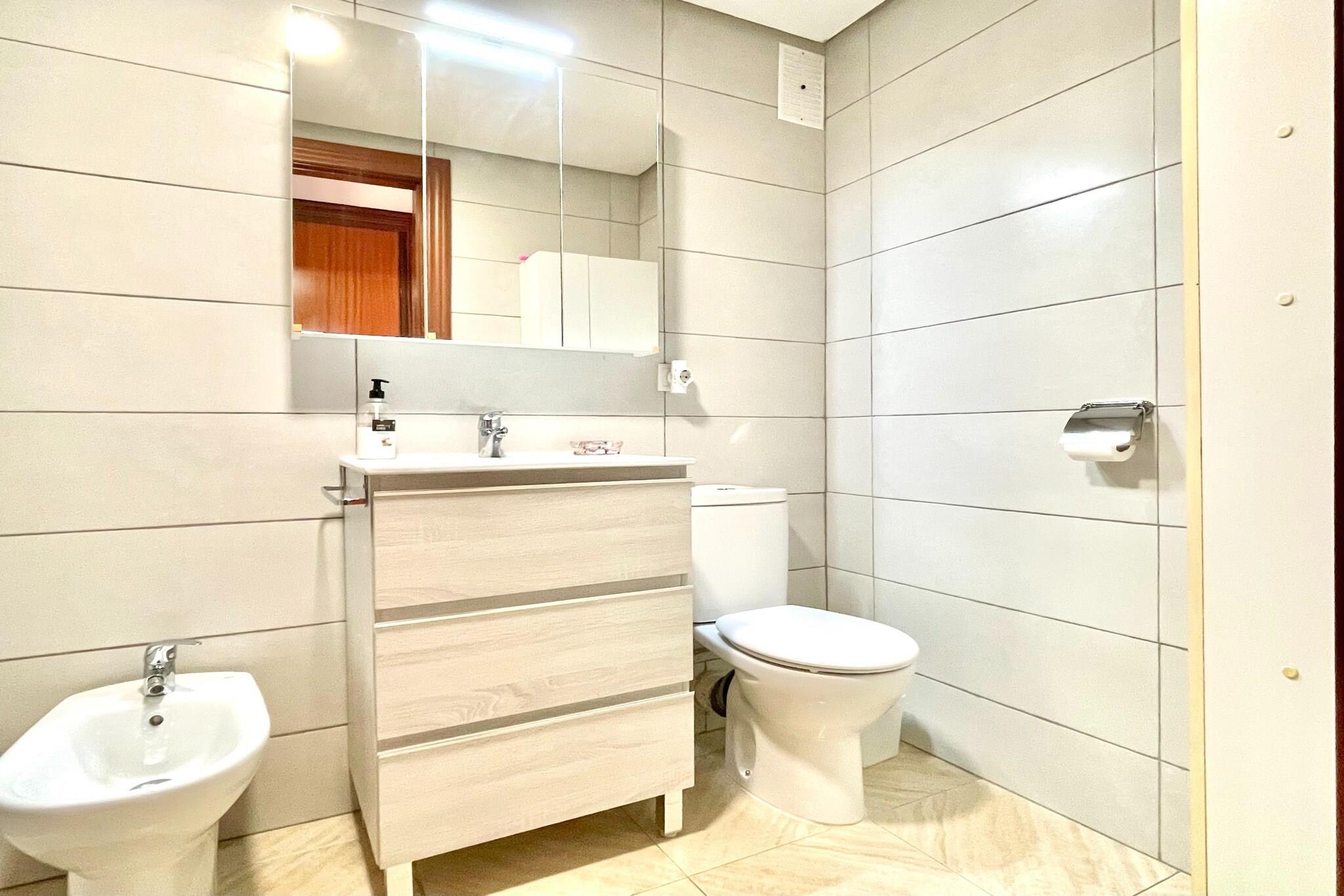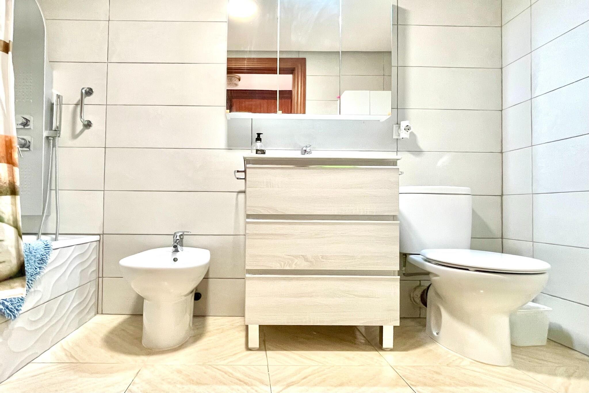 Stueetage: (Indgang (fælles indgang, adgang udefra), sofahjørne, elevator, elevator, elevator, elevator) På 5. etage: (Indgang , Køkken(kogeplade, brødrister, emhætte, kaffemaskine, ovn, mikrobølgeovn, køle-fryseskab, vaskemaskine), stue / spisestue(enkeltsovesofa, Fjernsyn(fladskærm), spisebord, sofahjørne), Soveværelse med badeværelse(dobbeltseng, badekar med bruser, håndvask, toilet, bidet, balkon eller terrasse), balkon eller terrasse, varme, klimaanlæg) have(deles med andre gæster), parking lot(public), swimmingpool(deles med andre gæster, udendørs, inkl. separat børne swimmingpool (maks. dybde 50 cm), opened from May upto and including Sep)