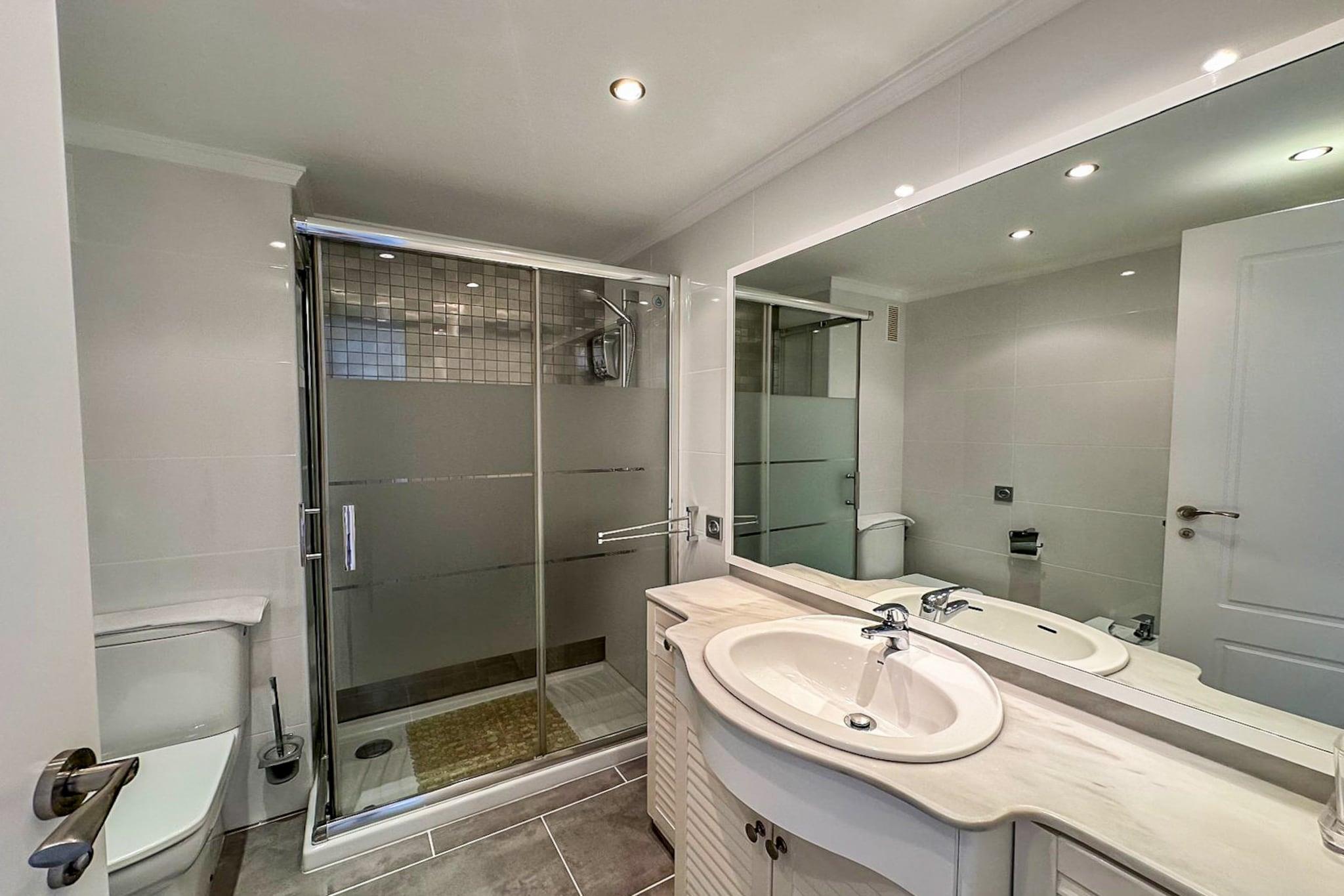 På 3. etage: (åbent køkken(elkedel, brødrister, kaffemaskine, mikrobølgeovn, køle-fryseskab, ), stue / spisestue(dobbeltsovesofa, Fjernsyn(Smart-TV), spisebord, sofahjørne), soveværelse(enkeltseng, enkeltseng), badeværelse(bruser), Internetadgang) , Internetadgang, tørretumbler, vaskemaskine, balkon, klimaanlæg, terrasse, havemøbler, swimmingpool(deles med andre gæster), strygejern, luft til luft-varmepumpe, føntørrer, Wine glasses