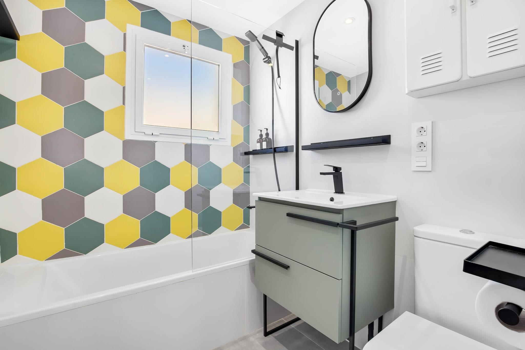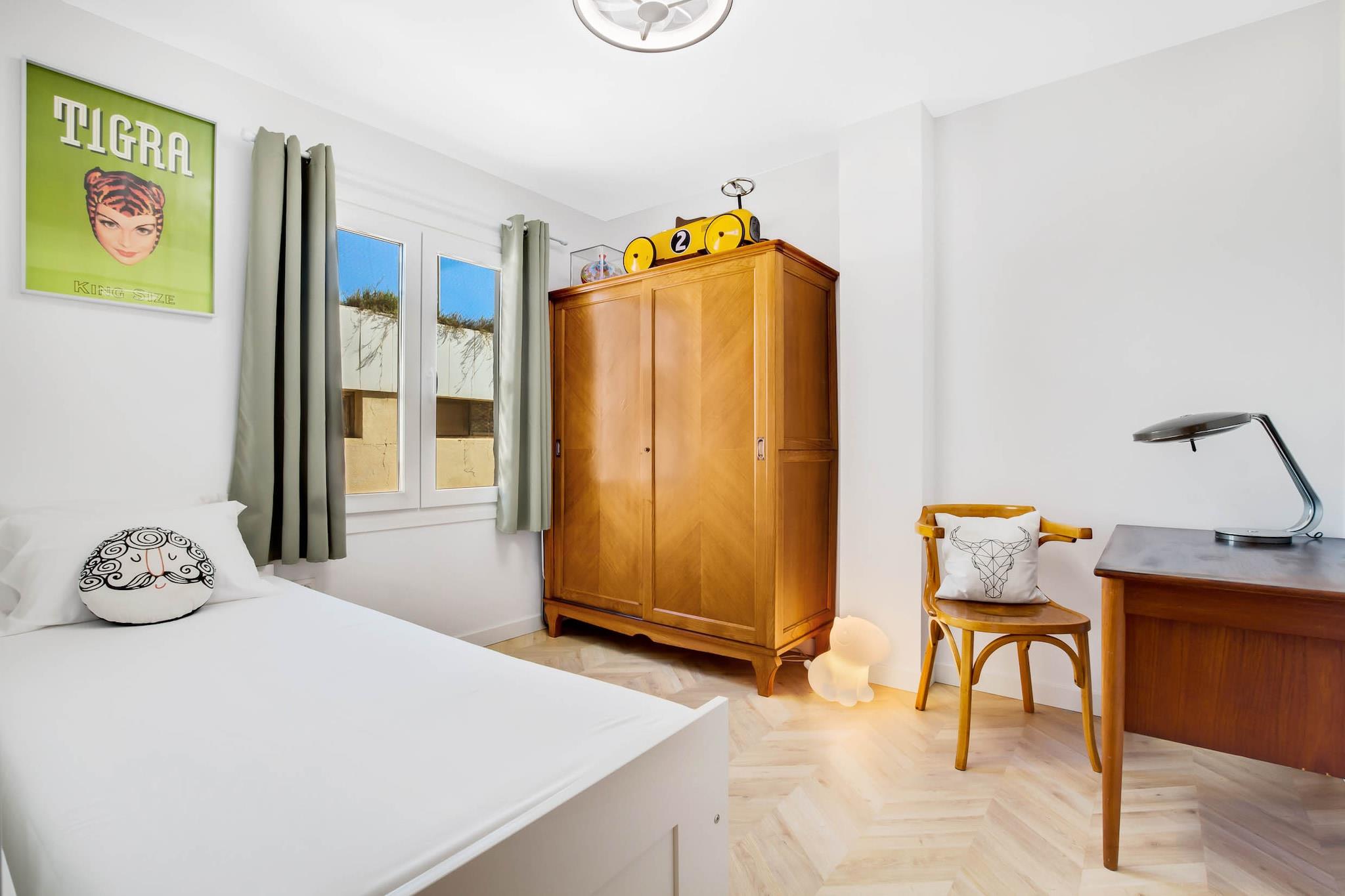 Forestil dig at starte dine morgener med havkysset luft og charmen fra en hvidkalket andalusisk landsby lige uden for din dør. Gemt væk i det fredelige Pueblo Blanco-kompleks er denne lejlighed med to soveværelser den perfekte kystferie for en familie på fire. Den er designet med komfort i tankerne og har et rummeligt soveværelse med dobbeltseng og et andet værelse med en funktionel køjeseng - ideelt til børn eller venner. Den åbne stue flyder problemfrit over i en hyggelig spisestue og et fuldt udstyret køkken, så du kan nyde rolige morgener eller tilberede hurtige måltider efter en dag ude. Træd ud på den solrige private terrasse, et perfekt sted at nippe til kaffe eller slappe af med en god bog. Boligen har alt det nødvendige: aircondition, højhastigheds-Wi-Fi, et Smart TV og en vaskemaskine - hvilket gør længere ophold nemme og stressfri. Den traditionelle arkitektur tilføjer en unik lokal karakter, mens de praktiske faciliteter sikrer moderne komfort under hele dit ophold. Kun en kort gåtur væk finder du Torremolinos' gyldne strande samt livlige restauranter, butikker og den naturskønne Paseo Marítimo. Familier kan udforske nærliggende attraktioner som Aqualand, Crocodile Park eller tage en dagstur til Malagas historiske centrum. Uanset om du er ude efter kulturelle opdagelser eller afslapning ved havet, har dette sted det hele - uden folkemængderne, men med masser af charme.