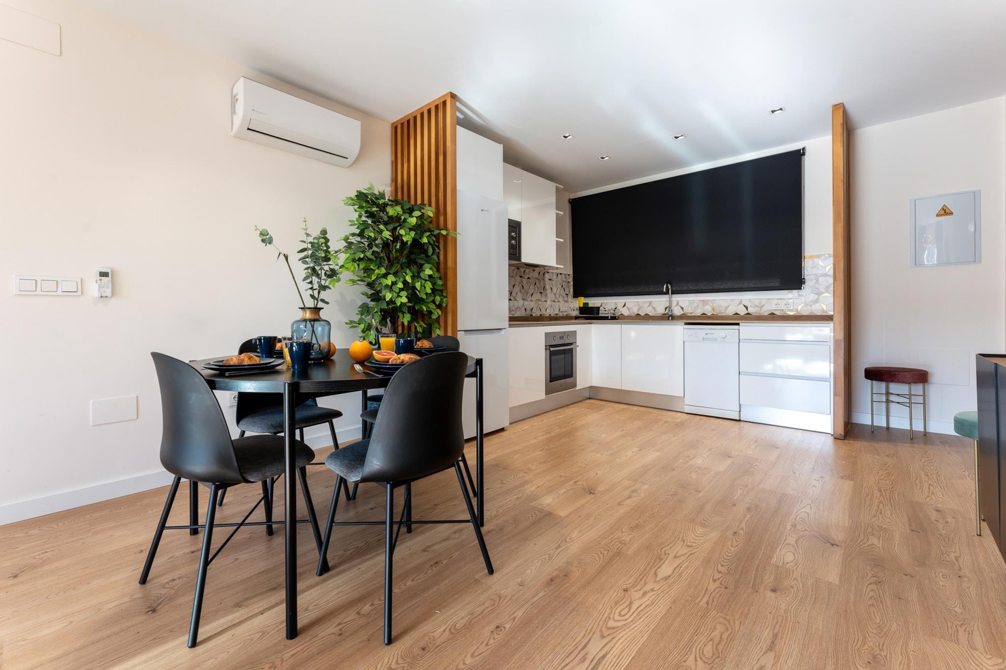 Stue(Fjernsyn, spisebord, sofahjørne, klimaanlæg), Køkken(kakkelovn, elkedel, brødrister, kaffemaskine, ovn, mikrobølgeovn, opvaskemaskine , køle-fryseskab), soveværelse(dobbeltseng, klimaanlæg), soveværelse(enkeltseng, enkeltseng, klimaanlæg), badeværelse(bruser, toilet), Håndklæder/sengelinned (inkl.)