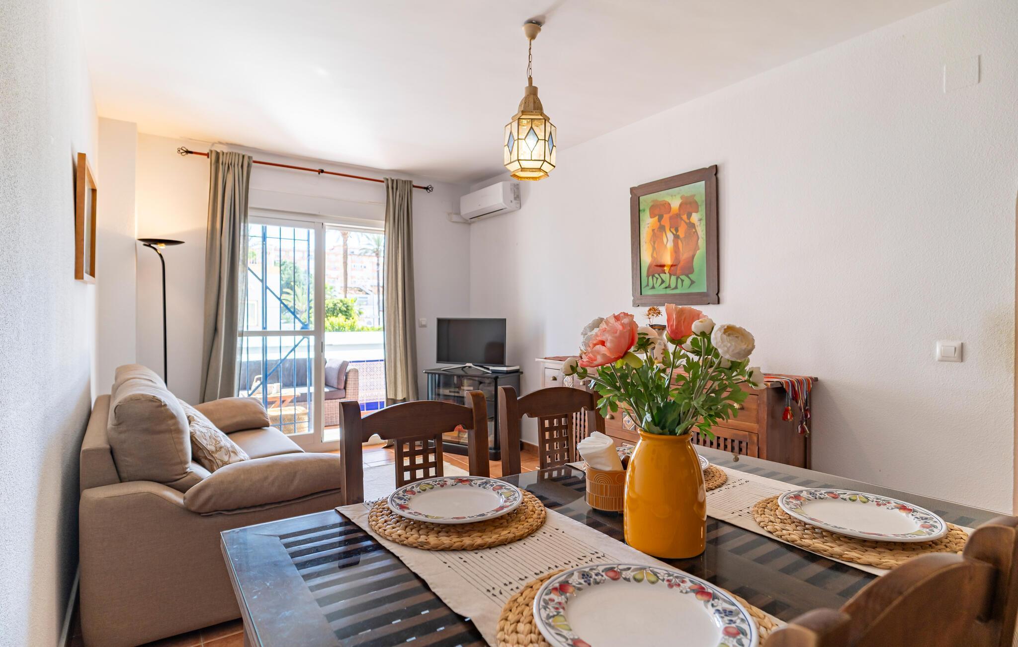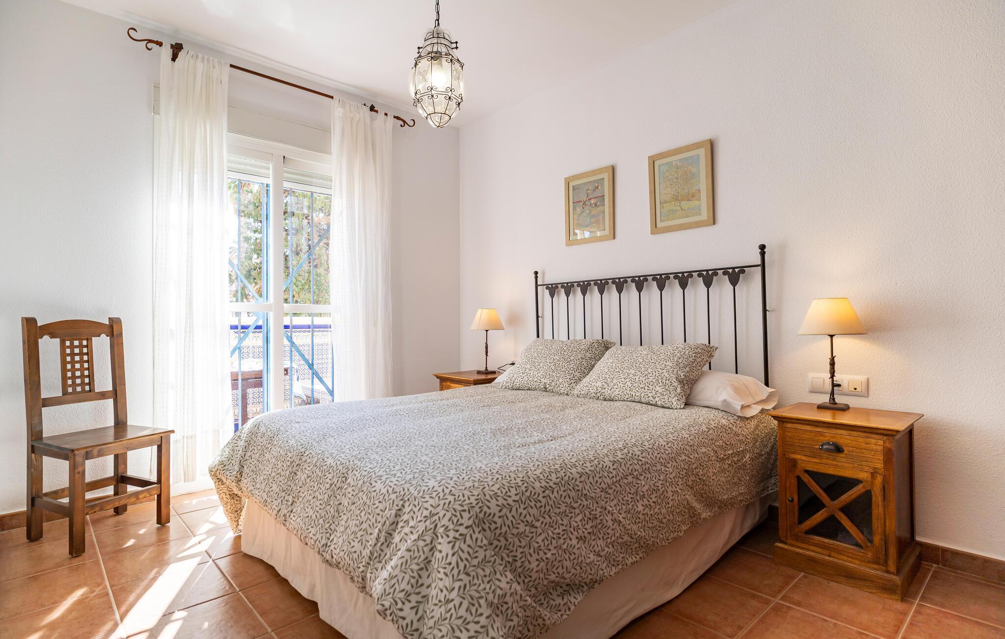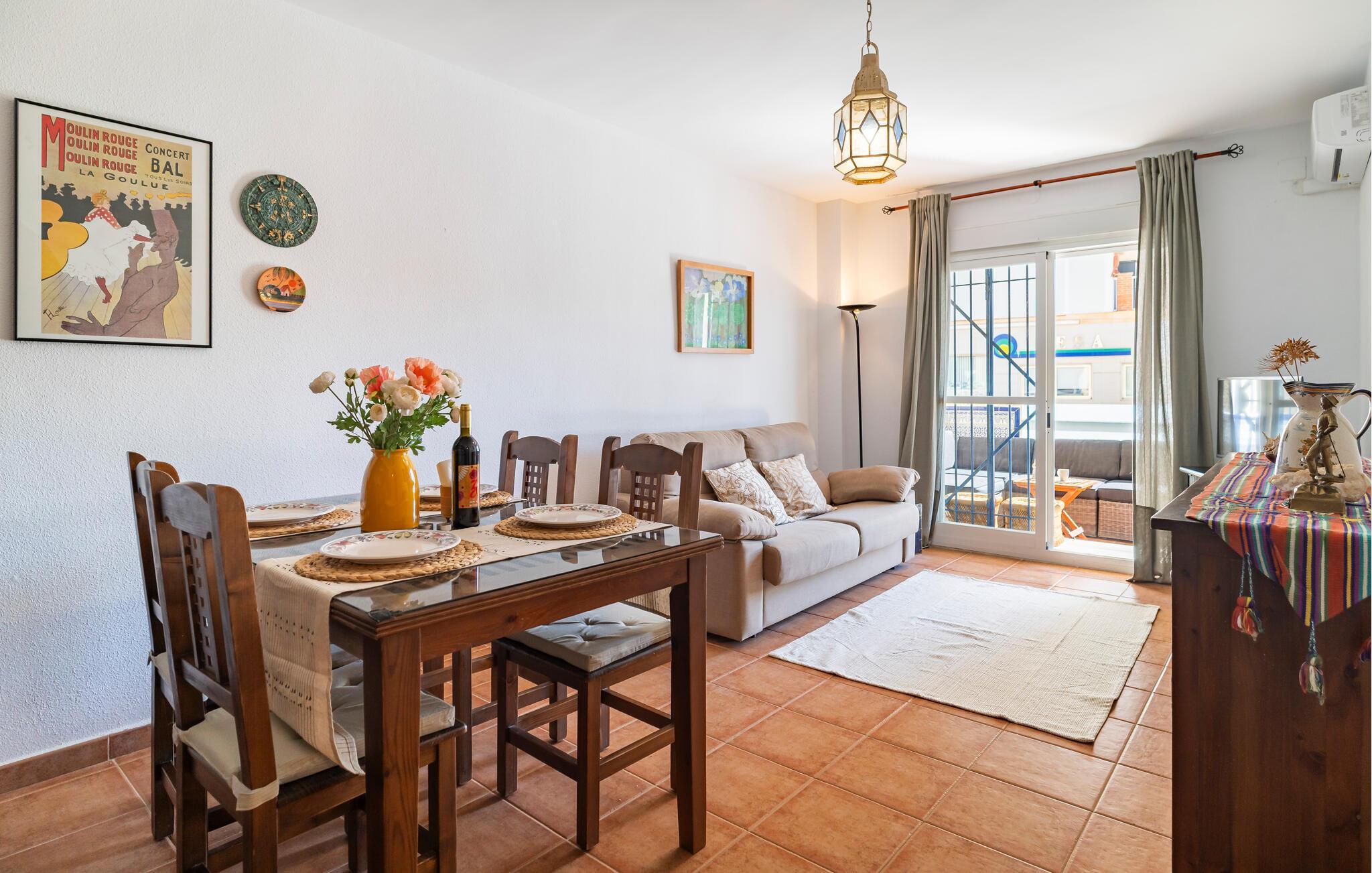 Denne velholdte feriebolig med andalusisk flair inviterer jer til en afslappende ferie ved kysten. Tryl spanske tapas frem i det veludstyrede køkken, og server jeres måltider ved det indbydende spisebord. På varme dage kan I nyde en velfortjent siesta på den hyggelige sofa og lade den friske havbrise strømme gennem rummene.