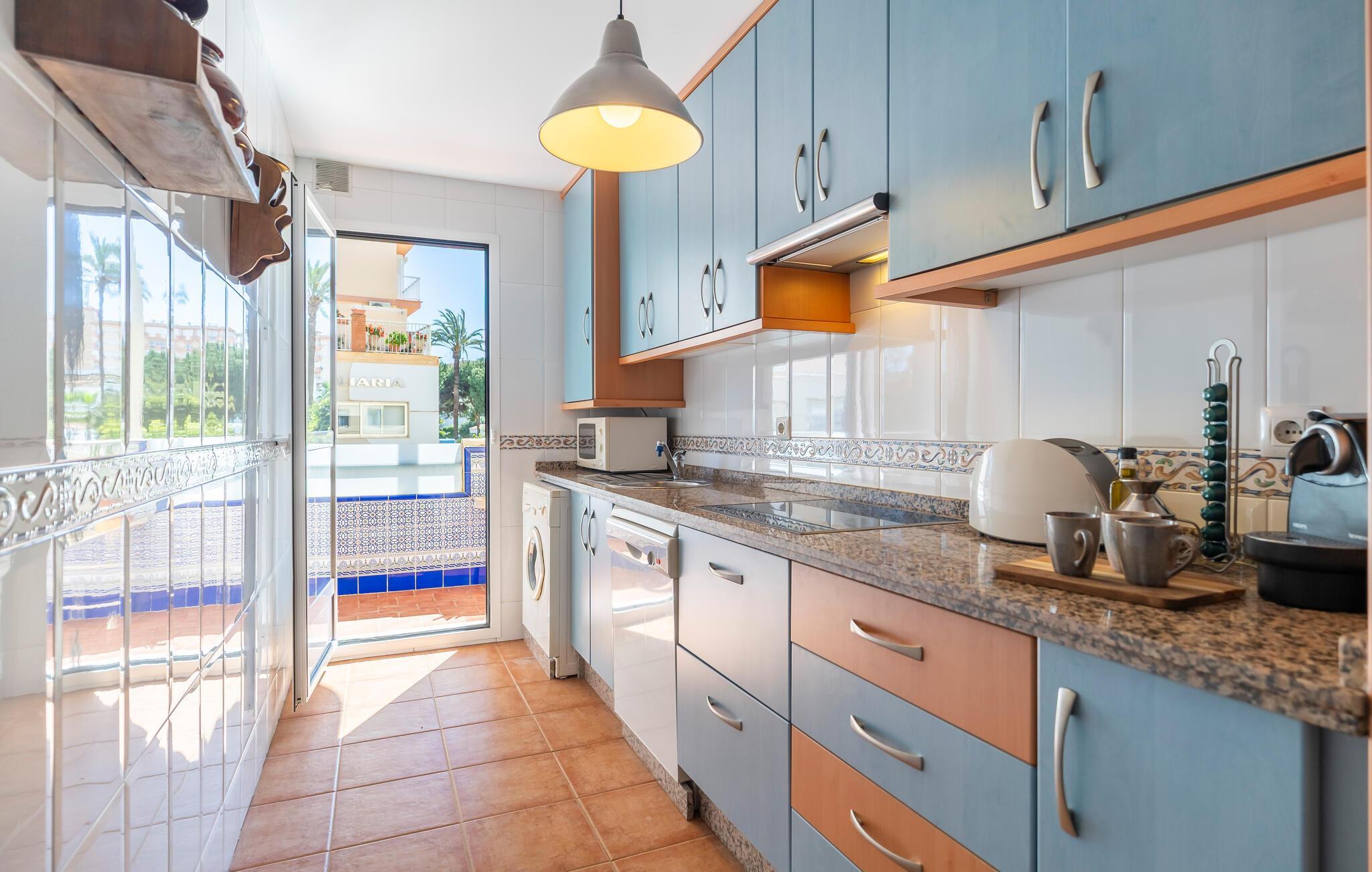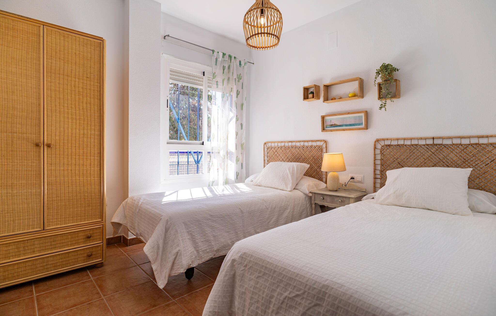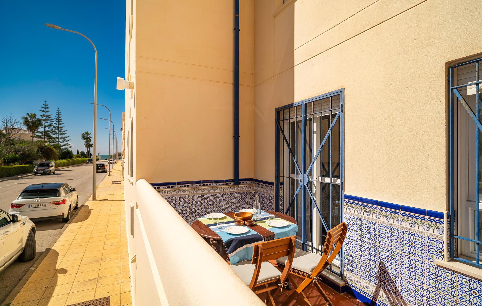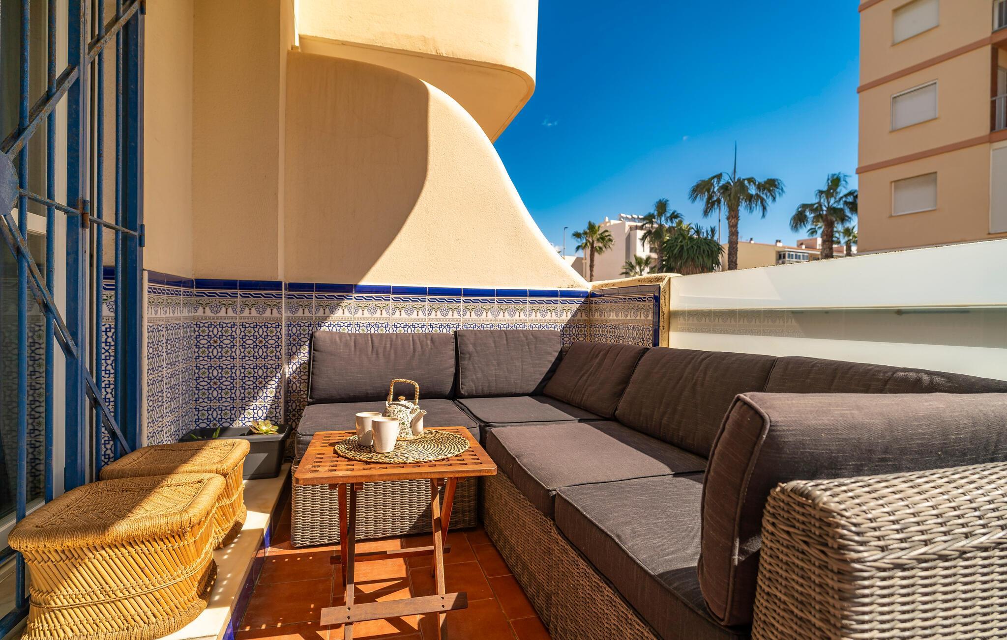 Denne velholdte feriebolig med andalusisk flair inviterer jer til en afslappende ferie ved kysten. Tryl spanske tapas frem i det veludstyrede køkken, og server jeres måltider ved det indbydende spisebord. På varme dage kan I nyde en velfortjent siesta på den hyggelige sofa og lade den friske havbrise strømme gennem rummene.