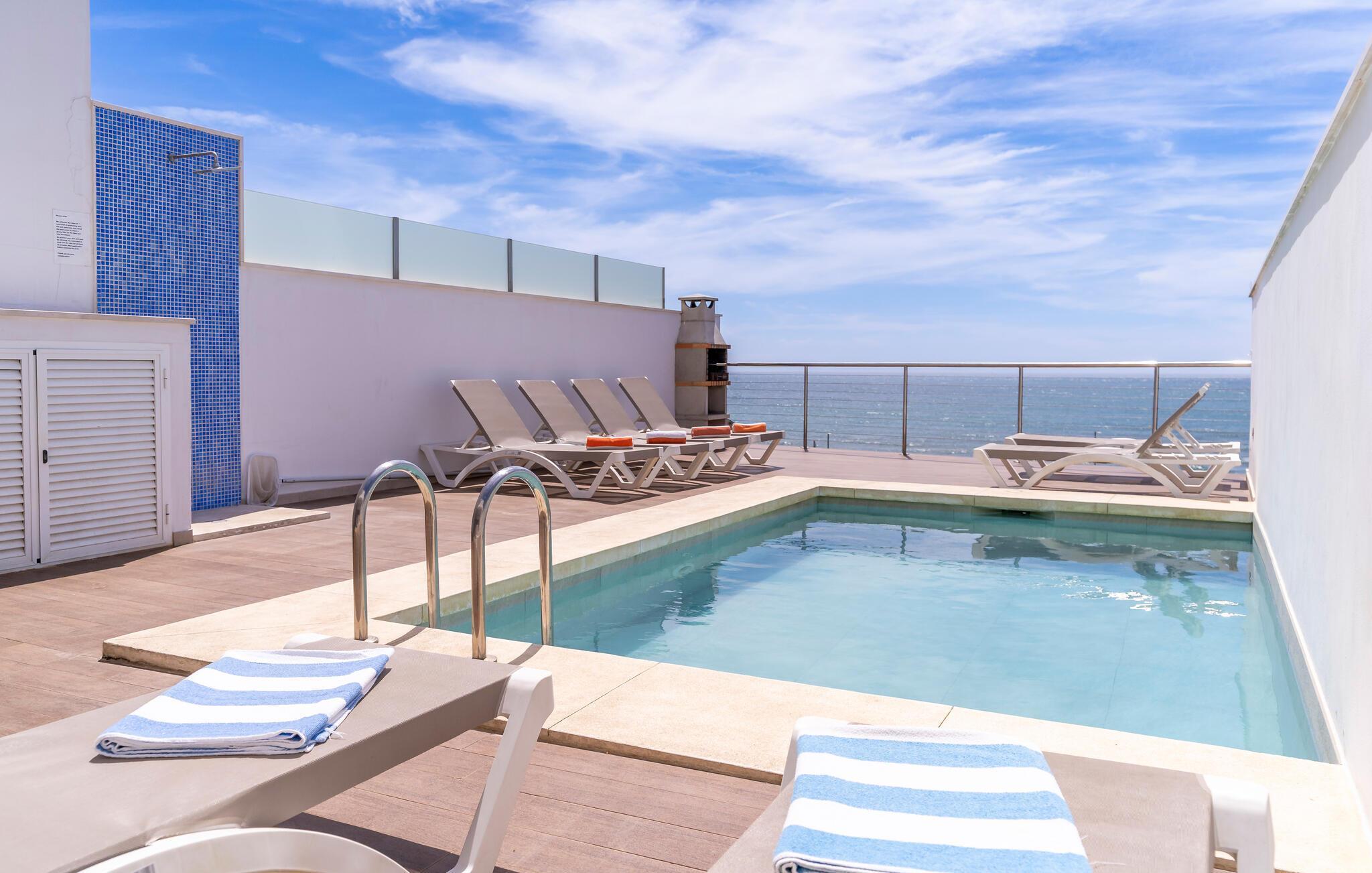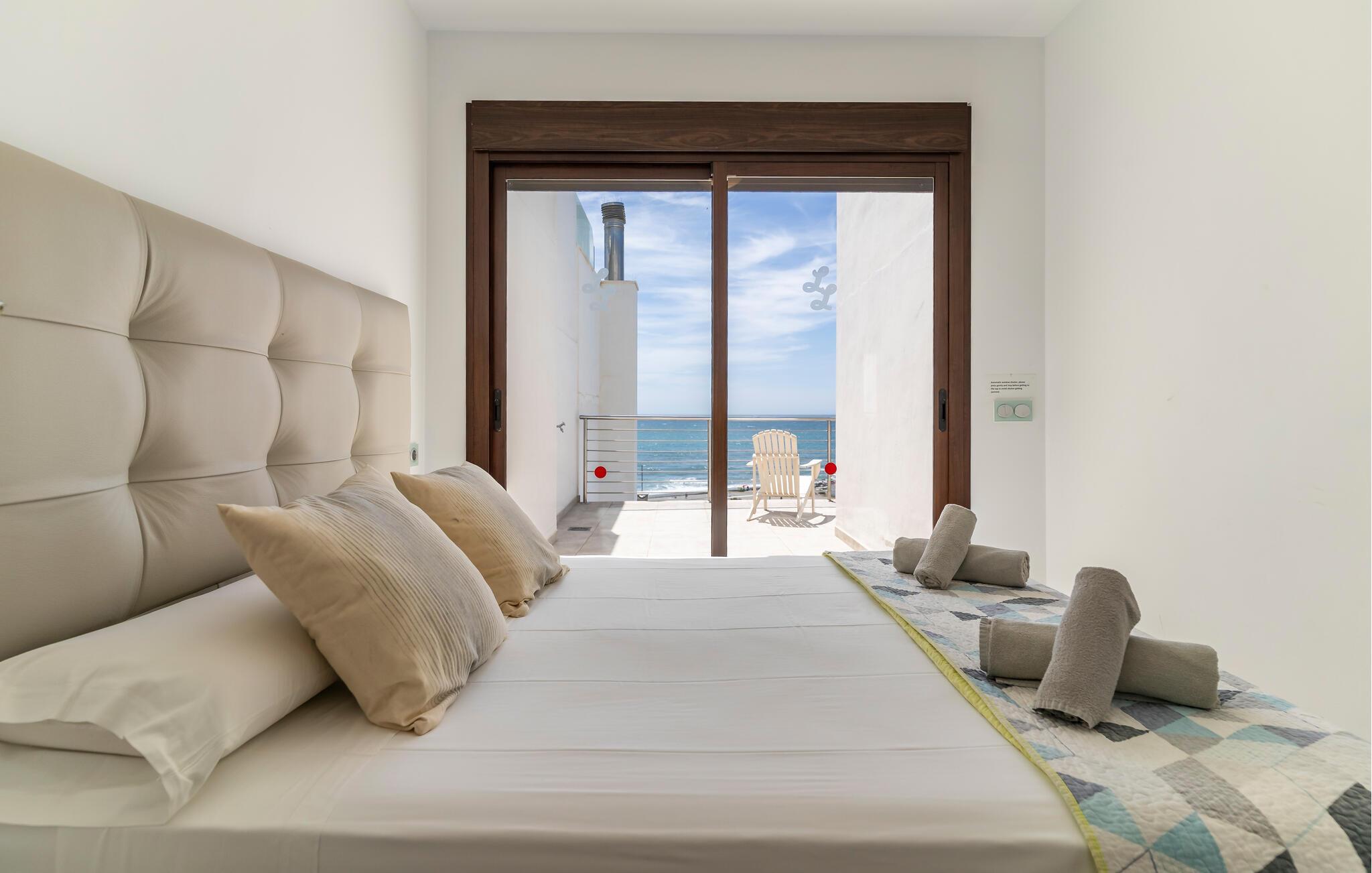 De brede skydedøre i glas giver nem adgang til den rummelige terrasse, hvor en charmerende udsigt over havet venter dig. Start dagen med friskpresset appelsinjuice, forfrisk jer i jeres lille private pool, og slap af på de behagelige liggestole. Der er grill til stemningsfulde aftener med vin og stearinlys.