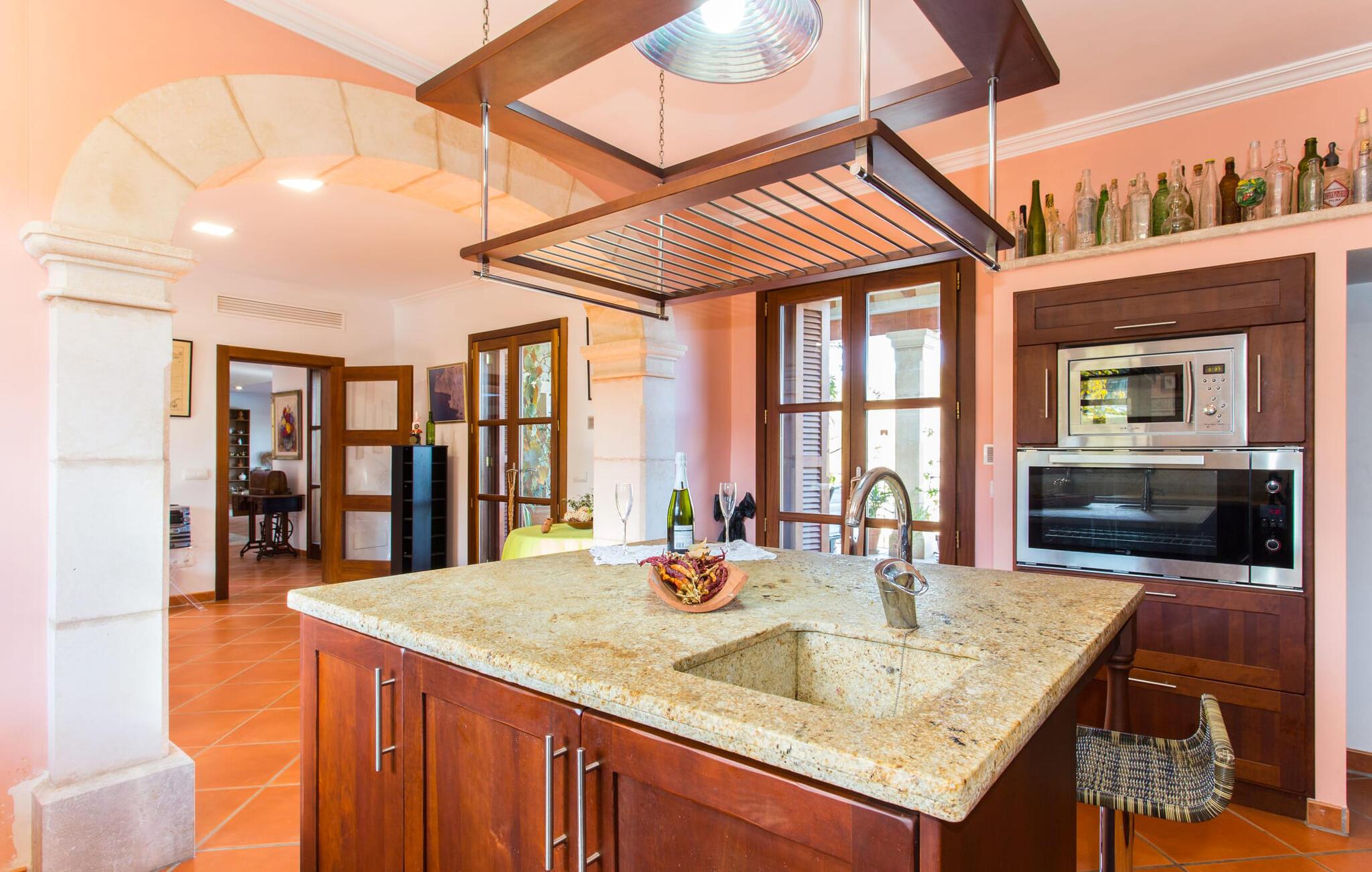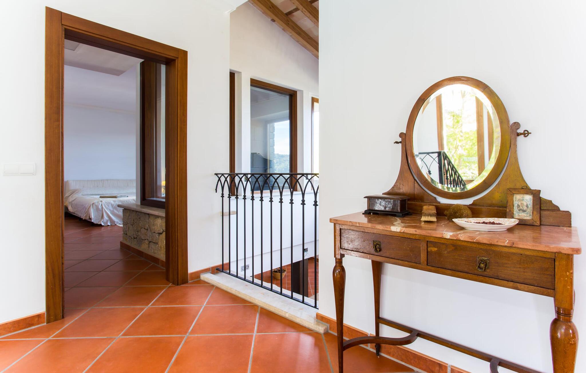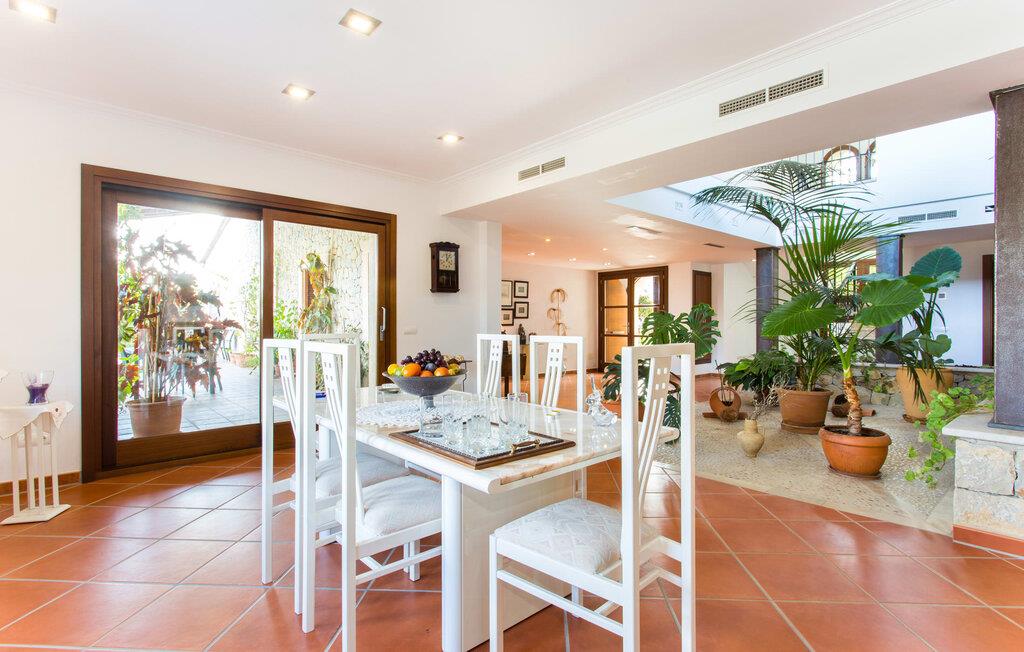 Navnet på dette hus antyder, at en fjern fætter til Druiden Getafix bryggede sin trylledrik her. Langt fra det! Det mest karakteristiske træk ved denne ejendom er vandet. Haven vil straks imponere jer med sin store pool, som er så rummelig, at I kan vælge mellem svømmelængder og -bredder. Naturens mangfoldighed afspejles i ejendommen; Forskellige frugttræer giver skygge i gården, og urtepotter på terrassen tilføjer et strejf af farve til den lyse solskinsdag. Den overdækkede terrasse er rummelig og nyder godt af husets smukke naturstensfacade. Så snart I har tændt grillen og en kølig drink venter på spisebordet, har I som vært plads nok i denne overdådige atmosfære til at modtage en eller to besøgende. Fra tagterrassen kan I endda se den nærliggende fodboldbane; Og selvom FC Barcelona-spillerne måske ikke snører fodboldstøvlerne dernede, så skal man som ivrig fodboldfan ikke undvære på ferie. Når I træder ind i huset, er det første I bemærker det rummelige indgangsparti. En samling af planter skaber en naturlig atmosfære i det lysfyldte atrium. På venstre side er den mindste af de to stuer med et tilstødende køkken, udstyret med en mikroovn og en rummelig ovn. Der er et bord i midten af køkkenet, hvor I kan spise jeres morgengrød eller drikke en kop kaffe på barstole. Den mindre stue byder på adskillige fritidsmuligheder, herunder at lytte til musik eller se en god film, mens I slapper af på de komfortable sofaer. Hvis I ikke har lyst til at forbruge medier og virkelig vil slukke, så er den anden stue lige noget for dig: Udover overdådige bogreoler er her en hyggelig pejs. Rummet er udstyret med sækkestole, der er nemme at flytte, så I kan bestemme, hvor tæt på bålet I vil sidde, eller hvor varmt I vil have det. To af soveværelserne er i stueetagen, ligesom det ene af badeværelserne. Alle andre finder deres hyggelige senge ovenpå; Badeværelserne er placeret direkte ved siden af dobbeltværelserne. Særligt attraktive er de tre badekar med spa-funktion. Sammen med de to brusere sikrer de, at jeres oplevelse med mallorcinsk vand ikke kun er til kropspleje, men er ren fornøjelse. Ferie handler jo om afslapning! Når det kommer til møbler, er hvert soveværelse anderledes, så alle kan finde det, der passer til deres smag. Men alle rummene har én ting til fælles: De vidner om god smag hos ejeren, der har bevist, at han har en god fornemmelse for en blanding af moderne og rustikke elementer – herunder nogle antikviteter – der giver interiøret et særligt præg. Navnet på landsbyen - Selva - kommer fra det latinske ord "silva", som betyder "skov". Dette er ingen overraskelse, da dette er et af de mest skovklædte områder på øen. Selva er en landsby, men også et kommunalt knudepunkt for tre andre landsbyer: Moscari, Caimari og Biniamar. Væk fra den slagne turiststi kan I stadig opleve det ægte mallorcanske liv i al sin charmerende enkelthed. Så tæt på naturen og alligevel så bekvemt beliggende - huset ligger på en lokal vej - kan I tilbringe en varieret og tilfredsstillende ferie i villaen "Turixant Dalt". Blot 5 km væk ligger Inca med 30.000 indbyggere en af de største byer på øen og bestemt et besøg værd – ikke mindst på grund af det nyligt åbnede skomuseum, som præsenterer den læderforarbejdningsindustri, der er så vigtig på øen. Der serveres solide regionale retter i rustikke kælderrestauranter, og I kan derefter føle trangen til at smide kiloene med en svømmetur i havet. Intet problem; De fantastiske sandstrande i Alcúdia-bugten ligger kun 25 km væk. Det overdådige hus "Turixant Dalt" er mere en urban udgave af en villa, ligger i den lille landsby Selva og har stadig karakter af en villa. For alle vigtige shoppingmuligheder og nattestemningen i vinkældrene ligger den næste større by, Inca, kun 10 minutter væk i bil. De fantastiske sandstrande i Alcúdia-bugten på nordkysten ligger kun 25 km væk. Og øens hovedstad Palma og lufthavnen er omkring 30 kilometer væk.