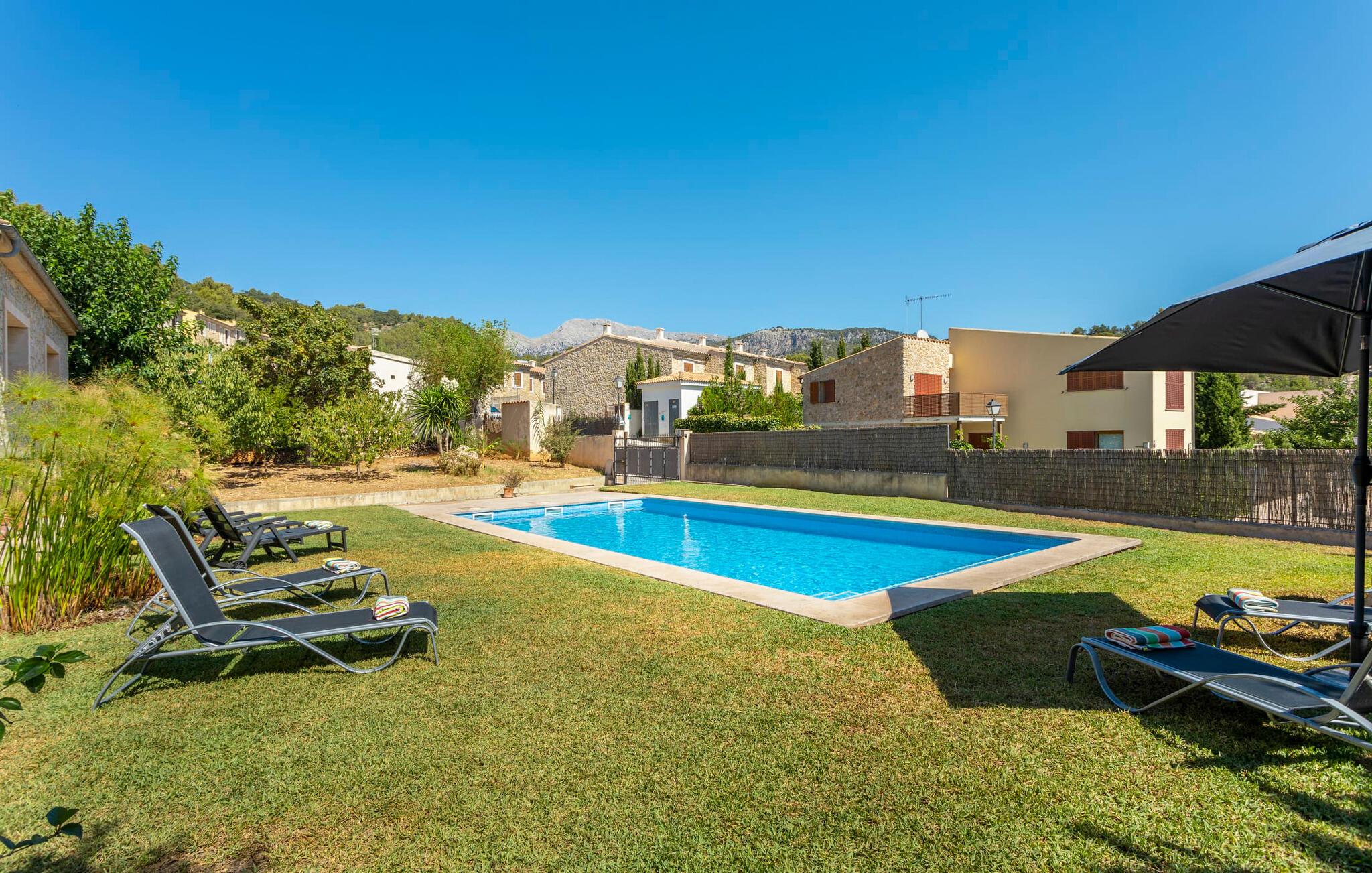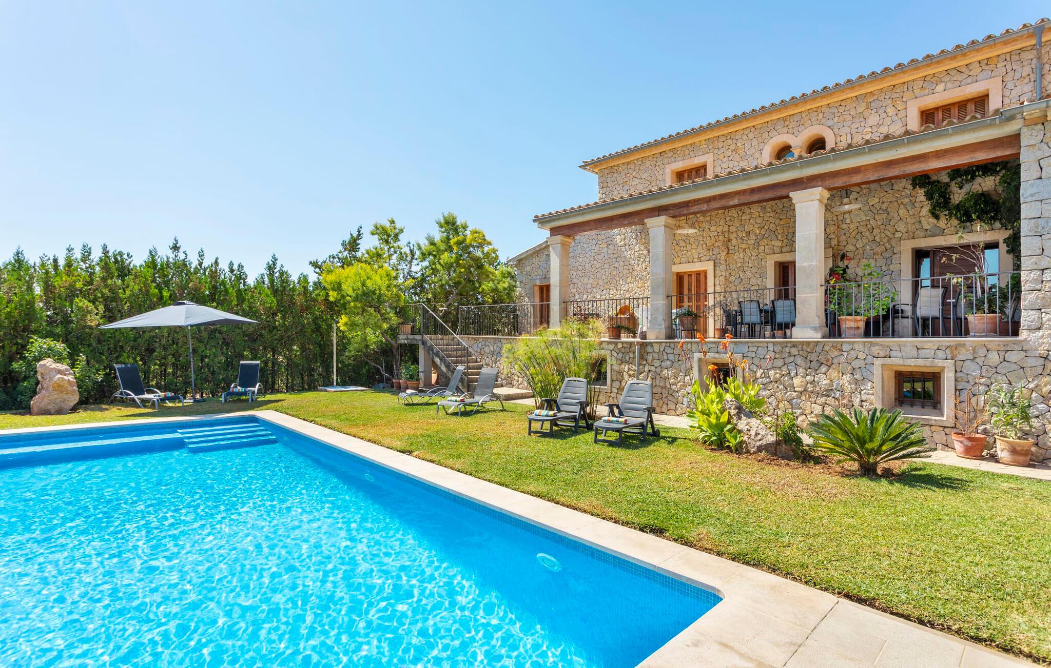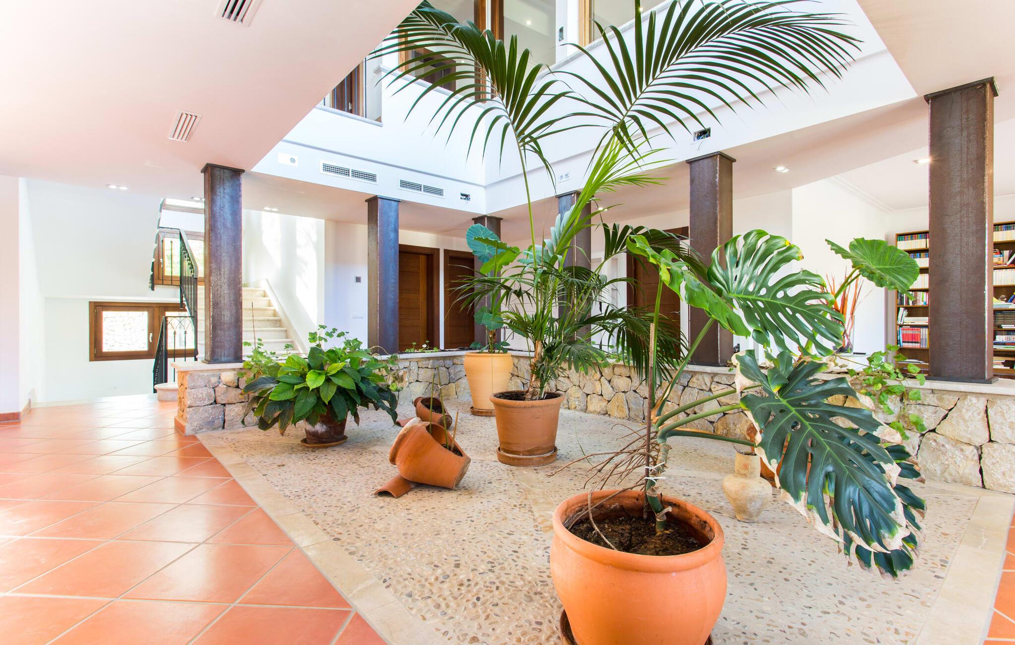 Navnet på dette hus antyder, at en fjern fætter til Druiden Getafix bryggede sin trylledrik her. Langt fra det! Det mest karakteristiske træk ved denne ejendom er vandet. Haven vil straks imponere jer med sin store pool, som er så rummelig, at I kan vælge mellem svømmelængder og -bredder. Naturens mangfoldighed afspejles i ejendommen; Forskellige frugttræer giver skygge i gården, og urtepotter på terrassen tilføjer et strejf af farve til den lyse solskinsdag. Den overdækkede terrasse er rummelig og nyder godt af husets smukke naturstensfacade. Så snart I har tændt grillen og en kølig drink venter på spisebordet, har I som vært plads nok i denne overdådige atmosfære til at modtage en eller to besøgende. Fra tagterrassen kan I endda se den nærliggende fodboldbane; Og selvom FC Barcelona-spillerne måske ikke snører fodboldstøvlerne dernede, så skal man som ivrig fodboldfan ikke undvære på ferie. Når I træder ind i huset, er det første I bemærker det rummelige indgangsparti. En samling af planter skaber en naturlig atmosfære i det lysfyldte atrium. På venstre side er den mindste af de to stuer med et tilstødende køkken, udstyret med en mikroovn og en rummelig ovn. Der er et bord i midten af køkkenet, hvor I kan spise jeres morgengrød eller drikke en kop kaffe på barstole. Den mindre stue byder på adskillige fritidsmuligheder, herunder at lytte til musik eller se en god film, mens I slapper af på de komfortable sofaer. Hvis I ikke har lyst til at forbruge medier og virkelig vil slukke, så er den anden stue lige noget for dig: Udover overdådige bogreoler er her en hyggelig pejs. Rummet er udstyret med sækkestole, der er nemme at flytte, så I kan bestemme, hvor tæt på bålet I vil sidde, eller hvor varmt I vil have det. To af soveværelserne er i stueetagen, ligesom det ene af badeværelserne. Alle andre finder deres hyggelige senge ovenpå; Badeværelserne er placeret direkte ved siden af dobbeltværelserne. Særligt attraktive er de tre badekar med spa-funktion. Sammen med de to brusere sikrer de, at jeres oplevelse med mallorcinsk vand ikke kun er til kropspleje, men er ren fornøjelse. Ferie handler jo om afslapning! Når det kommer til møbler, er hvert soveværelse anderledes, så alle kan finde det, der passer til deres smag. Men alle rummene har én ting til fælles: De vidner om god smag hos ejeren, der har bevist, at han har en god fornemmelse for en blanding af moderne og rustikke elementer – herunder nogle antikviteter – der giver interiøret et særligt præg. Navnet på landsbyen - Selva - kommer fra det latinske ord "silva", som betyder "skov". Dette er ingen overraskelse, da dette er et af de mest skovklædte områder på øen. Selva er en landsby, men også et kommunalt knudepunkt for tre andre landsbyer: Moscari, Caimari og Biniamar. Væk fra den slagne turiststi kan I stadig opleve det ægte mallorcanske liv i al sin charmerende enkelthed. Så tæt på naturen og alligevel så bekvemt beliggende - huset ligger på en lokal vej - kan I tilbringe en varieret og tilfredsstillende ferie i villaen "Turixant Dalt". Blot 5 km væk ligger Inca med 30.000 indbyggere en af de største byer på øen og bestemt et besøg værd – ikke mindst på grund af det nyligt åbnede skomuseum, som præsenterer den læderforarbejdningsindustri, der er så vigtig på øen. Der serveres solide regionale retter i rustikke kælderrestauranter, og I kan derefter føle trangen til at smide kiloene med en svømmetur i havet. Intet problem; De fantastiske sandstrande i Alcúdia-bugten ligger kun 25 km væk. Det overdådige hus "Turixant Dalt" er mere en urban udgave af en villa, ligger i den lille landsby Selva og har stadig karakter af en villa. For alle vigtige shoppingmuligheder og nattestemningen i vinkældrene ligger den næste større by, Inca, kun 10 minutter væk i bil. De fantastiske sandstrande i Alcúdia-bugten på nordkysten ligger kun 25 km væk. Og øens hovedstad Palma og lufthavnen er omkring 30 kilometer væk.