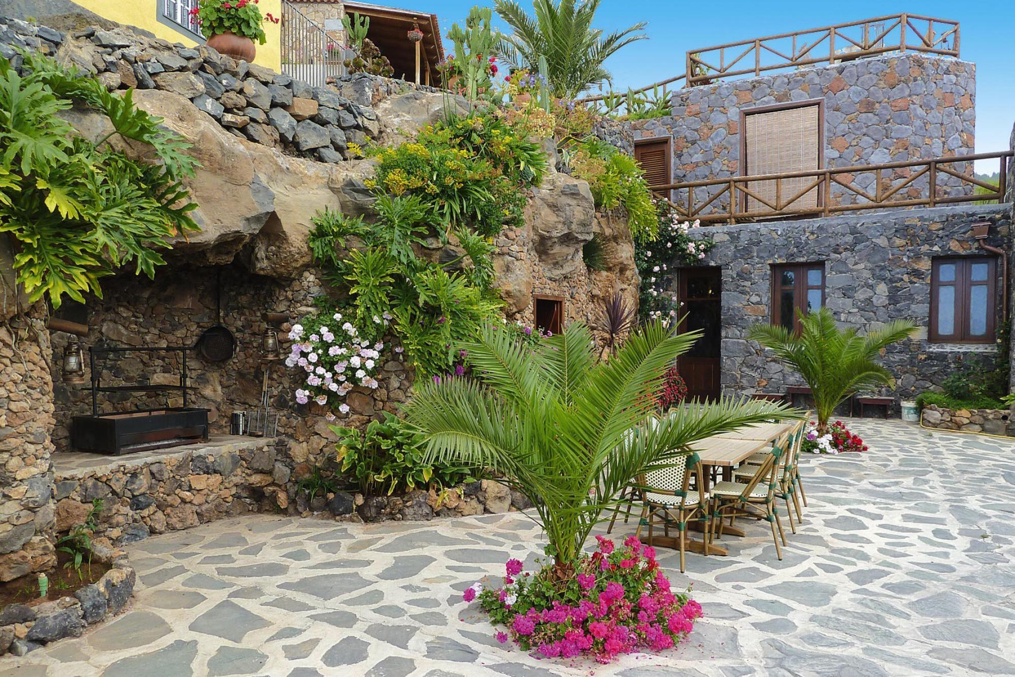 Rækkehus med imponerende havudsigt! Den smukke ejendom er beliggende i Vera de Erques, en lille, rolig landsby på den sydvestlige side af Tenerife. De fleste traditionelt byggede huse stammer fra det 18. eller 19. århundrede. Beliggende 700 meter over havets overflade tilbyder Vera de Erques smuk udsigt fra sin terrasse og romantiske solnedgange med udsigt over øerne La Gomera, La Palma og El Hierro. Kanariske planter og frodig vegetation definerer landskabet i hele området. Beliggende på den nederste grund af Caserio Lomo Arriba og byder på sin egen indendørs pool med skiftende farvebelysning og massagedyser, det komfortabelt indrettede feriehus tilbyder et strejf af luksus. Tre terrasser, en pavillon og et afslapnings- og barområde i et udhus fuldender dit sommerhus. Hele området er bygget som en hule i bjerget og skaber en helt speciel atmosfære. Der er stereoanlæg med cd'er, minibar med diverse te, flere liggestole og springvand med små koi.