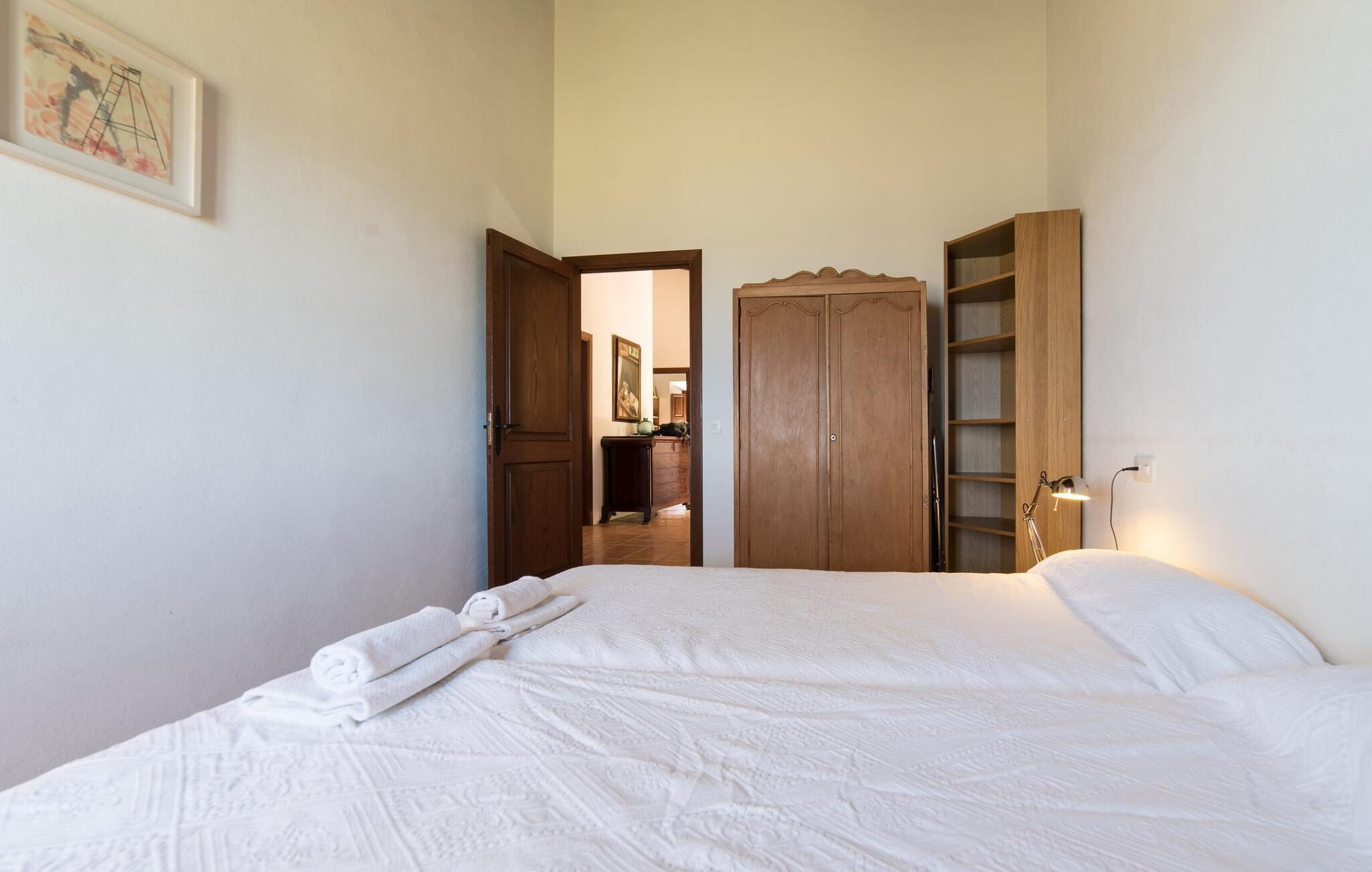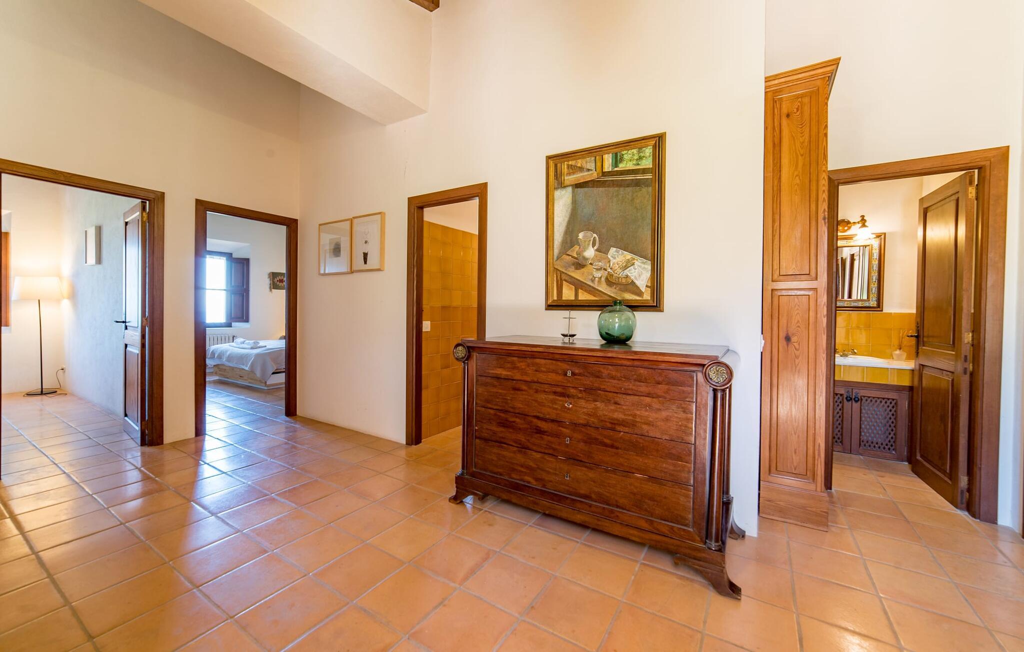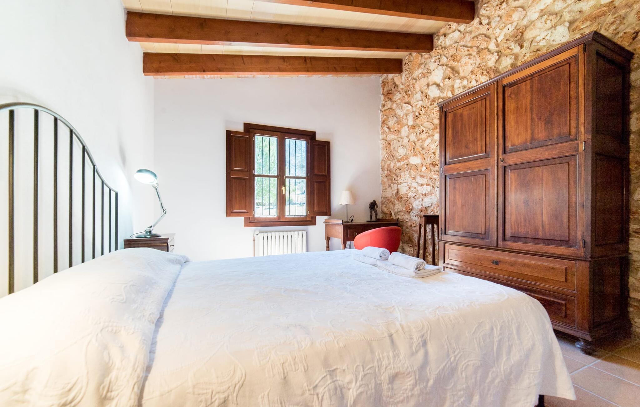Husets interiør er komfortabelt og tilbyder et personligt præg. Møbler af høj kvalitet og stilfulde detaljer venter jer i gangen. Den lyse stue/spisestue med højt til loftet kombinerer smagfuldt funktionalitet med komfort og charme. Den har et tv med dvd- og cd-afspiller, komfortable sofaer, gyngestole og et spisebord. Udvalgte elementer som den klassiske ovn, det elegante sofabord og træklaveret forstærker hyggefaktoren i dette centrale rum. De massive træbjælker i lofterne fuldender den hjemlige atmosfære. Køkkenet er rummeligt og fuldt udstyret. Ud over basale apparater som ovn og keramisk kogeplade er der også en kaffemaskine, elkedel og brødrister. Et særligt træk ved huset er det stemningsfulde, lille bibliotek med bogreoler. De meget smagfulde soveværelser tilbyder en afslappende oase i dette hjørne af verden. I et af de tre soveværelser har sengen udsigt over en naturstensvæg, som er imponerende oplyst og skaber en særlig behagelig effekt. Der er i alt fire senge til rådighed, der måler 0,90 x 1,90 m og en, der måler 1,50 x 1,90 m. Badeværelserne er enkle og funktionelle.
