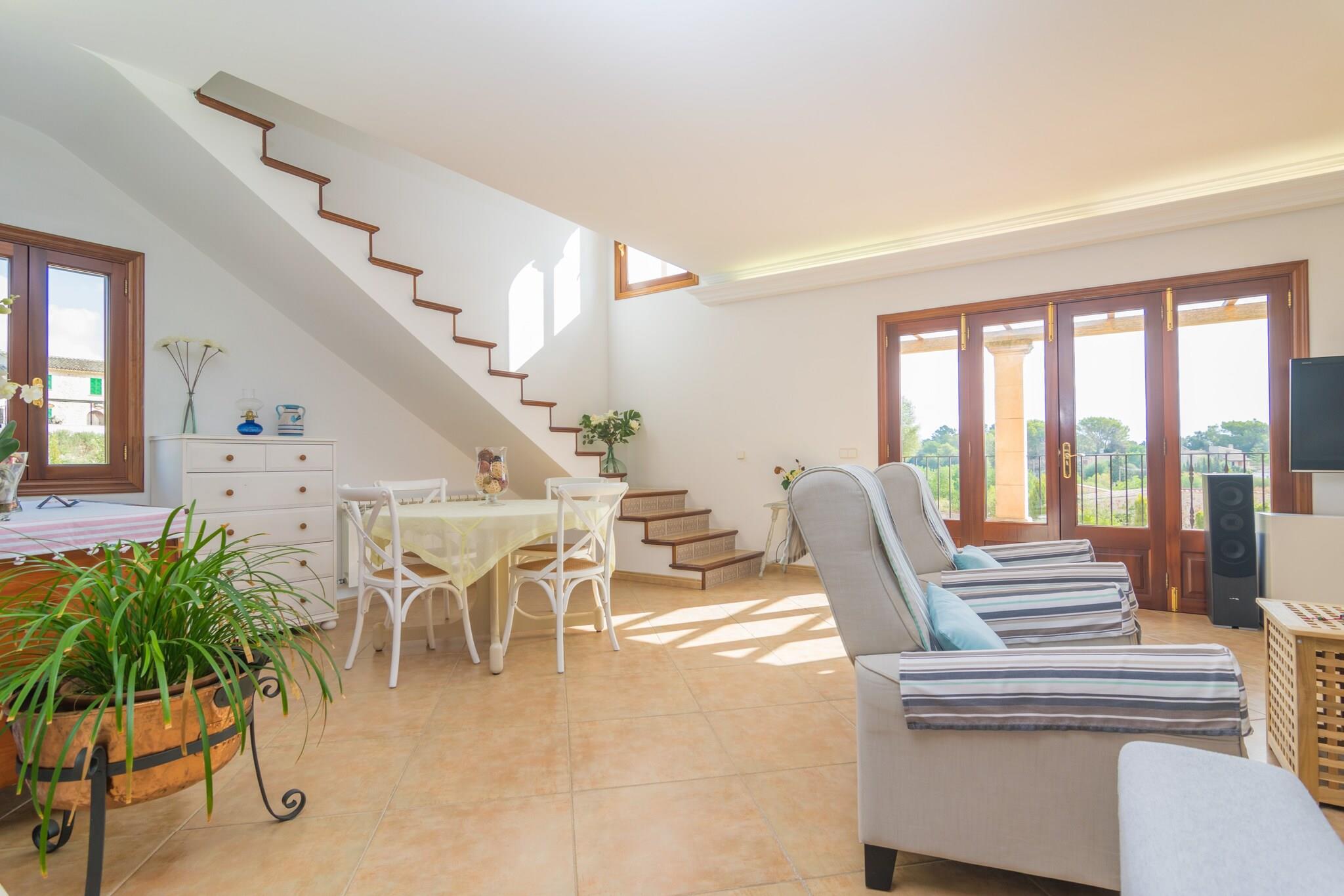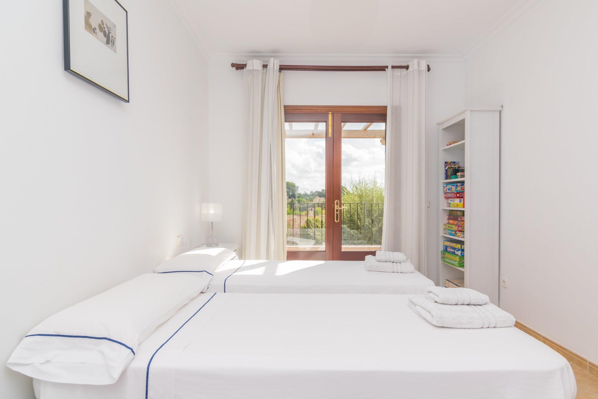 De buitenkant van dit huis straalt vreugde en rust uit dankzij het groen van de tuin en de witte toets, waardoor het een maritieme sfeer krijgt. Op de veranda, naast het chloorzwembad, van 8,5 x 4,5 m en met een diepte van 1,2 tot 2 m, kunt u genieten van een voortreffelijk ontbijt of een barbecue terwijl u uitkijkt over het uitzicht op de bergen. Rondom het zwembad staan ??maximaal 6 ligstoelen om te zonnebaden. Als u zin ??heeft om snel te douchen zonder naar binnen te hoeven, is er een badkamer bij het zwembad. Het perceel is omheind en heeft enkele buren in de buurt. Op de begane grond van het huis vindt u een woon-eetkamer, waar u ontspannen kunt kijken naar satelliettelevisie, een dvd-film of gewoon kunt genieten van het uitzicht buiten. Bij de uitgang van de woonkamer is er een fantastisch terras voor familiemaaltijden. De keuken is vrij ruim en is voorzien van een gaskookplaat. Vervolgens hebben ze twee badkamers, één met douche en de andere met ligbad, en twee slaapkamers met twee eenpersoonsbedden, een kledingkast en airconditioning. Eén van hen heeft ook toegang tot hetzelfde terras als de kamer. Op de bovenverdieping bevindt zich een derde slaapkamer met kledingkast, airconditioning en tweepersoonsbed en een en-suite badkamer met ligbad. Ze hebben maximaal twee ventilatoren tot hun beschikking en voor de winter is het huis voorzien van centrale verwarming op olie. Uiteraard is er een wasmachine, strijkijzer en strijkplank aanwezig. Het huis, gelegen op ongeveer 300 meter van Vilafranca, op Pla de Mallorca, en omgeven door een landelijke omgeving met agrarische activiteiten, heeft gemakkelijke toegang tot de vele strandgebieden in Levante, via de snelweg Ma-15. Vilafranca is een charmant stadje, waar u alles vindt wat u nodig heeft tijdens uw verblijf. Op ongeveer 11 km afstand ligt het kleine stadje Manacor, ideaal voor grotere aankopen. Op ongeveer 25 km afstand ligt het strand van Porto Cristo, en nog veel meer stranden in verschillende richtingen, zoals Porto Colom, Cala Morlanda of Cala Magraner. Woensdag in de stad Sineu, 20 minuten. Met de auto kunt u de lokale markt bezoeken en een van de gastronomische specialiteiten proberen. Airconditioning is 10 uur per dag gratis beschikbaar. Het vooraf gedefinieerde schema is van 21:30-22:00 uur tot 07:30-08:00 uur, maar het is mogelijk om dit te kiezen. Als u er meer dan 10 uur per dag gebruik van wilt maken, bedragen de kosten 0,50 EUR/uur voor elke kamer met airconditioning. Voor eventuele extra kosten kunt u contact opnemen met de adverteerder. Huisdieren tot 5,00 kg zijn welkom. Het vieren van evenementen is niet toegestaan. Er is buiten parkeergelegenheid voor 3 auto's. Er is 1 parkeerplaats in de garage. Afstanden Strand: 25 km - Cala Domingos Luchthaven: 37,6 km - Son Sant Joan Golfbaan: 15,4 km - Golf Reserva Rotana Stad: 0.290 km - Vilafranca Treinstation: 11,2 km - station Manacor Bushalte: 0.800 km - Plaça Tomeu Penya, Vilafranca Veerboot: 45,5 km - Haven van Palma Ziekenhuis: 12,4 km - Manacor-ziekenhuis Toeristenvergunning: ETV/7666Bij de ingang dient u de Ecotasa (toeristenbelasting van de Balearen) contant te betalen. Het bedrag varieert tussen EURO 0,55 / per nacht per persoon in het laagseizoen en EURO 2,2 / per nacht per persoon in het hoogseizoen. Vanaf de negende dag wordt het met de helft verminderd. Personen onder de 16 jaar uitgesloten.
