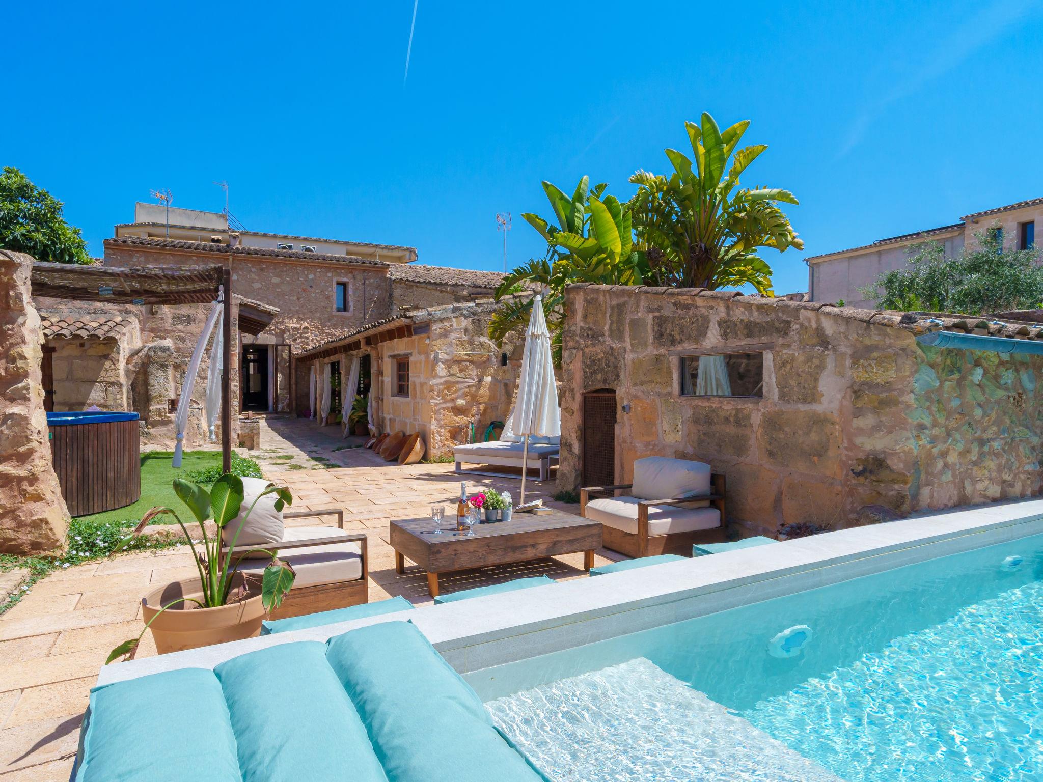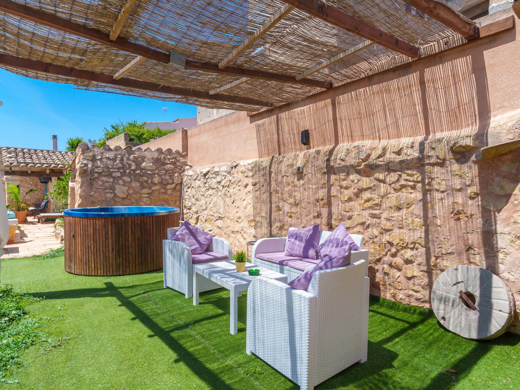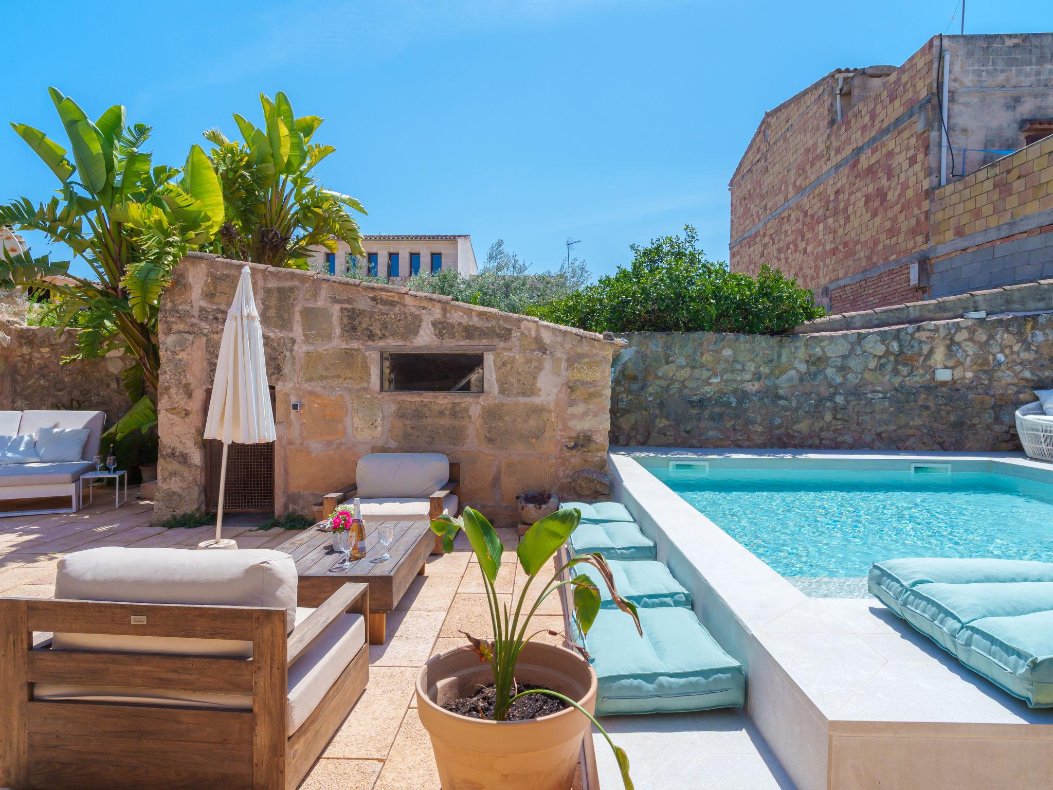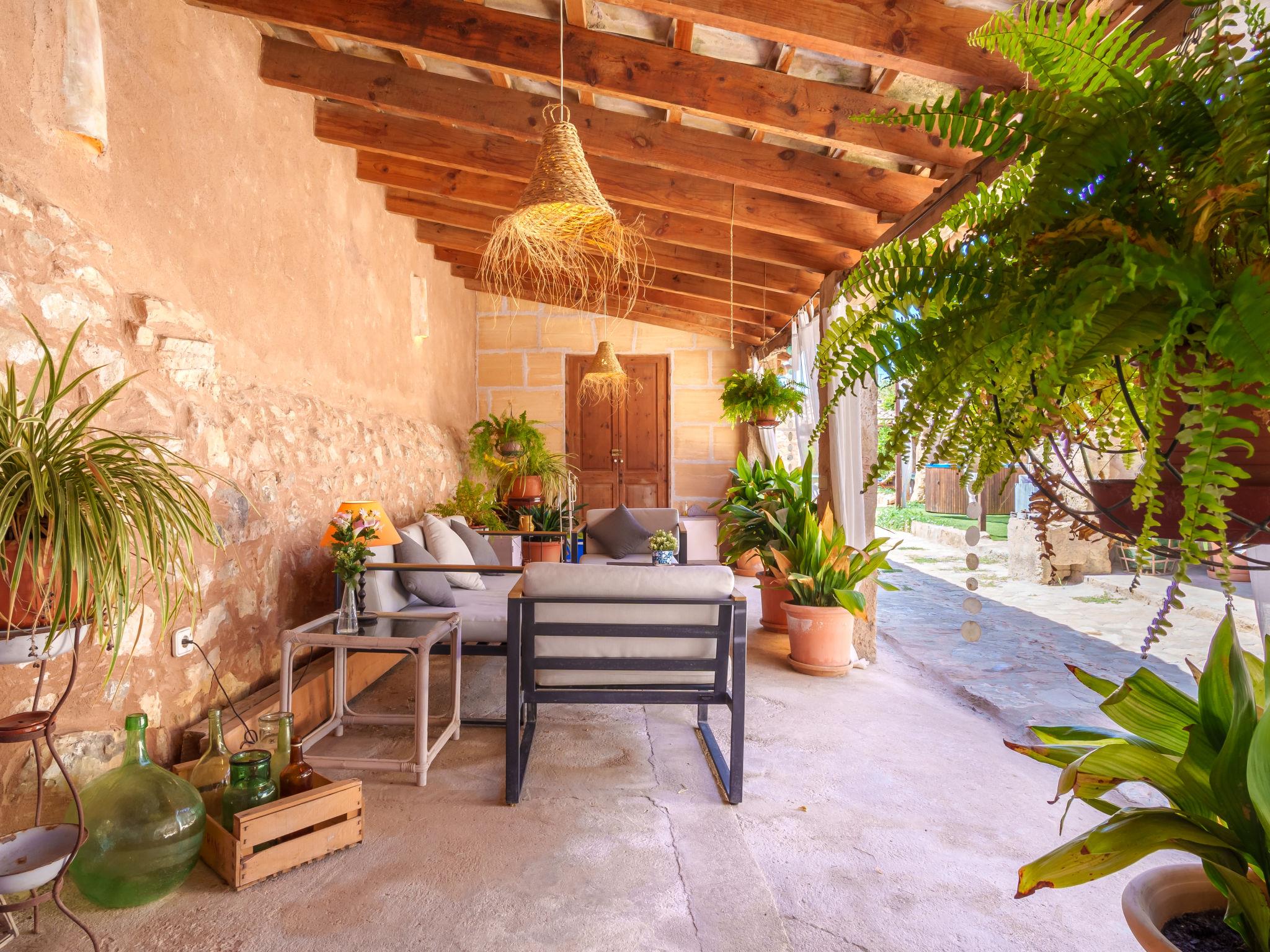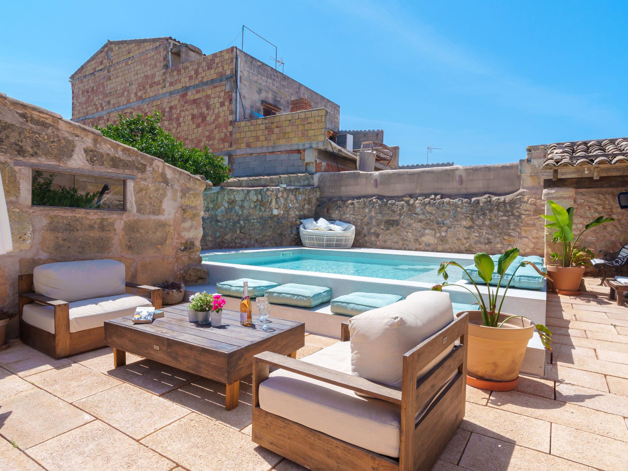 Vilafranca de Bonany: Very beautiful, comfortable house "Ca sa Padrina", 2 storeys, renovated. In the resort, 250 m from the centre, excellent location: right in the centre but still quiet, 3 km from the edge of the forest, 24 km from the sea, 24 km from the beach. Private: with flowers, beautiful garden to relax, swimming pool angular (5 m, depth 120 cm, seasonal availability: 01.May. - 31.Oct.). Outdoor shower, patio, arbour, pergola, garden furniture, barbecue. In the house: internet access, WiFi, air conditioning, washing machine. Shop 250 m, grocery 250 m, supermarket, restaurant, bar 300 m, bakery 300 m, internet café, pedestrian zone, pub garden 300 m, 4 minute walk to the centre, bus stop 450 m, sandy beach 24 km, rocky beach 25 km. Sports harbour 25 km, marina 25 km, golf course (18 hole) 29 km. Nearby attractions: Iglésia de Santa Bárbara, Las de Sant Martí d’Alanzel, Les cases d’Alcudiarrom, Restaurante Es Cruce, Sa Franquesa Vella i Sa Franquesa nova. Please note: suitable for families, suitable for seniors. Object suitable for 6 adults + 1 child groups of teenagers on request only. Loading and unloading of baggage is possible at the holiday house. Airfield 39 km from the property. The 2 bedrooms of the second floor have windows in the ceiling and can be opened.