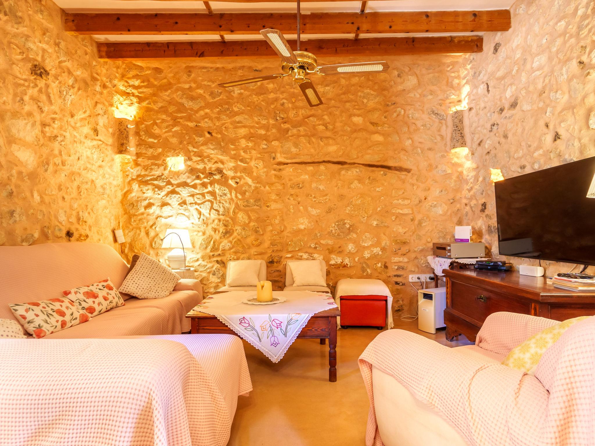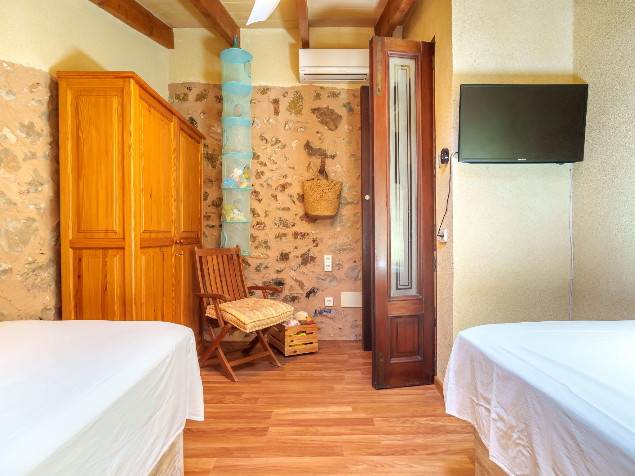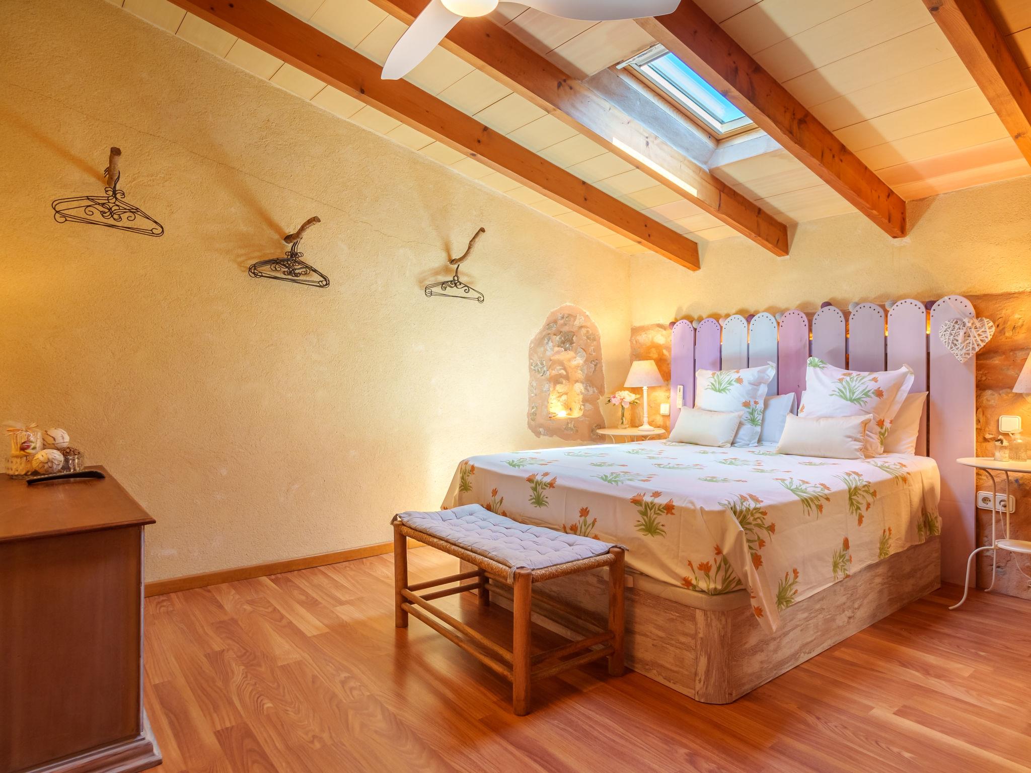 "Ca sa Padrina", 4-room house 170 m2 on 2 levels. Object suitable for 6 adults + 1 child. Spacious, fully renovated, very beautiful and rustic furnishings: open large living/dining room with open-hearth fireplace, dining table, TV, satellite TV, international TV channels, flat screen, radio, hi-fi system, DVD, air conditioning, fan and forced-air heating. 1 large double bedroom with panoramic window with 1 french bed (150 cm, length 200 cm), fan. Large kitchen-/living room (oven, dishwasher, 3 induction hot plates, toaster, kettle, microwave, freezer, electric coffee machine) with dining table, TV and flat screen. Exit to the patio, to the swimming pool. Bath/shower/bidet/WC. Upper floor: (ladder) open large living room with panoramic window with 1 sofabed, TV, flat screen, hi-fi system and fan. 1 large double bedroom with 1 french bed (160 cm, length 200 cm), TV, flat screen, air conditioning and forced-air heating. 1 room with 2 beds (90 cm, length 90 cm) (length 190 cm), 1 wall-trunk bed (90 cm, length 190 cm), air conditioning and forced-air heating. Bath/shower/bidet/WC. Natural stone floors. Comfortable furnishings in the country house style. Large patio, porch. Terrace furniture, barbecue, deck chairs, covered balcony, sitting area. View of the garden and the resort. Facilities: washing machine, iron, children's high chair, baby cot, hair dryer. Internet (WiFi, free). Maximum 1 pet/ dog allowed. The two bedrooms of the upper floor have ceiling windows and can be opened. ETV5854 // Reg. Nr.: ESFCTU00000702900030678600000000000000000000ETV/58544