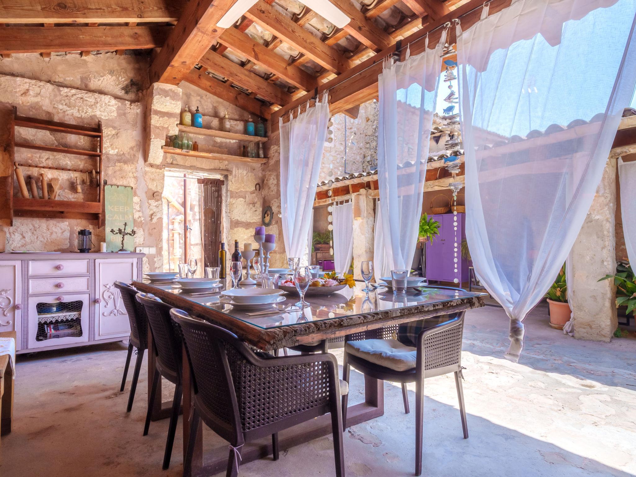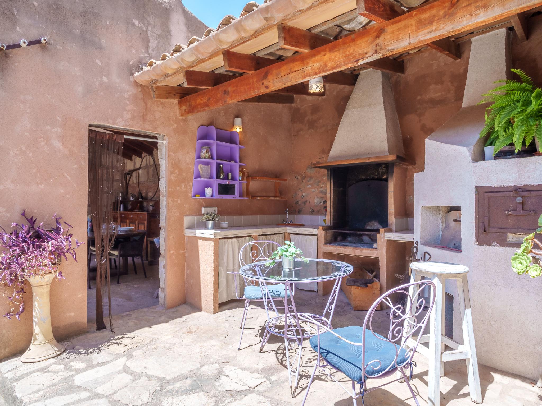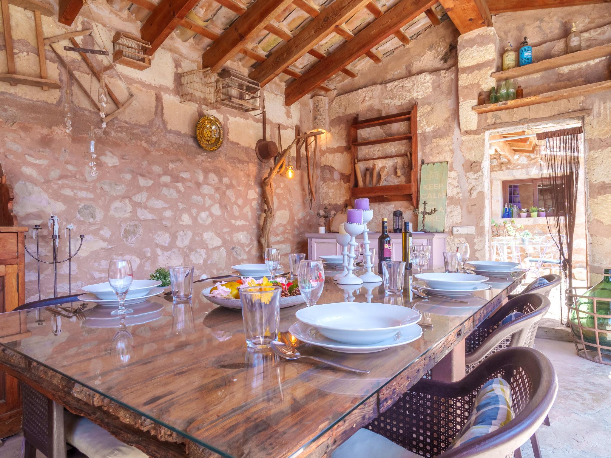 "Ca sa Padrina", 4-room house 170 m2 on 2 levels. Object suitable for 6 adults + 1 child. Spacious, fully renovated, very beautiful and rustic furnishings: open large living/dining room with open-hearth fireplace, dining table, TV, satellite TV, international TV channels, flat screen, radio, hi-fi system, DVD, air conditioning, fan and forced-air heating. 1 large double bedroom with panoramic window with 1 french bed (150 cm, length 200 cm), fan. Large kitchen-/living room (oven, dishwasher, 3 induction hot plates, toaster, kettle, microwave, freezer, electric coffee machine) with dining table, TV and flat screen. Exit to the patio, to the swimming pool. Bath/shower/bidet/WC. Upper floor: (ladder) open large living room with panoramic window with 1 sofabed, TV, flat screen, hi-fi system and fan. 1 large double bedroom with 1 french bed (160 cm, length 200 cm), TV, flat screen, air conditioning and forced-air heating. 1 room with 2 beds (90 cm, length 90 cm) (length 190 cm), 1 wall-trunk bed (90 cm, length 190 cm), air conditioning and forced-air heating. Bath/shower/bidet/WC. Natural stone floors. Comfortable furnishings in the country house style. Large patio, porch. Terrace furniture, barbecue, deck chairs, covered balcony, sitting area. View of the garden and the resort. Facilities: washing machine, iron, children's high chair, baby cot, hair dryer. Internet (WiFi, free). Maximum 1 pet/ dog allowed. The two bedrooms of the upper floor have ceiling windows and can be opened. ETV5854 // Reg. Nr.: ESFCTU00000702900030678600000000000000000000ETV/58544