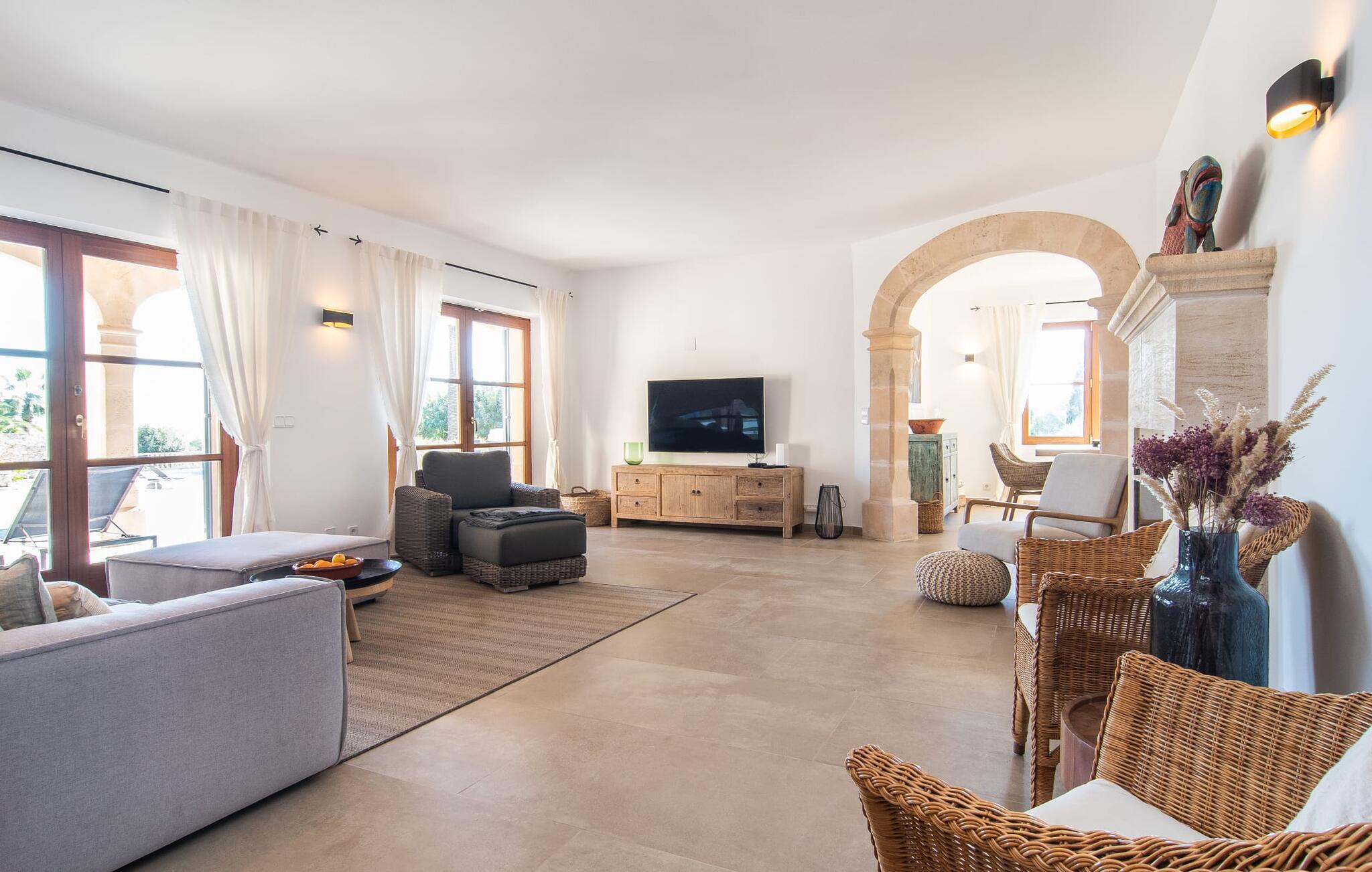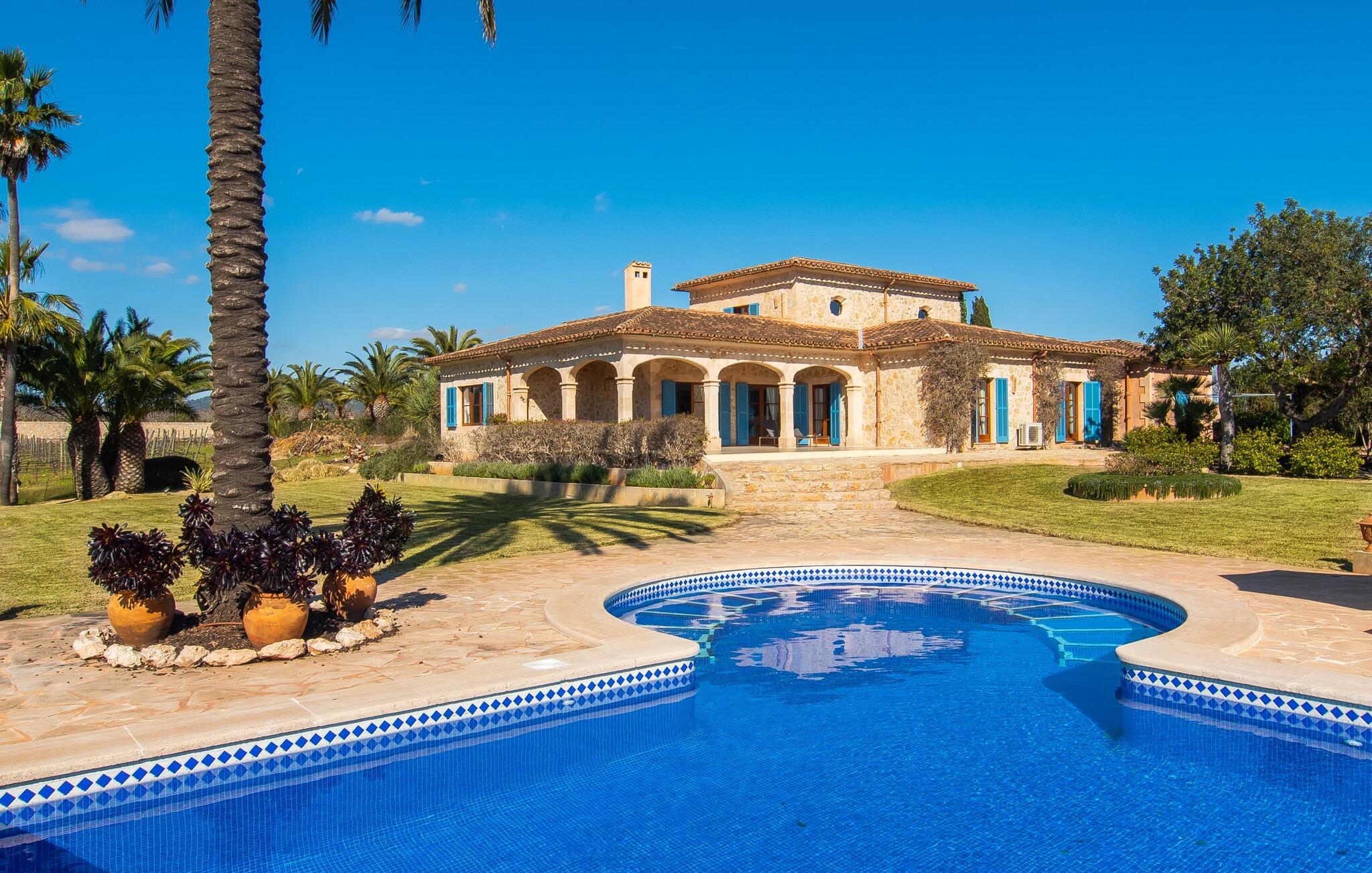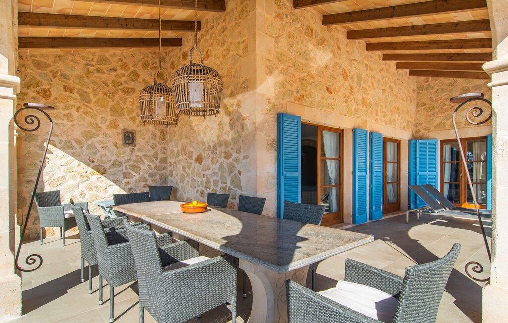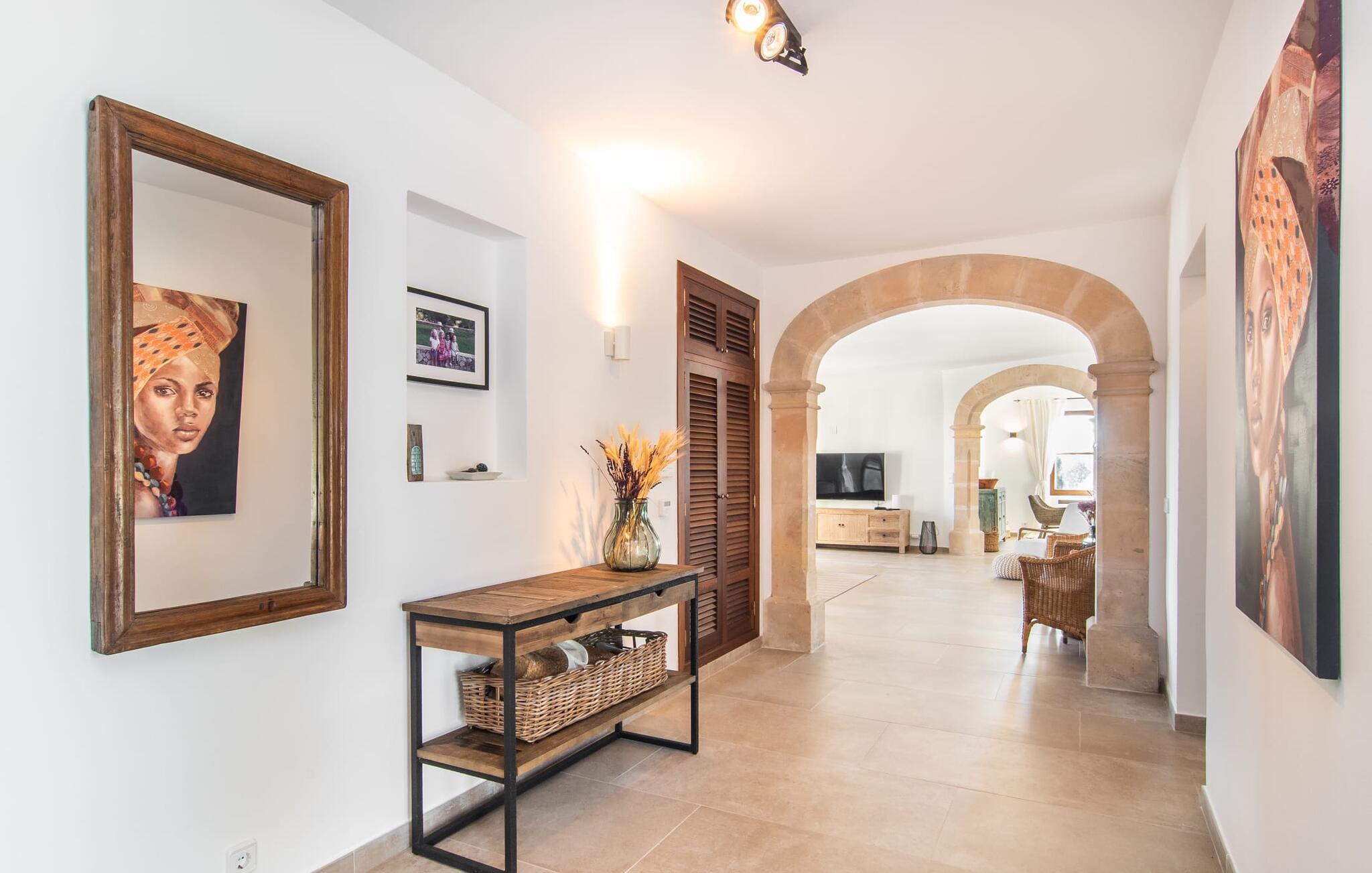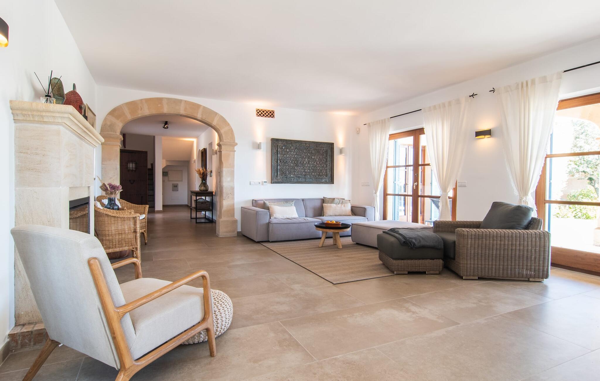 En stor, yderst velholdt have med græsplæner, høje palmer, frugttræer og middelhavsvegetation omgiver det smarte Mallorca-bondehus kaldet "Villa Anna". Der går flere stier gennem området og forbinder de forskellige rekreative områder. Lige ved siden af huset er der overdækkede terrassearealer, der giver god plads til at ligge og sidde med en smuk udsigt over haven. En grill til at grille er selvfølgelig også tilgængelig. I den 13 meter lange, let tilgængelige pool er der masser af plads til at plaske rundt eller tage nogle sporty omgange. En udendørs bruser afrunder mulighederne for at køle af udendørs. Gyngen vil have underholdningsværdi for børn, der rejser med jer. Et rigtigt højdepunkt er saunaen, der ligger i en separat bygning, til særlige wellness-øjeblikke. Der er desuden praktisk toilet og bruser. Et meget rummeligt interiør lover et højt niveau af privatliv i huset af høj kvalitet. Store gulvfliser, behagelig belysning og harmonisk afstemte møbler præger den behagelige, meget stilfulde atmosfære. I stueetagen er der et åbent, fuldt udstyret køkken, en hyggelig stue og en rummelig spisestue. Der er også tre soveværelser (et med eget badeværelse), et vaskerum og et andet badeværelse på dette niveau. Endnu et soveværelse med eget brusebad og udgang til altanen ligger på øverste etage af dette smagfulde bondehus på Mallorca. Tilstedeværelsen af en pejs og gulvvarme gør at bo her absolut indbydende og behageligt året rundt. Det smarte bondehus "Villa Anna" er roligt beliggende på en stor grund i det sydlige Mallorca. Den smukke kystby Cala D'Or ligger kun 5 minutter væk i bil. I bil kan I nå flere attraktive bugter. Parkeringspladsen til Cala Sa Nau eller Cala Mitjana kan nås på 15 minutter.