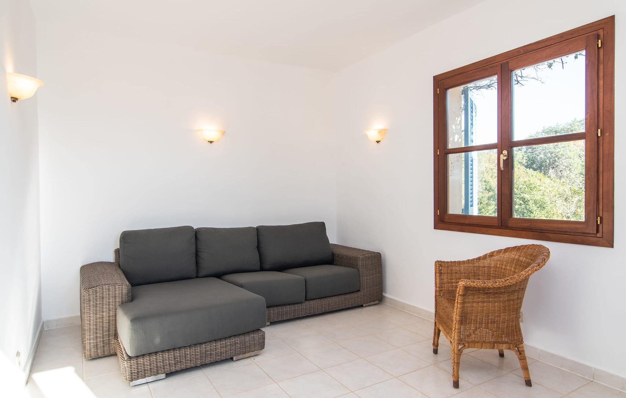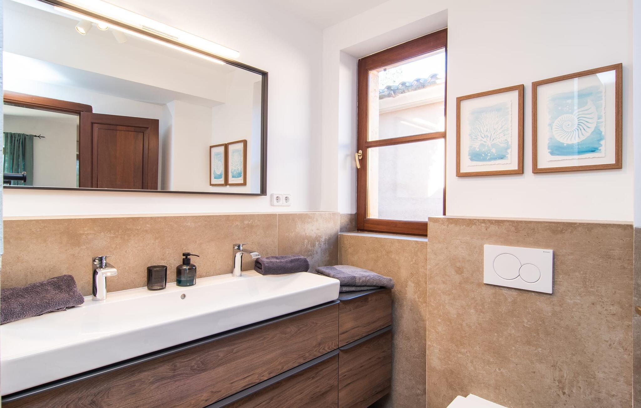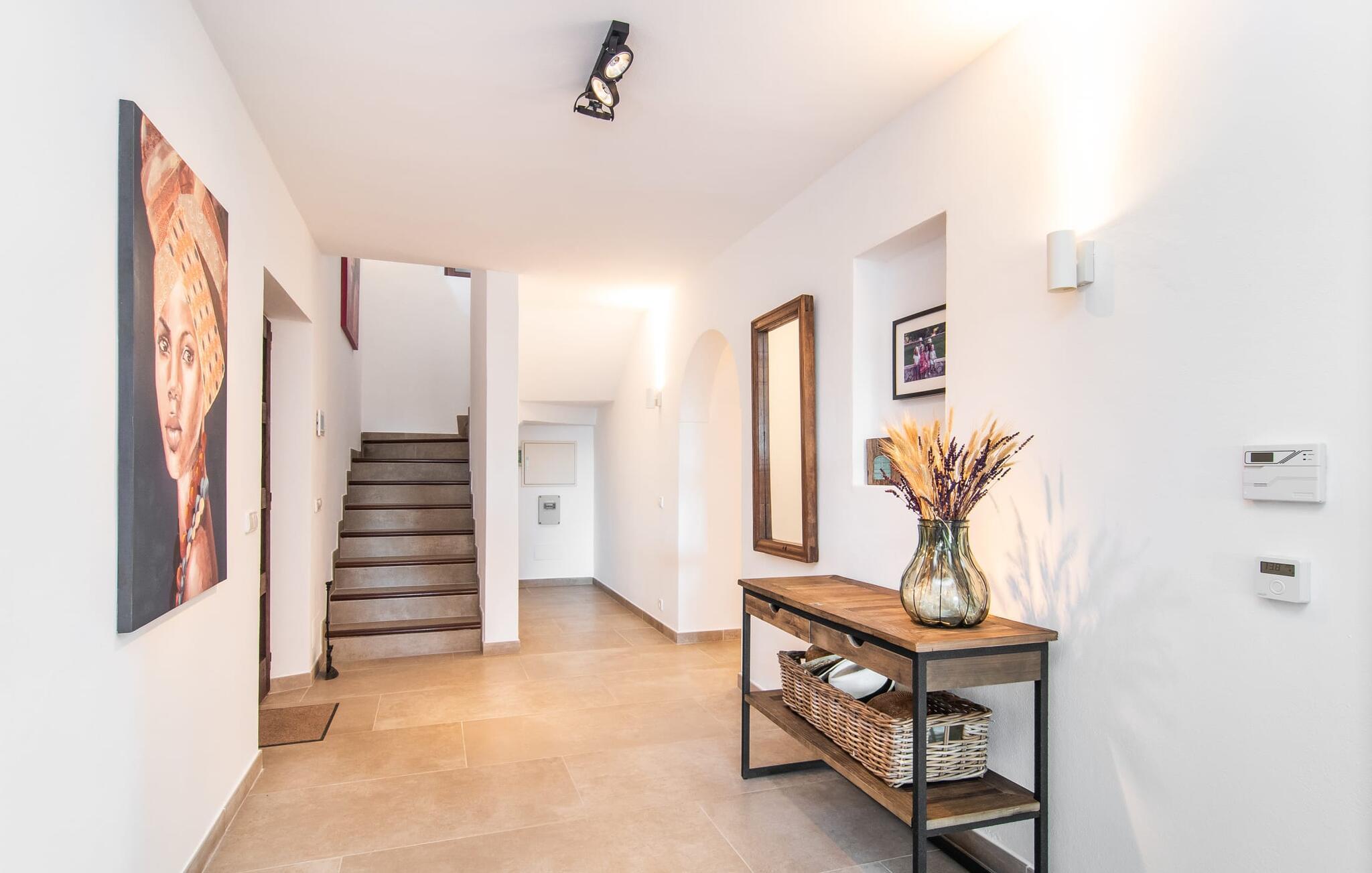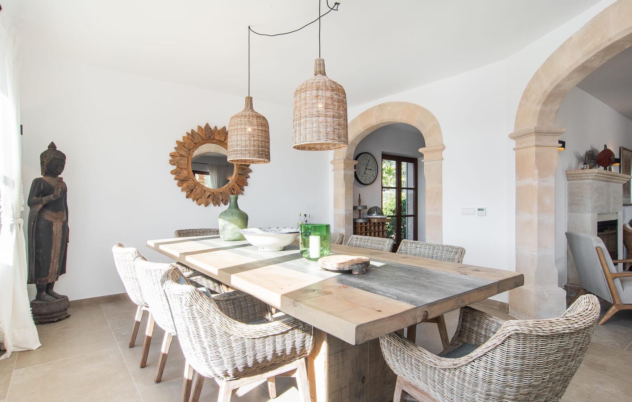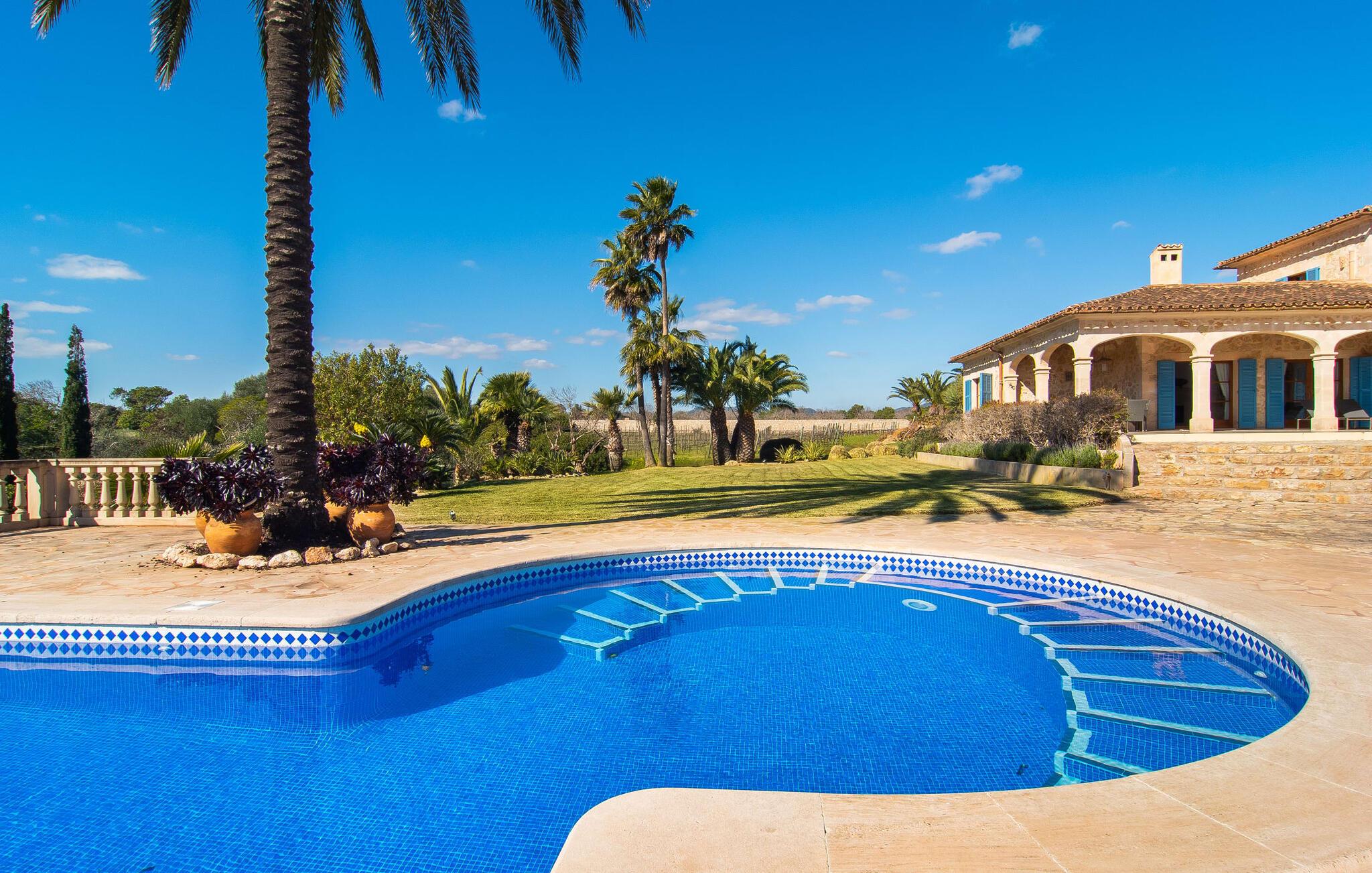 En stor, yderst velholdt have med græsplæner, høje palmer, frugttræer og middelhavsvegetation omgiver det smarte Mallorca-bondehus kaldet "Villa Anna". Der går flere stier gennem området og forbinder de forskellige rekreative områder. Lige ved siden af huset er der overdækkede terrassearealer, der giver god plads til at ligge og sidde med en smuk udsigt over haven. En grill til at grille er selvfølgelig også tilgængelig. I den 13 meter lange, let tilgængelige pool er der masser af plads til at plaske rundt eller tage nogle sporty omgange. En udendørs bruser afrunder mulighederne for at køle af udendørs. Gyngen vil have underholdningsværdi for børn, der rejser med jer. Et rigtigt højdepunkt er saunaen, der ligger i en separat bygning, til særlige wellness-øjeblikke. Der er desuden praktisk toilet og bruser. Et meget rummeligt interiør lover et højt niveau af privatliv i huset af høj kvalitet. Store gulvfliser, behagelig belysning og harmonisk afstemte møbler præger den behagelige, meget stilfulde atmosfære. I stueetagen er der et åbent, fuldt udstyret køkken, en hyggelig stue og en rummelig spisestue. Der er også tre soveværelser (et med eget badeværelse), et vaskerum og et andet badeværelse på dette niveau. Endnu et soveværelse med eget brusebad og udgang til altanen ligger på øverste etage af dette smagfulde bondehus på Mallorca. Tilstedeværelsen af en pejs og gulvvarme gør at bo her absolut indbydende og behageligt året rundt. Det smarte bondehus "Villa Anna" er roligt beliggende på en stor grund i det sydlige Mallorca. Den smukke kystby Cala D'Or ligger kun 5 minutter væk i bil. I bil kan I nå flere attraktive bugter. Parkeringspladsen til Cala Sa Nau eller Cala Mitjana kan nås på 15 minutter.