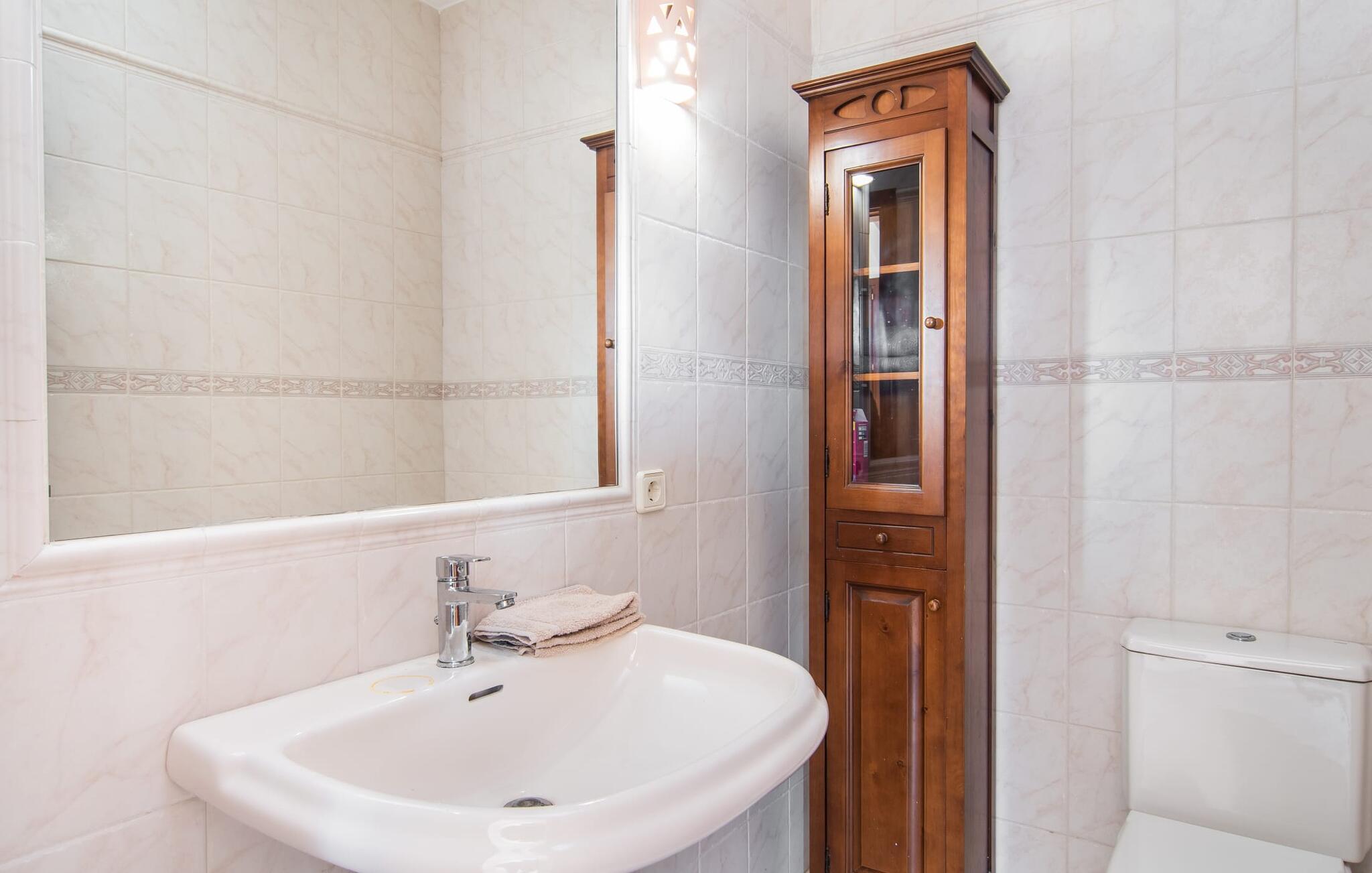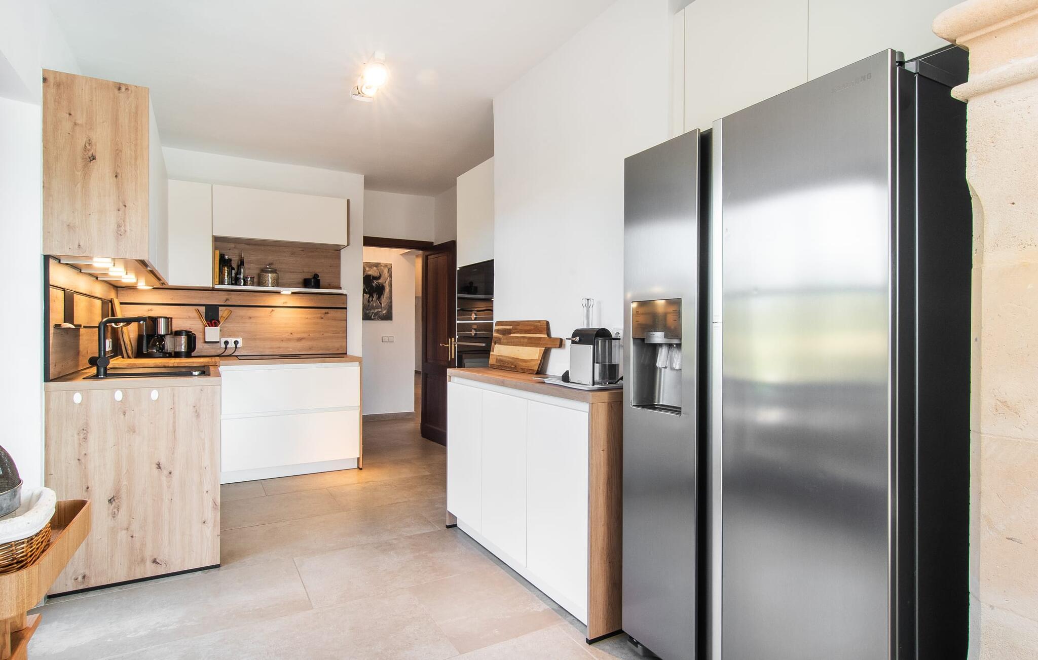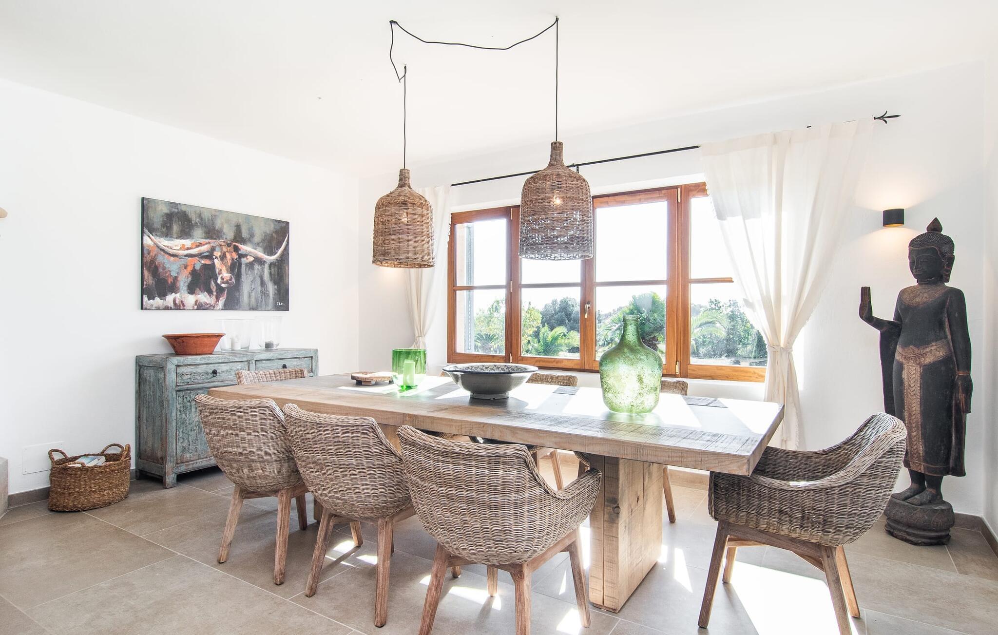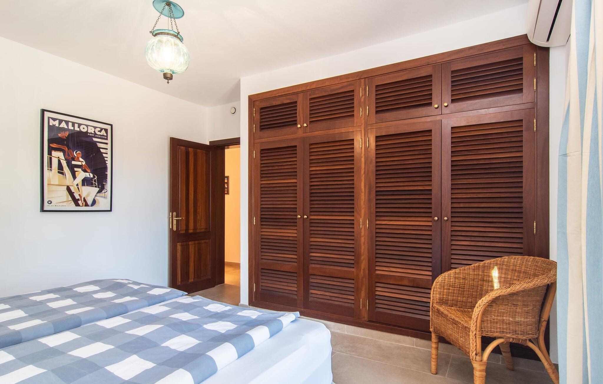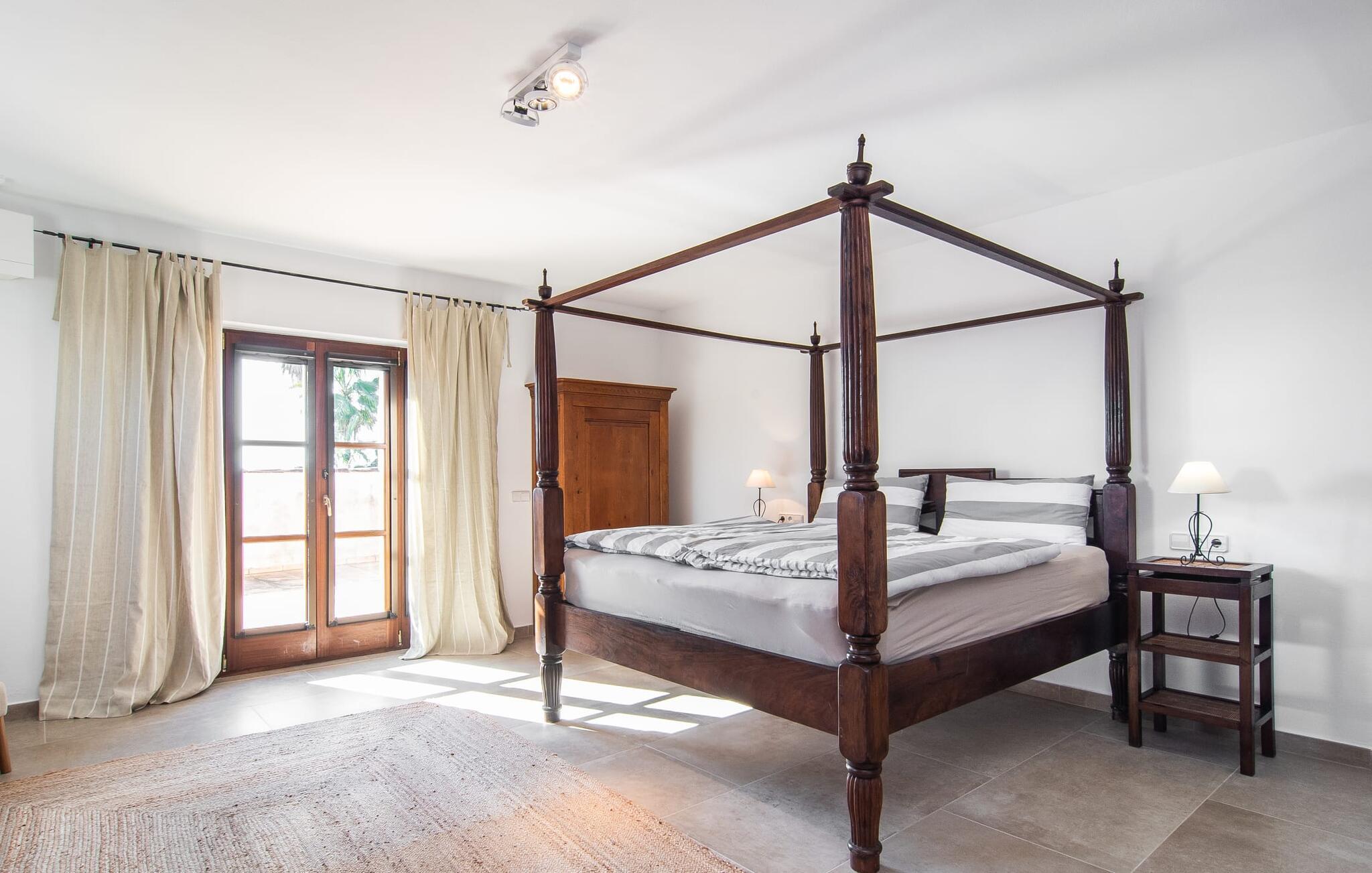 En stor, yderst velholdt have med græsplæner, høje palmer, frugttræer og middelhavsvegetation omgiver det smarte Mallorca-bondehus kaldet "Villa Anna". Der går flere stier gennem området og forbinder de forskellige rekreative områder. Lige ved siden af huset er der overdækkede terrassearealer, der giver god plads til at ligge og sidde med en smuk udsigt over haven. En grill til at grille er selvfølgelig også tilgængelig. I den 13 meter lange, let tilgængelige pool er der masser af plads til at plaske rundt eller tage nogle sporty omgange. En udendørs bruser afrunder mulighederne for at køle af udendørs. Gyngen vil have underholdningsværdi for børn, der rejser med jer. Et rigtigt højdepunkt er saunaen, der ligger i en separat bygning, til særlige wellness-øjeblikke. Der er desuden praktisk toilet og bruser. Et meget rummeligt interiør lover et højt niveau af privatliv i huset af høj kvalitet. Store gulvfliser, behagelig belysning og harmonisk afstemte møbler præger den behagelige, meget stilfulde atmosfære. I stueetagen er der et åbent, fuldt udstyret køkken, en hyggelig stue og en rummelig spisestue. Der er også tre soveværelser (et med eget badeværelse), et vaskerum og et andet badeværelse på dette niveau. Endnu et soveværelse med eget brusebad og udgang til altanen ligger på øverste etage af dette smagfulde bondehus på Mallorca. Tilstedeværelsen af en pejs og gulvvarme gør at bo her absolut indbydende og behageligt året rundt. Det smarte bondehus "Villa Anna" er roligt beliggende på en stor grund i det sydlige Mallorca. Den smukke kystby Cala D'Or ligger kun 5 minutter væk i bil. I bil kan I nå flere attraktive bugter. Parkeringspladsen til Cala Sa Nau eller Cala Mitjana kan nås på 15 minutter.