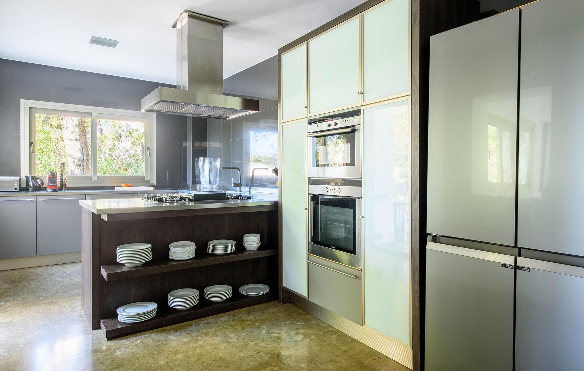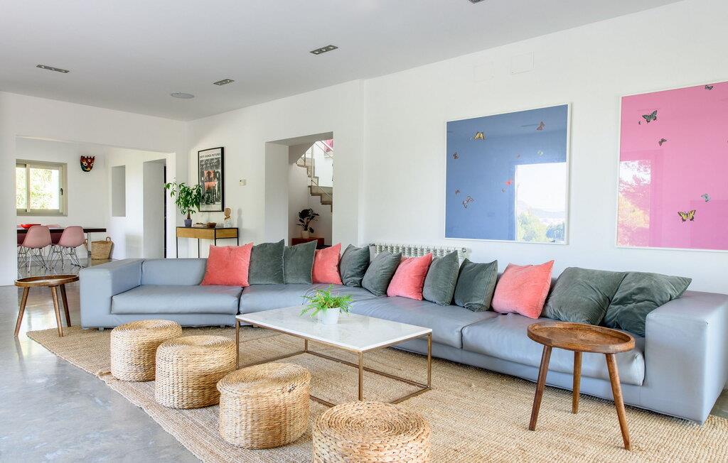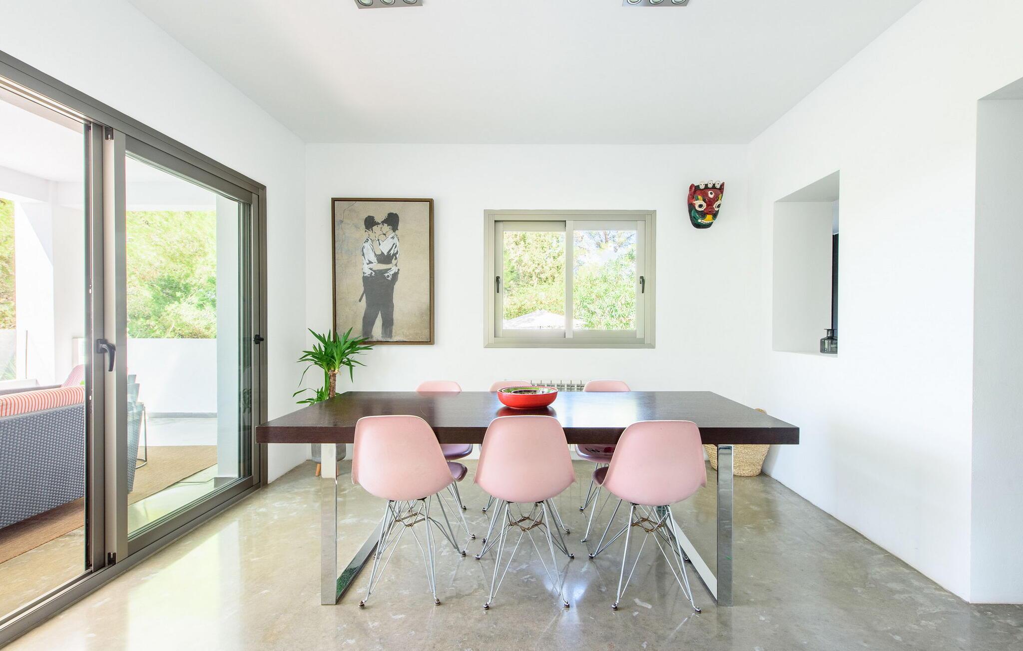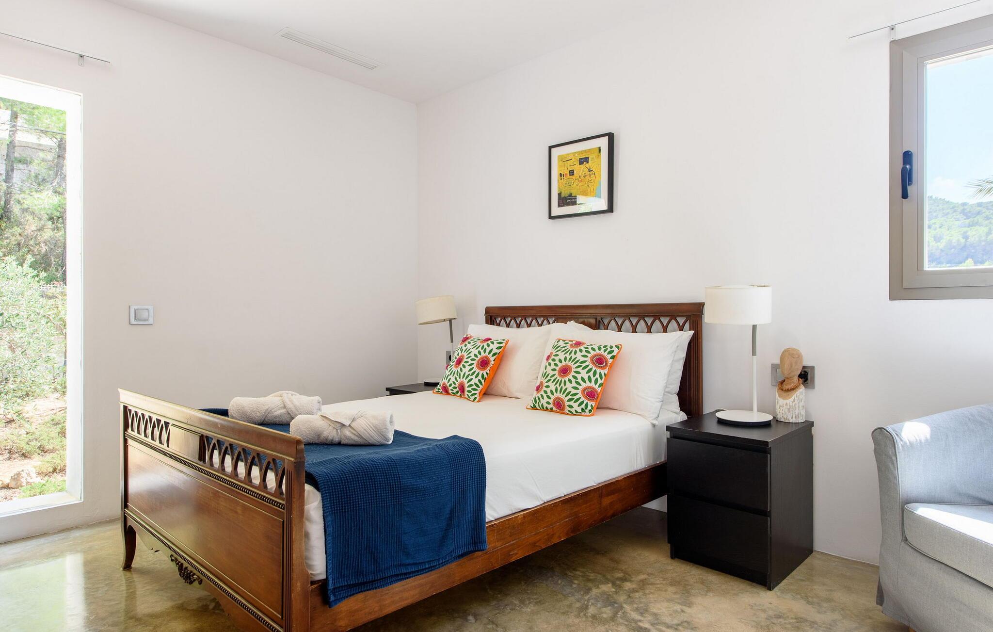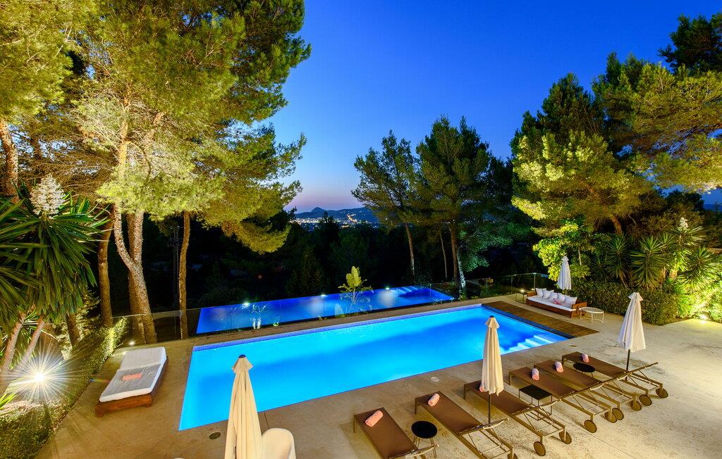 Denne fantastiske villa strækker sig over 400m² på en 2.600m² grund og er designet til ultimativ luksus og komfort. Beliggende nær San Agustín, tilbyder det privatliv og afsondrethed og er kun en kort køretur fra San José, Ibiza by og øens lufthavn. San Josés strande, såsom Es Torrent, Es Xarcu og Cala Jondal, er også inden for rækkevidde. Villaen er omgivet af et naturreservat og tilbyder en rolig base med naturskønne vandre- og cykelstier. Dette er et Fincallorca feriehus. Indenfor er der en lys-fyldt stue med en 8 meter lang L-formet sofa og en betagende udsigt. Den private balkon med komfortable siddepladser forbinder til poolen, terrassen og haven. Den elegante spisestue åbner ud til en overdækket udendørs terrasse med lænestole - perfekt til at slappe af med en bog eller nyde solnedgangscocktails. Der er et 42" plasma-tv med Sky, en dvd-afspiller og et iPod-kompatibelt lydsystem med integrerede DAS-højttalere. Villaen byder på smukt møblerede værelser med moderne indretning og bløde senge. Det store soveværelse har en king-size seng, et en-suite badeværelse med en dobbelt bruser og badekar samt en privat terrasse med en betagende udsigt. Soveværelse to har også en-suite badeværelse, en dobbeltseng og en terrasse. De ekstra soveværelser har en blanding af dobbeltsenge og to enkeltsenge, betjent af to fælles badeværelser. Udenfor i haven er der appelsin-, citron- og mandeltræer. Et spiseområde og flere terrasser giver idylliske steder til udendørs spisning eller stille afslapning. Der er en garage og et bryggers, hvor der er en 8 kg vaskemaskine og tørretumbler. Villaen er sikret med et bevægelsesdetektor alarmsystem. Rengøring hver 7. nat, med skift af sengelinned og håndklæder.