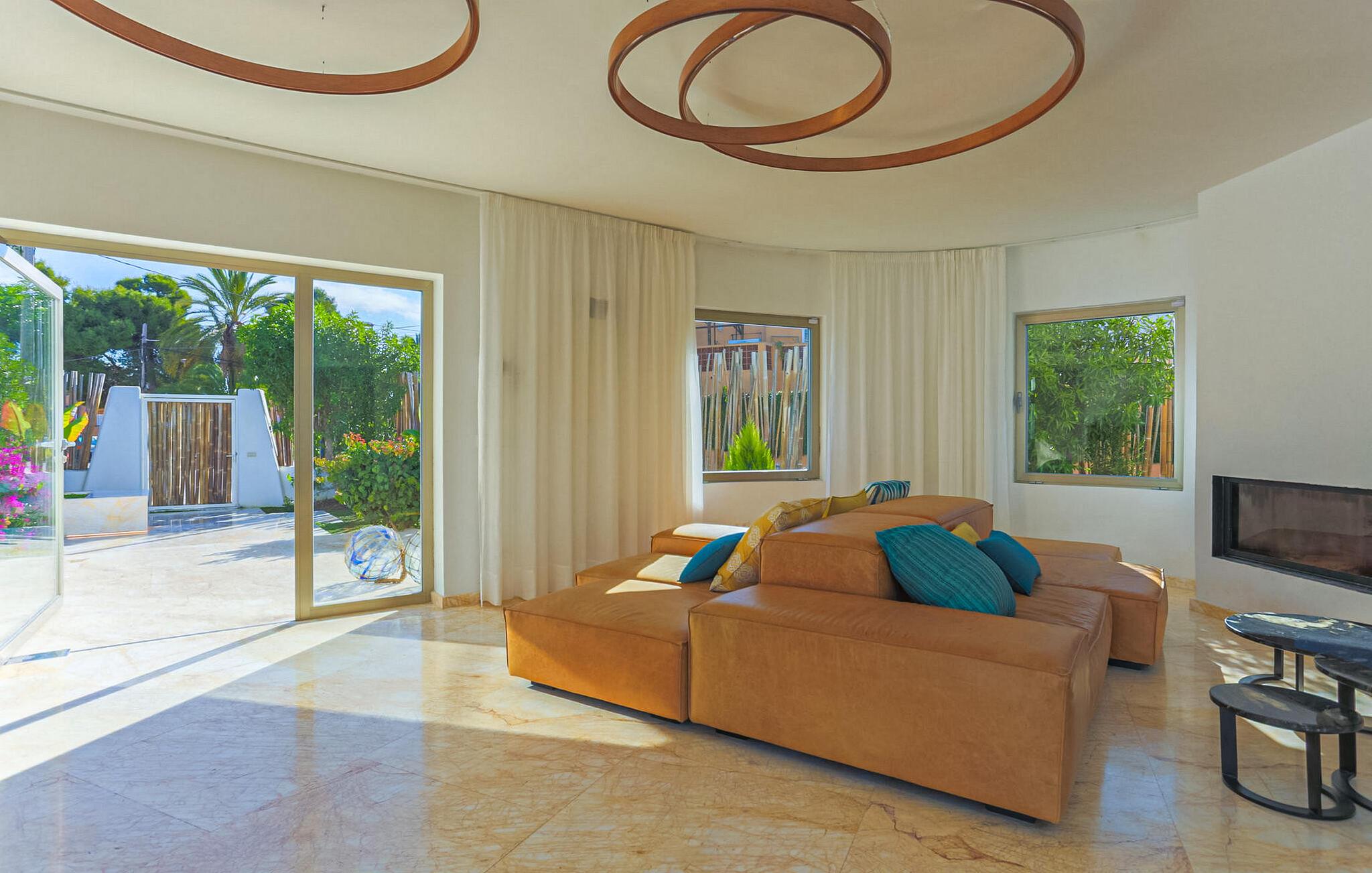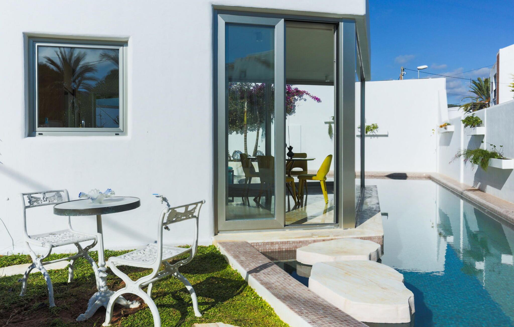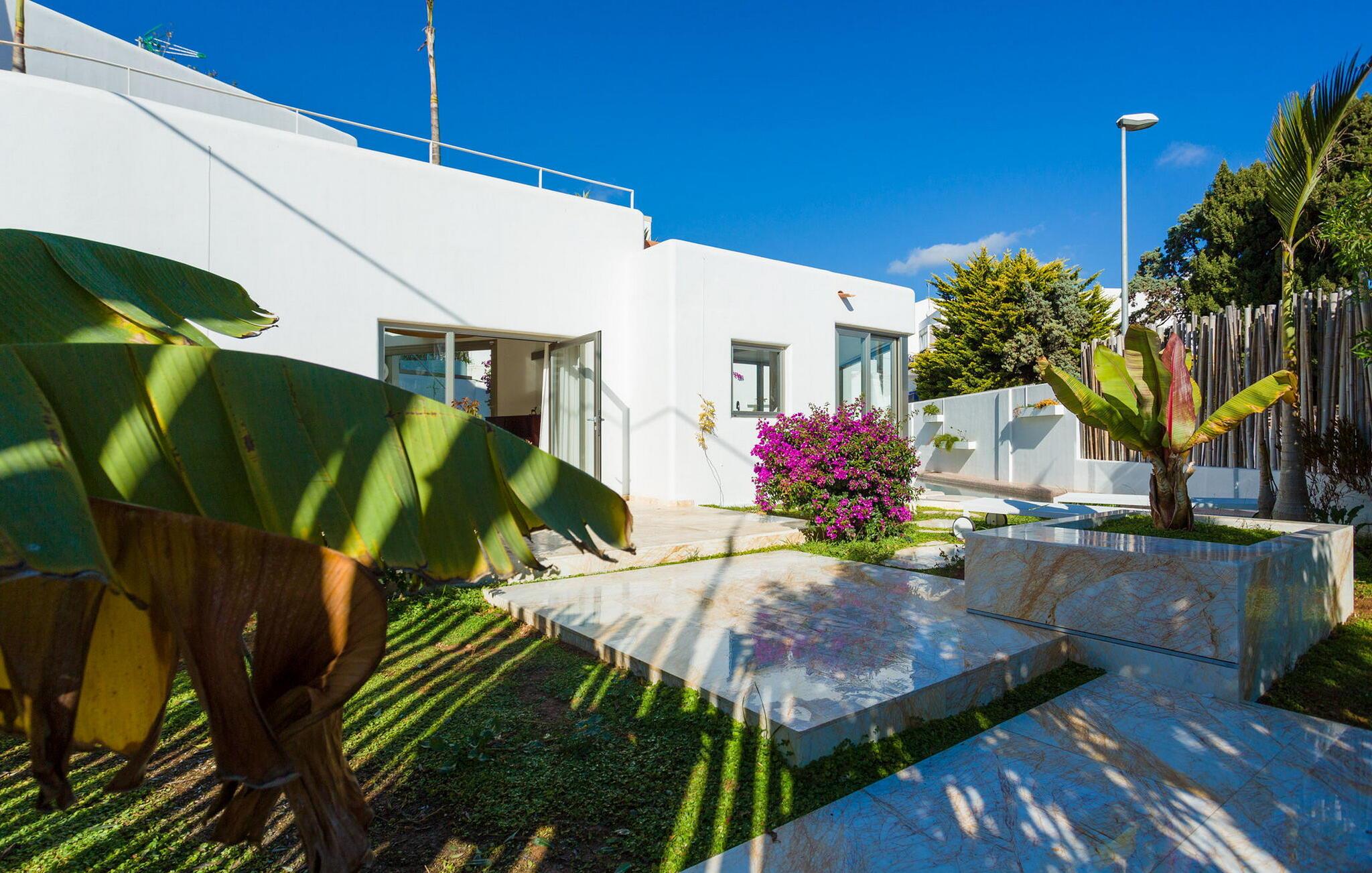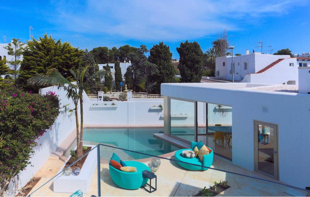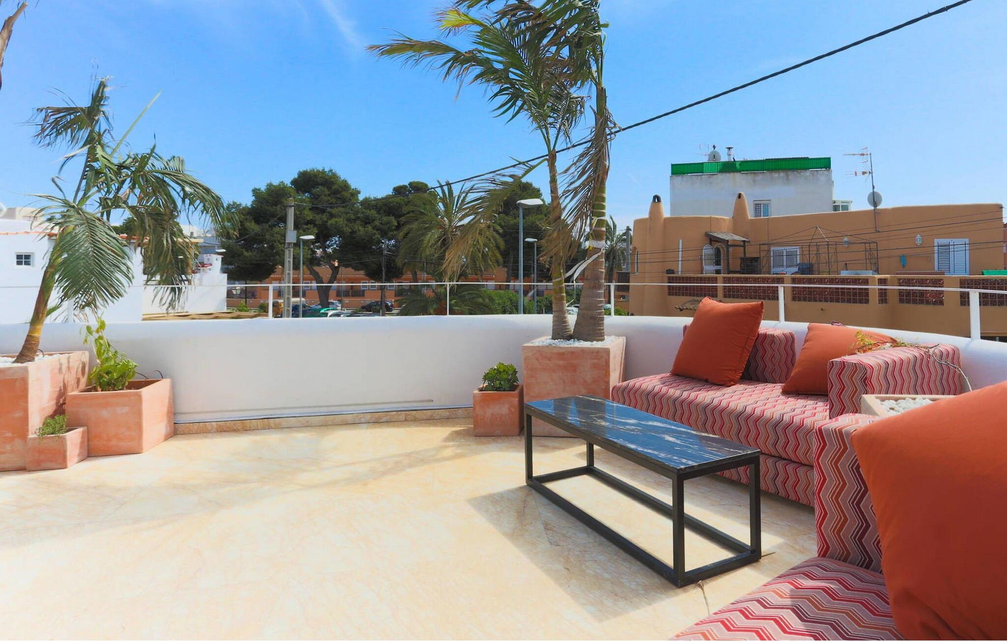 Beliggende i centrum af Playa d'en Bossa, kun 2 minutters gang fra butikker, barer, restauranter, klubber og den omfattende strand. Denne smukke luksusvilla er perfekt til grupper og familier, der ikke ønsker at leje en bil og foretrækker at være tæt på alt. Dette er et Fincallorca feriehus. Det har et moderne, udstyret og lyst køkken med udsigt over en utrolig pool, der strækker sig over hele huset. En stor stue med pejs og en vindeltrappe, der fører til første sal. I stueetagen er der et soveværelse med eget brusebad. Et soveværelse med dobbeltseng. Et badeværelse med bruser. Der er yderligere 2 soveværelser på første sal. Det store soveværelse har et utroligt marmorbadekar i midten af rummet. Og endnu et soveværelse med dobbeltseng. Badeværelse med bruser. Begge soveværelser har adgang til en terrasse med udsigt over poolen og haven. Denne terrasse har en bar og sofaer til at slappe af og nyde.