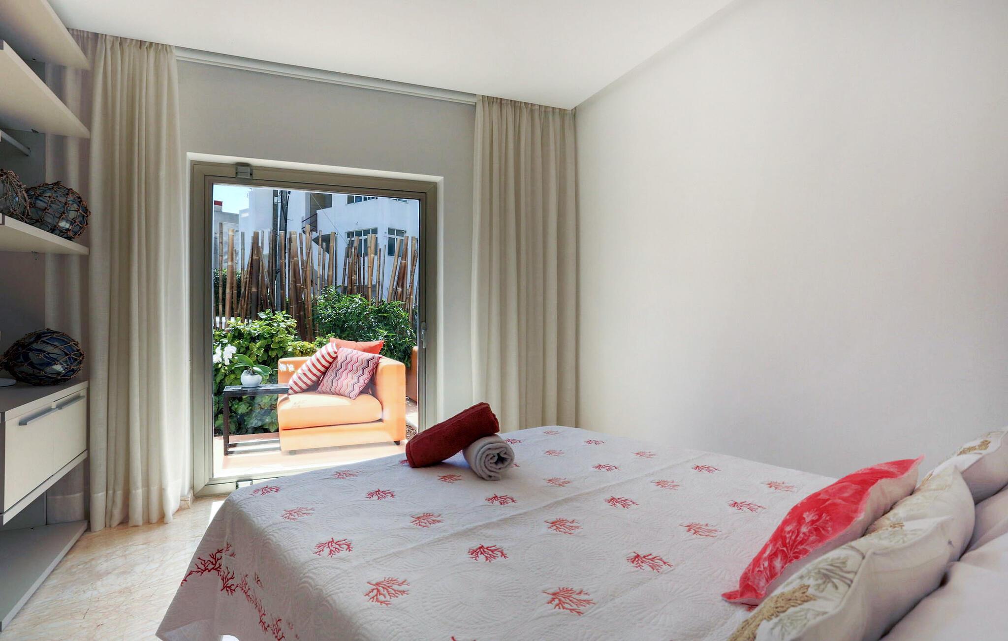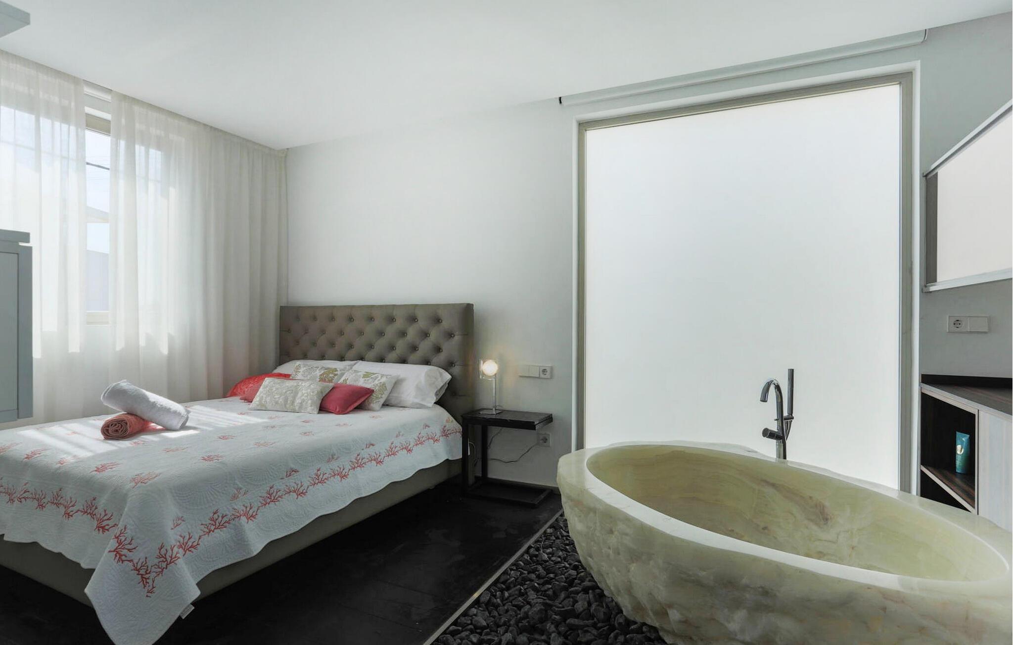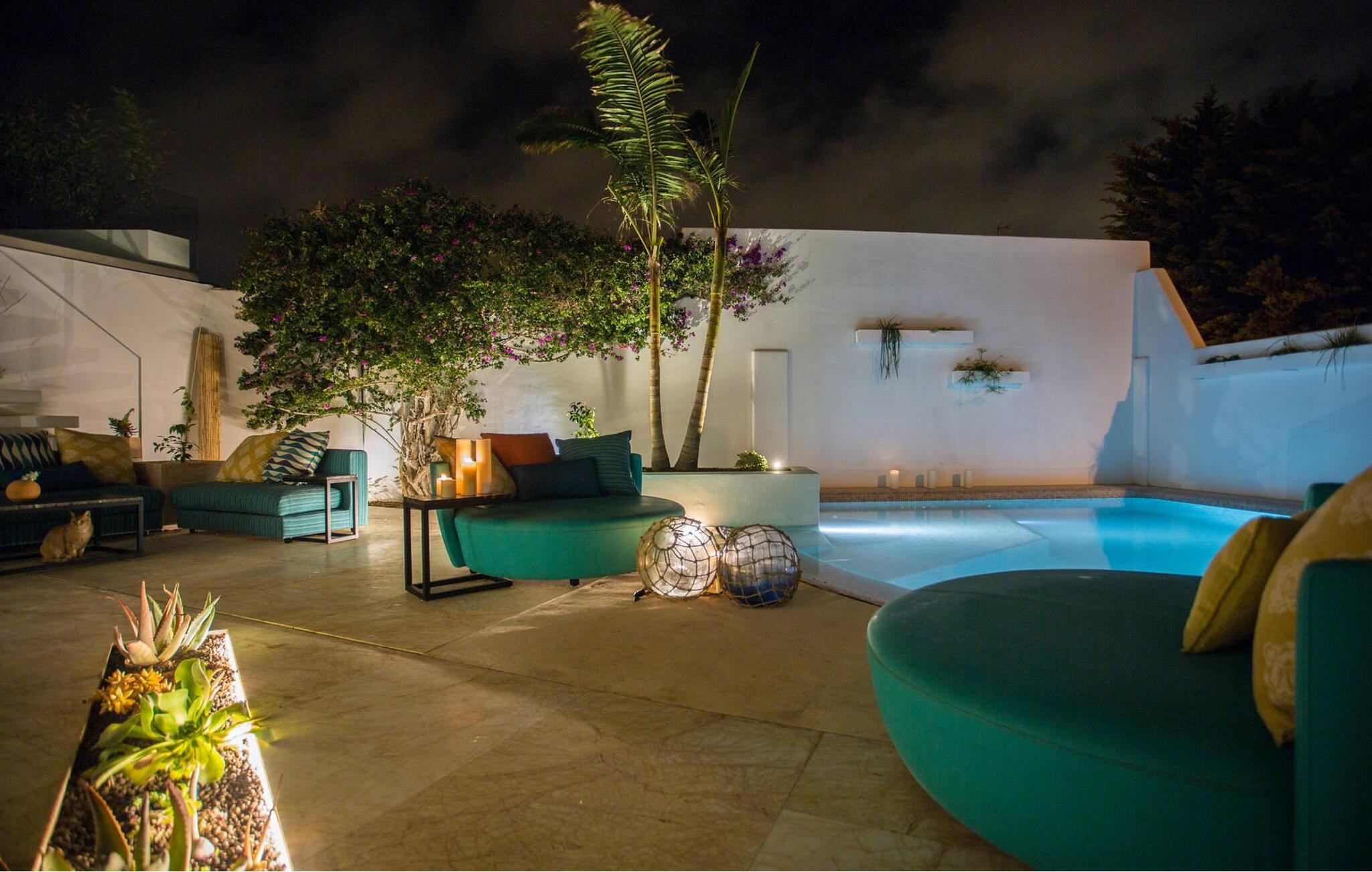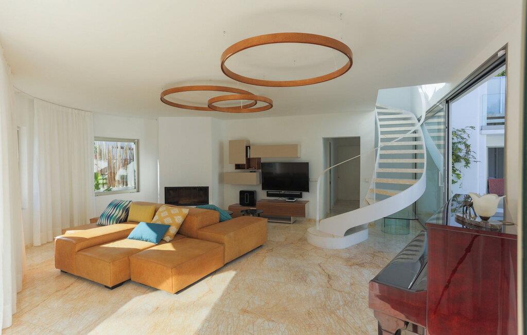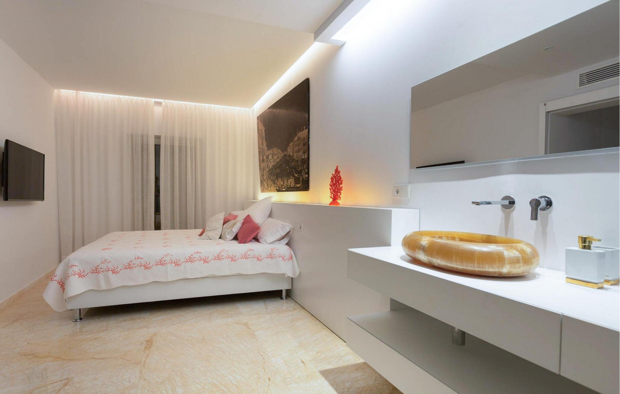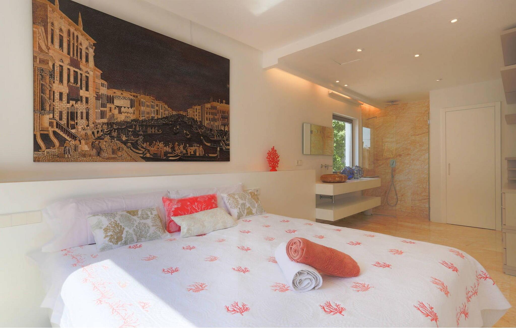 Beliggende i centrum af Playa d'en Bossa, kun 2 minutters gang fra butikker, barer, restauranter, klubber og den omfattende strand. Denne smukke luksusvilla er perfekt til grupper og familier, der ikke ønsker at leje en bil og foretrækker at være tæt på alt. Dette er et Fincallorca feriehus. Det har et moderne, udstyret og lyst køkken med udsigt over en utrolig pool, der strækker sig over hele huset. En stor stue med pejs og en vindeltrappe, der fører til første sal. I stueetagen er der et soveværelse med eget brusebad. Et soveværelse med dobbeltseng. Et badeværelse med bruser. Der er yderligere 2 soveværelser på første sal. Det store soveværelse har et utroligt marmorbadekar i midten af rummet. Og endnu et soveværelse med dobbeltseng. Badeværelse med bruser. Begge soveværelser har adgang til en terrasse med udsigt over poolen og haven. Denne terrasse har en bar og sofaer til at slappe af og nyde.