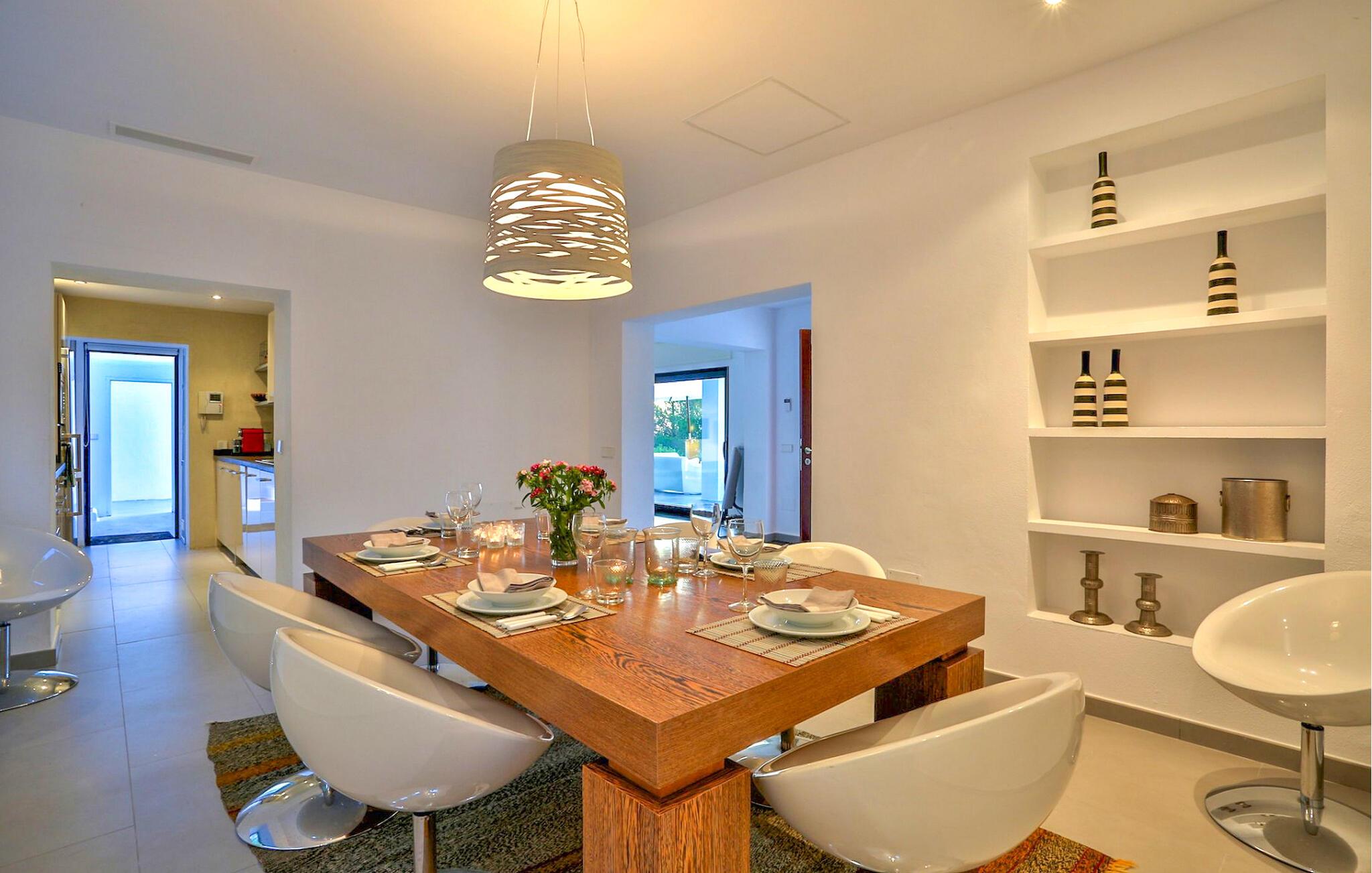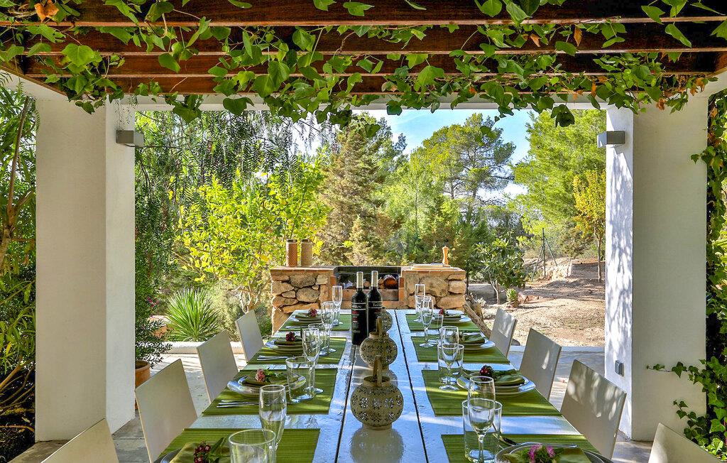 Denne storslåede villa er fordelt på 2 etager og byder på en storslået udsigt over havet, solnedgangen og bugten Cala Tarida, på Ibizas maleriske vestkyst. Dette er et Fincallorca feriehus. Omgivet af en grund på 5000m2, har denne 300m2 bygget villa 3 soveværelser med dobbeltsenge (1,80 x 2m eller 2x2m) og et med 2 enkeltsenge, alle velindrettede, rummelige og lyse med store indbyggede skabe. Der er i alt 4 badeværelser, 3 med bruser og 1 med badekar. Et af dobbeltværelserne har separat indgang fra terrassen og en-suite badeværelse med bruser, hvilket gør det ideelt for alle i gruppen, der ønsker lidt mere plads og privatliv. Stuen har moderne faciliteter såsom satellit-tv, hjemmebiograf og WiFi og tilbyder direkte adgang til terrassen. Køkkenet er fuldt udstyret til nutidens livsstil, med vaskemaskine, tørretumbler, køleskab og opvaskemaskine, for at nævne nogle af de mange faciliteter. Denne villa har aircondition og centralvarme. Den er udstyret med solpaneler. Udenfor finder vi en smuk infinity-pool med saltvand, der måler 10m x 6m. Der er markiser til at skabe skyggefulde områder og en udendørs spiseplads under en romantisk pergola. Der er en grill og endda et chill out område til at slappe af efter jeres måltid. Baggrunden af fyrreskove og en betagende udsigt over Middelhavet gør denne villa til et perfekt sted at nyde de varme aftener i autentisk Ibiza-stil. Priserne inkluderer komplet rengøring hver 7. nat med skift af sengelinned og håndklæder. Daglig rengøring (3 timer) undtagen søndage, med håndklædeskift i løbet af ugen. GRILLEN KAN IKKE ANVENDES I JULI OG AUGUST.
