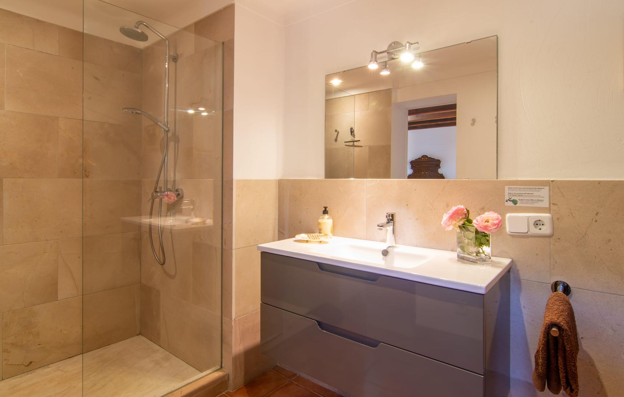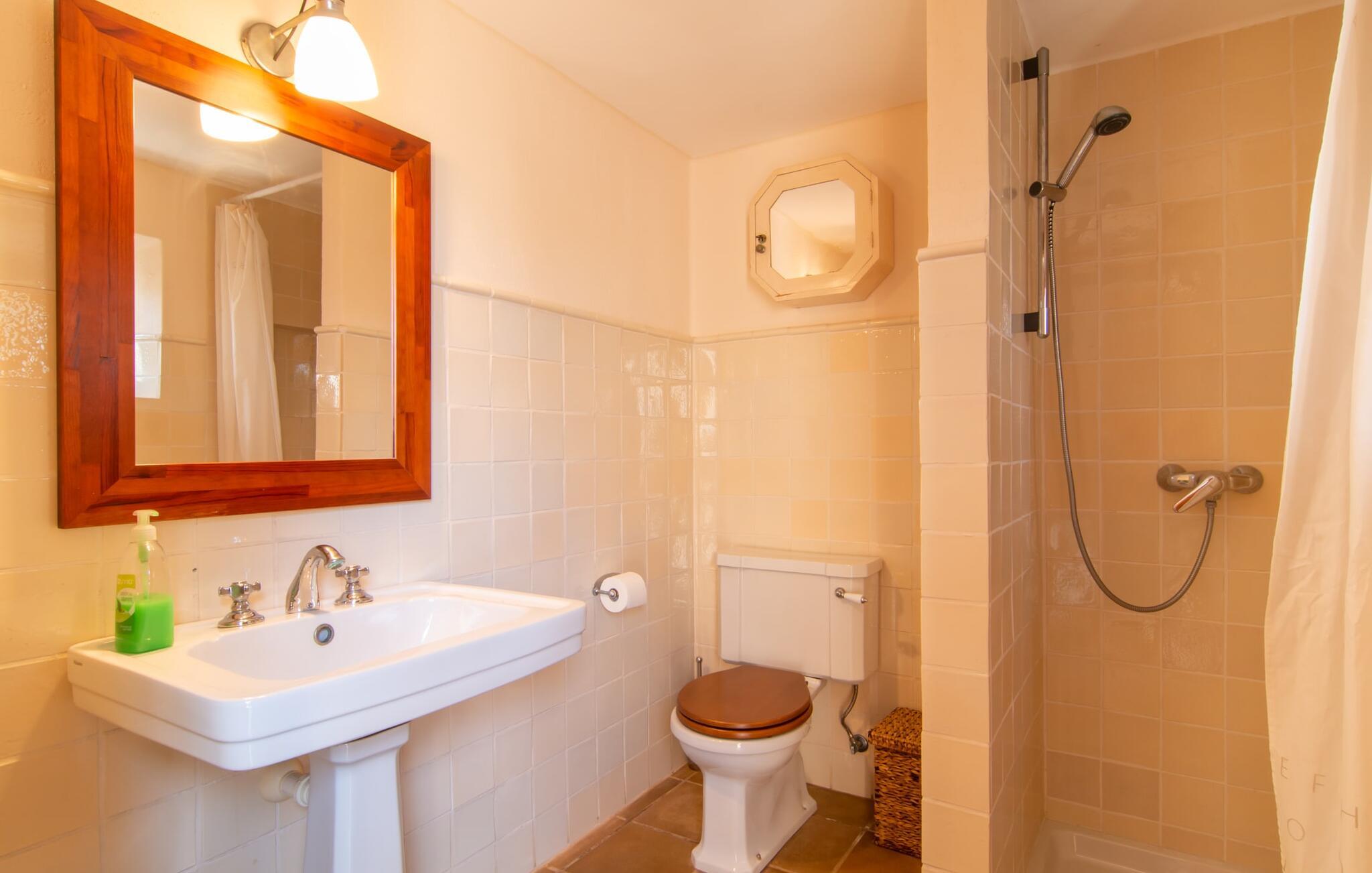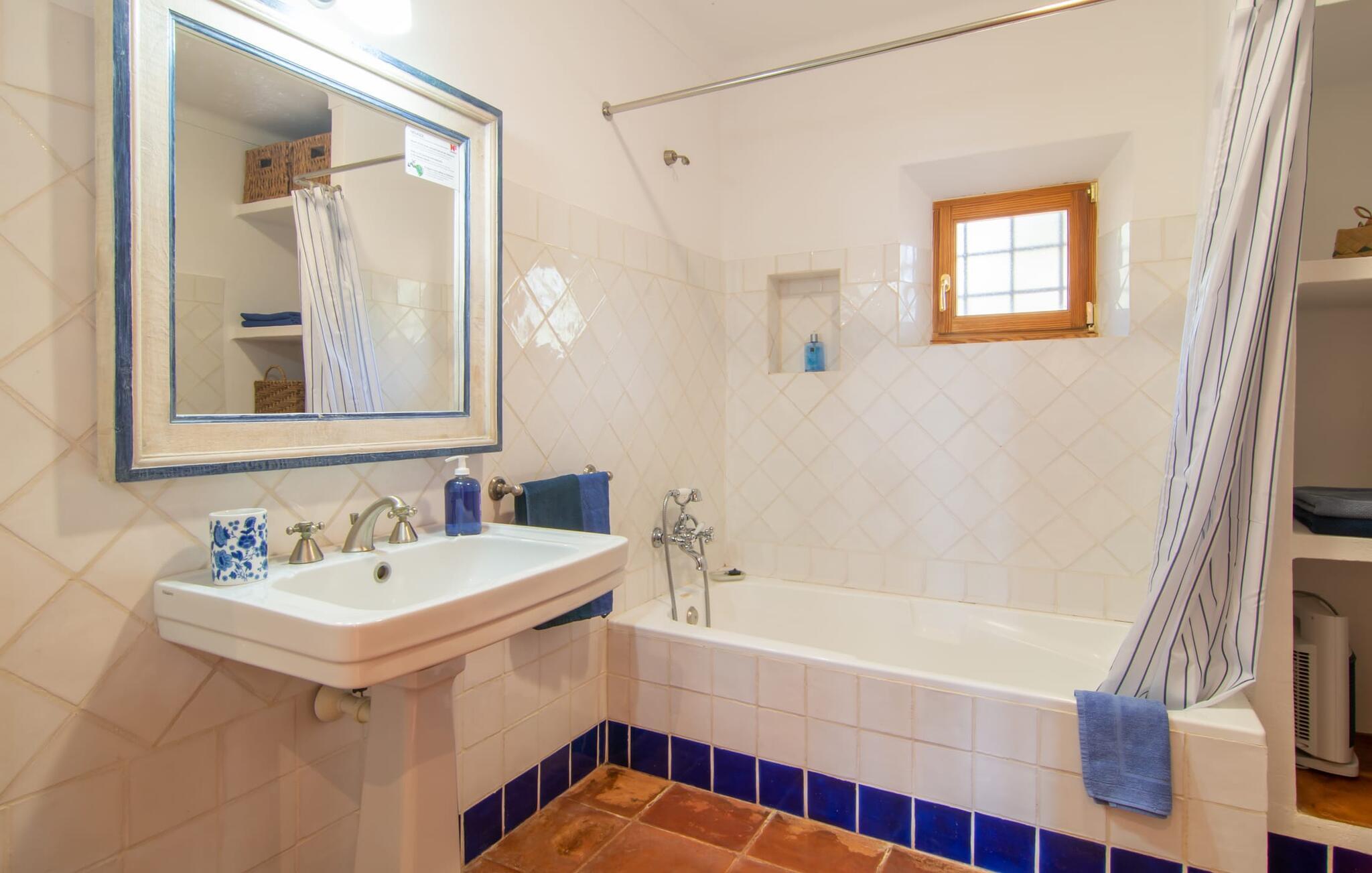 Et attraktivt alternativ til at svømme i havet er den glitrende turkisgrønne pool lige ved siden af huset. Poolen måler 10 x 5 m - plads nok til at svømme et par længder om morgenen inden morgenmaden. I kan derefter få jeres første måltid på dagen på den solbeskinnede terrasse, hvor der er to siddepladser til rådighed for jer. Et naturligt tag lavet af klatreplanter giver lidt skygge. Der er liggestole til rådighed både på denne terrasse og lige ved siden af poolen, så I fuldt ud kan nyde den vidunderlige udsigt. Haven ligger på en mark omgivet af et udvalg af middelhavstræer og -buske, hvilket giver ejendommen en beskyttet karakter. Bjergkæden i baggrunden bidrager til postkortidyllen på dette fortryllende sted. Husets interiør er noget særligt med en dygtig blanding af mallorcanske rustikke indslag og moderne elegance. Den venlige, lyse farve på de naturlige trætagbjælker og det terracottafarvede gulv skaber et harmonisk ensemble. Her kan I om aftenen sætte jer ned i den hvide, behagelige sofa foran det knitrende bål. Herfra har I også udsigt til fladskærms-tv'et, som vil hjælpe jer til endelig at se de film, I længe har ønsket at se i fred. Et rustikt siddeområde i rattan med en buelampe, der spreder varmt lys, og et træbord giver ekstra siddepladser. Den store, åbne opholdsstue har også et tekøkken. Veludstyret finder I alt hvad I behøver til omfattende madlavningssessioner på højt niveau. Det enorme køleskab har nok kapacitet til at give forfriskninger selv på rigtig varme sommerdage. I sovefløjen er der tre soveværelser - hvoraf det ene har luksusen af eget badeværelse og en smukt antik dekoreret trædobbeltseng - der nemt kan rumme seks personer. Et af værelserne har to enkeltsenge. Fincaen “Villa Maria de Betlem” er - 2 km fra Betlem-bebyggelsen i den vildt romantiske, tyndt bebyggede nordøstlige del af øen - det perfekte sted at bo for alle, der ønsker at være tæt på havet. Da fincaen er godt forbundet med øens vejnet, kan der være kørestøj i det fjerne afhængig af vindretningen. Stranden Platja de Colònia de Sant Pere ligger kun 3 km væk. I fiskerlejet kan I få en bid mad langs en malerisk havnepromenade. Eller I kan køre til Artà, 15 km væk. Bemærk venligst, at denne ejendom ikke accepterer ungdomsgrupper eller polterabender. En ungdomsgruppe på denne ejendom består af personer på 26 år eller derunder. Book ikke denne ejendom, hvis I er en ungdomsgruppe eller polterabend, da jeres reservation vil blive afvist, når den er booket, hvilket også kan være tilfældet ved ankomst til ejendommen eller under jeres ophold, og I vil ikke modtage en refusion