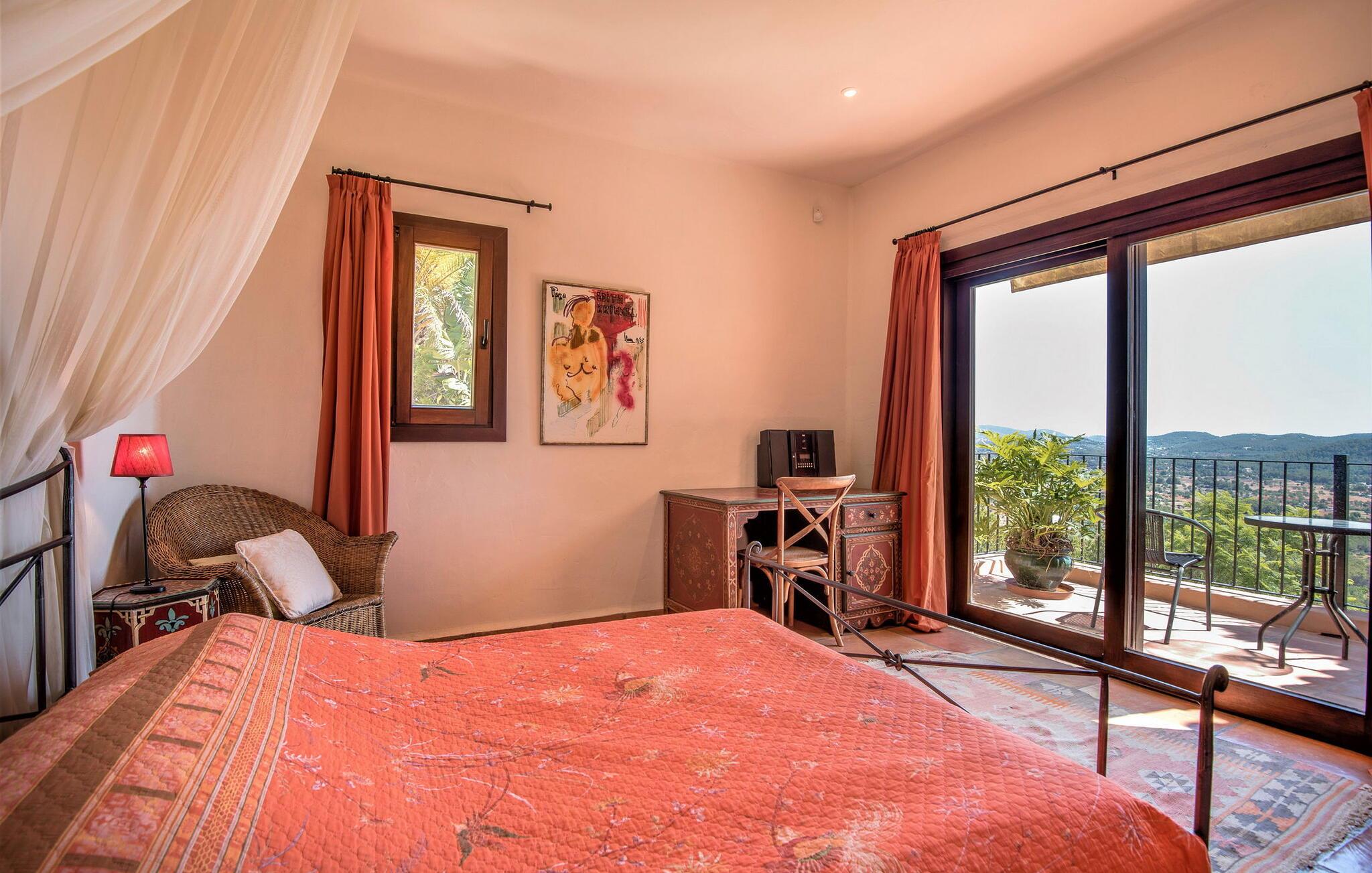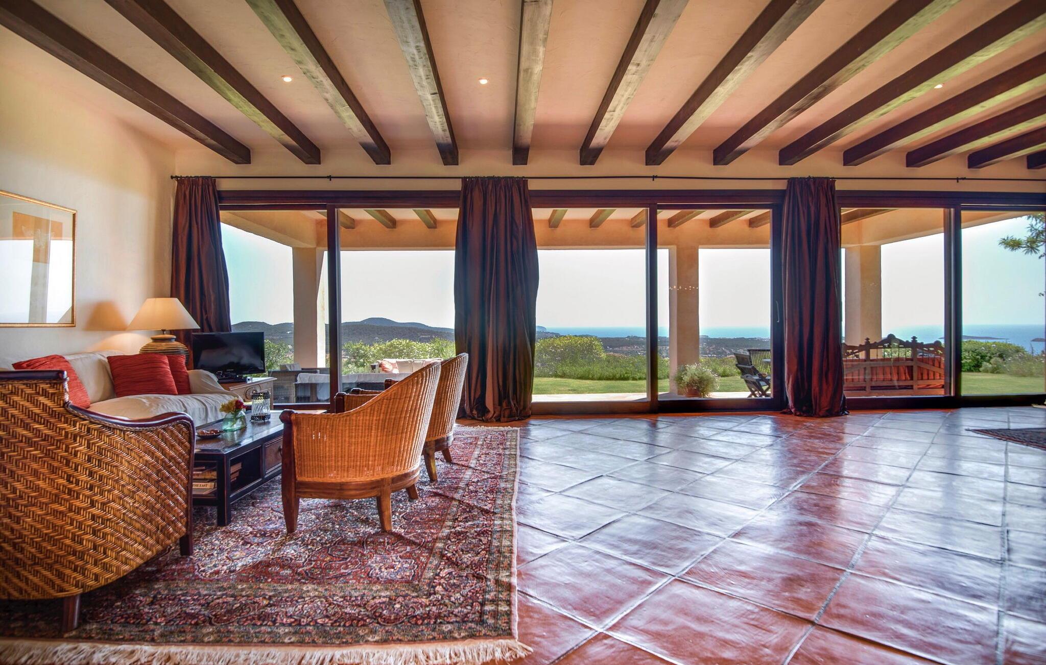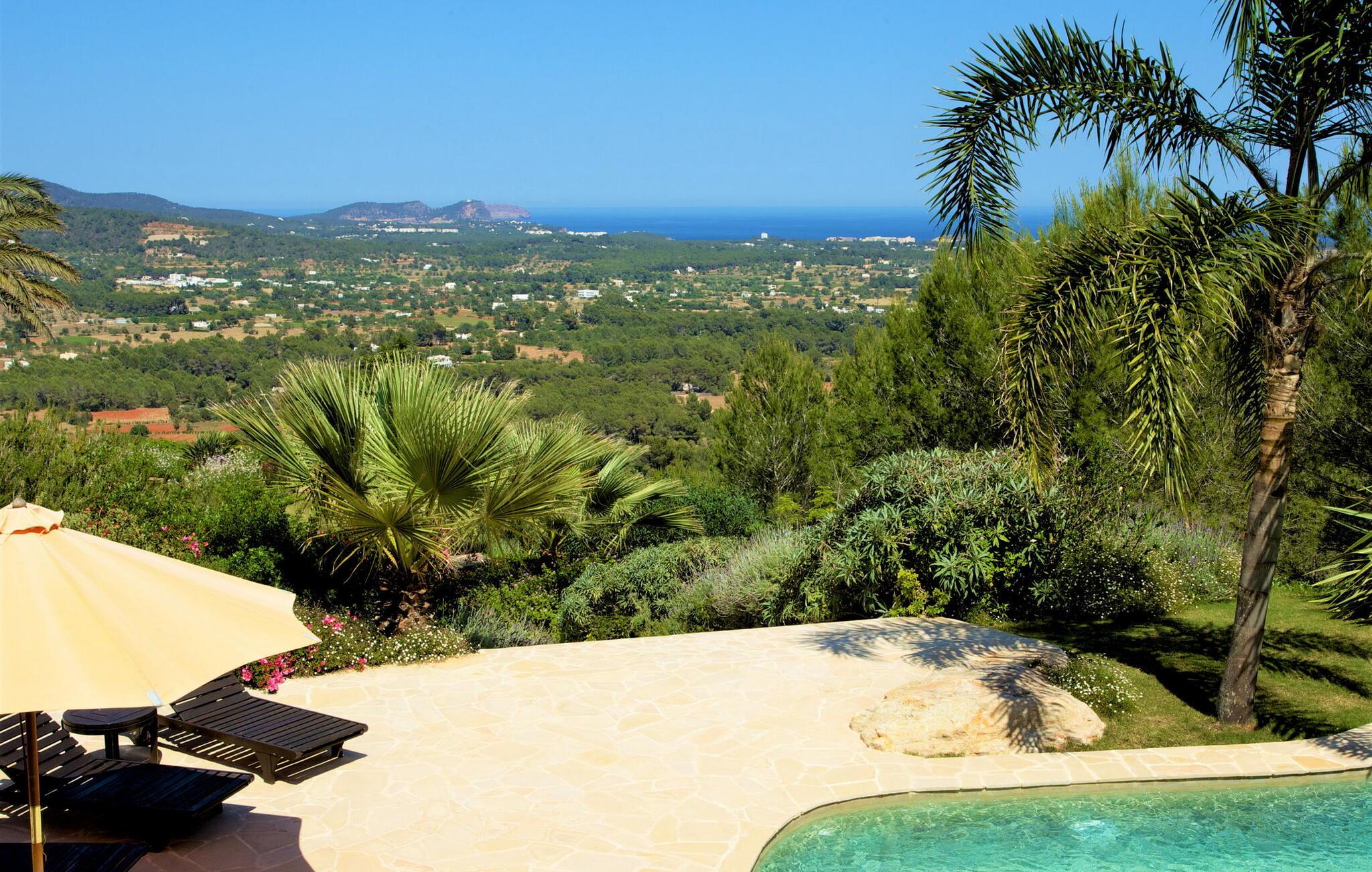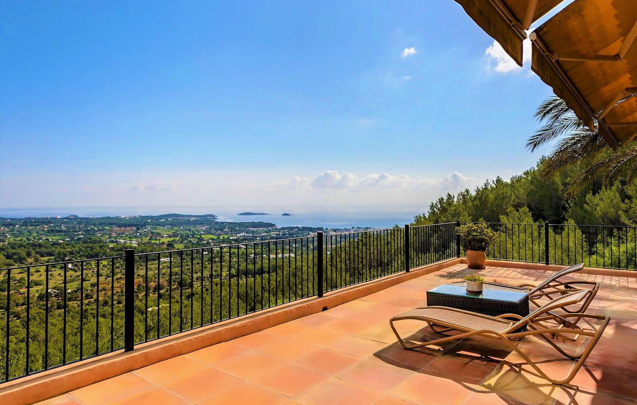 Denne fortryllende villa, beliggende på en stille bjergskråning og omgivet af 35.000 m² privat skov, tilbyder en betagende udsigt over landskabet og østkysten af Ibiza. På trods af sin rolige beliggenhed er det kun fem minutters kørsel fra den pulserende by og promenaden Santa Eulalia. Dette er et Fincallorca feriehus. En stor entré med et to-etagers glasloft byder jer velkommen i villaen og oversvømmer rummet med naturligt lys. Til højre tilbyder et arbejdsværelse med fiberoptisk internet, sofa og adgang til terrasse et roligt tilflugtssted. Til venstre er stuen med skydedøre, komfortable siddepladser, pejs, fjernsyn og stereoanlæg. Spisepladsen forbinder til et fuldt udstyret køkken med spisekammer, vaskemaskine og tørretumbler og åbner til en terrasse med have-, landskabs- og havudsigt. På denne etage er der også et soveværelse med dobbeltseng med en 160x200 cm seng, hydromassagebruser, aircondition og udgang til terrasse med havudsigt, samt et gæstetoilet. Det store soveværelse på første sal er en oase af luksus og har en 180x200 cm seng, en sofa, aircondition, et stort badeværelse med badekar, separat bruser og udgang til terrassen med vidunderlig havudsigt. Et andet soveværelse byder på en 160x200 cm seng, privat bruser, aircondition og adgang til terrassen. Et tredje soveværelse har en 160x200 cm seng, et en-suite badeværelse med bruser over badekarret, aircondition og en terrasse med vidunderlig udsigt. Udenfor skaber villaens smukt anlagte have et idyllisk uderum med frodige græsplæner, der omgiver store dele af huset. Slap af på terrassen, spis al fresco eller nyd den store pool omgivet af et soldæk med hængekøjer, mens I nyder den spektakulære landskab og havudsigt. Med en grundlæggende rengøring to gange om ugen, sikrer denne villa komfort, hvilket gør den til et perfekt tilflugtssted for dem, der søger privatliv og naturlig skønhed uden at gå på kompromis med nærheden til Ibizas attraktioner.