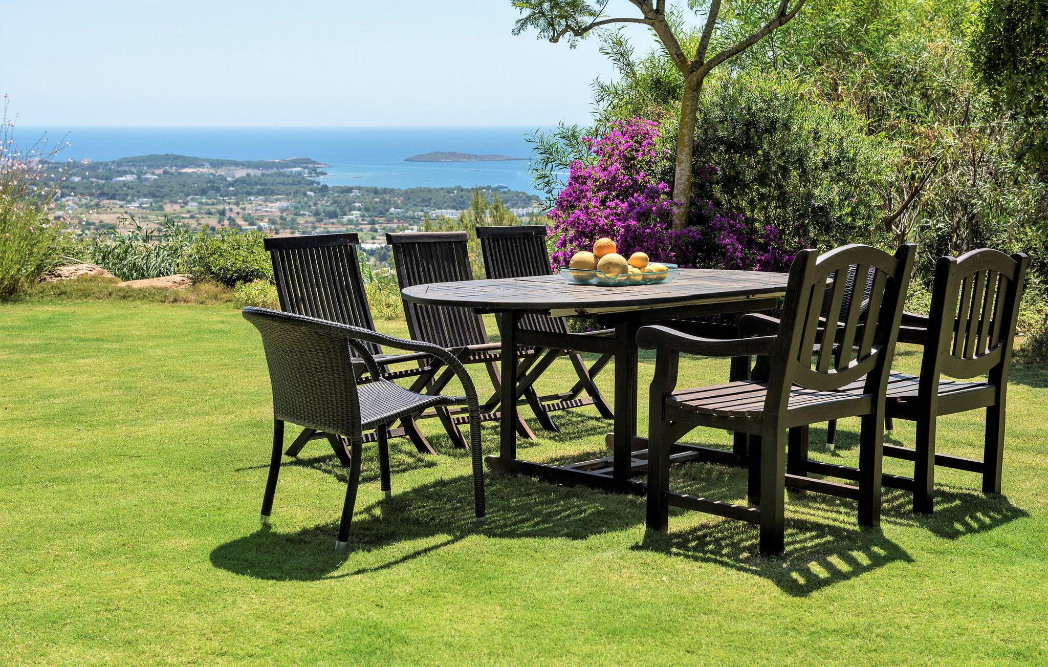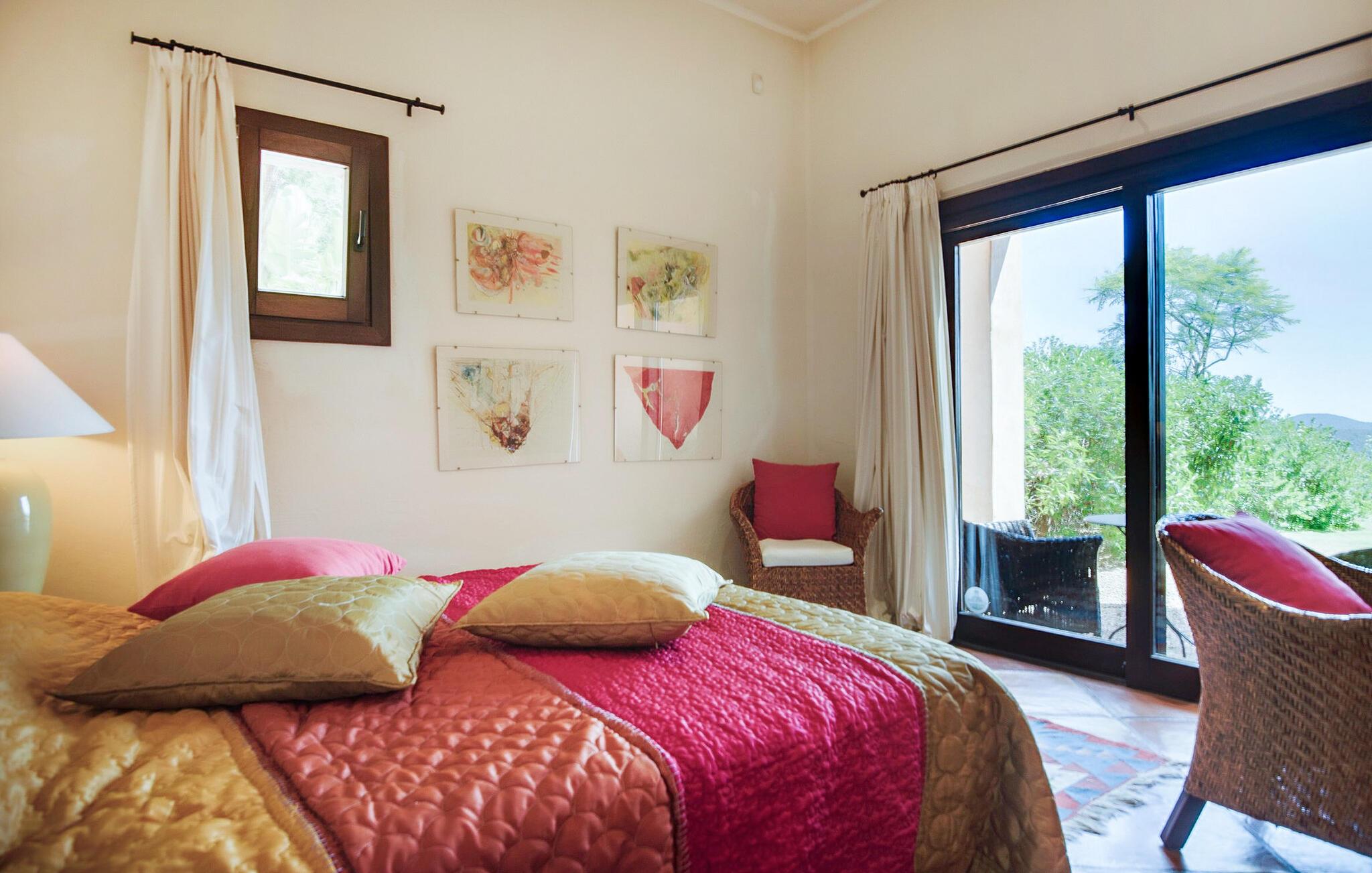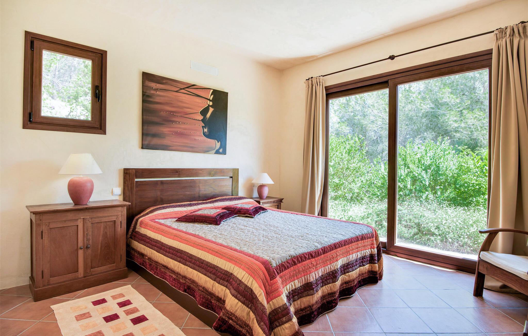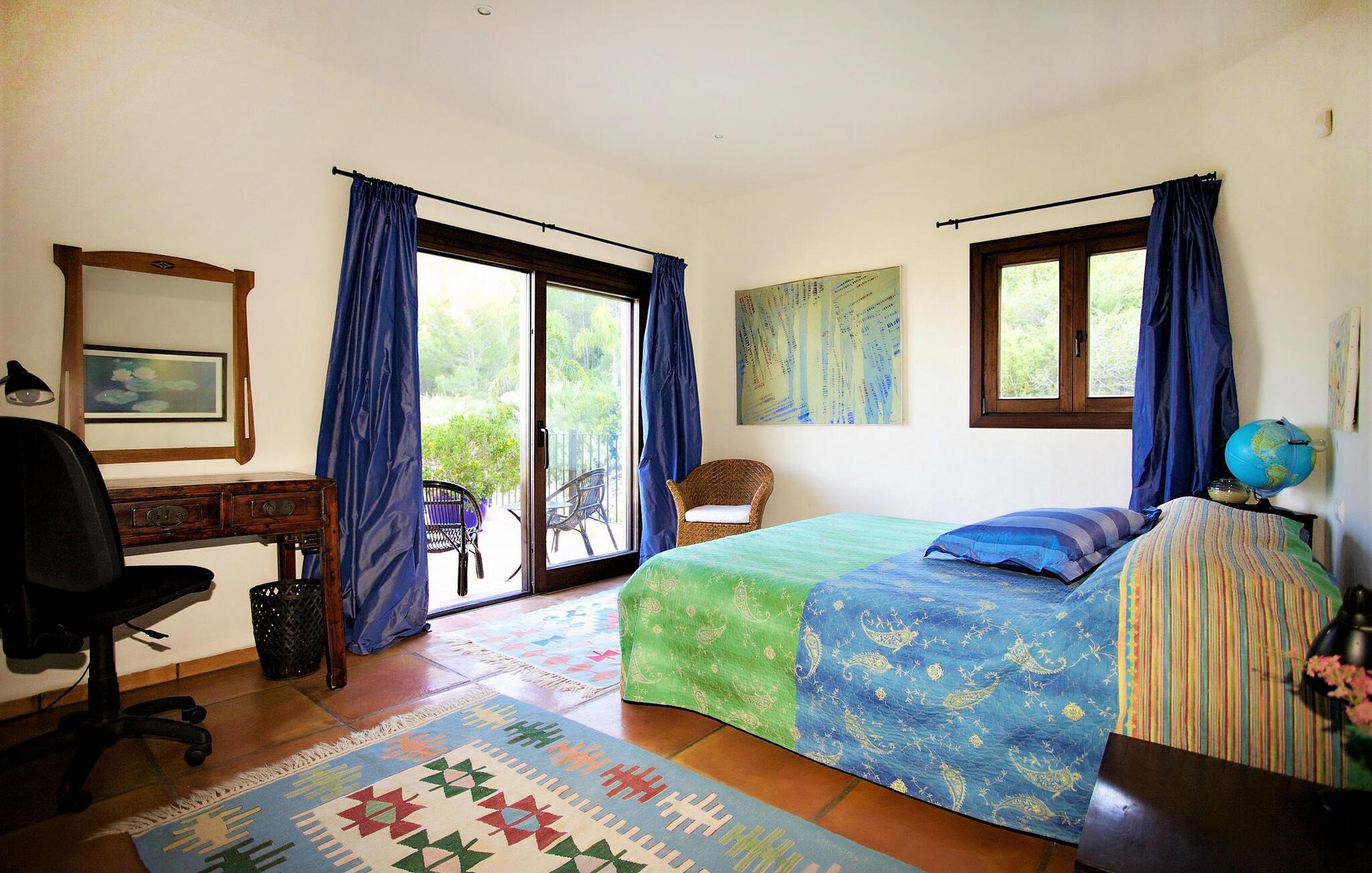 Denne fortryllende villa, beliggende på en stille bjergskråning og omgivet af 35.000 m² privat skov, tilbyder en betagende udsigt over landskabet og østkysten af Ibiza. På trods af sin rolige beliggenhed er det kun fem minutters kørsel fra den pulserende by og promenaden Santa Eulalia. Dette er et Fincallorca feriehus. En stor entré med et to-etagers glasloft byder jer velkommen i villaen og oversvømmer rummet med naturligt lys. Til højre tilbyder et arbejdsværelse med fiberoptisk internet, sofa og adgang til terrasse et roligt tilflugtssted. Til venstre er stuen med skydedøre, komfortable siddepladser, pejs, fjernsyn og stereoanlæg. Spisepladsen forbinder til et fuldt udstyret køkken med spisekammer, vaskemaskine og tørretumbler og åbner til en terrasse med have-, landskabs- og havudsigt. På denne etage er der også et soveværelse med dobbeltseng med en 160x200 cm seng, hydromassagebruser, aircondition og udgang til terrasse med havudsigt, samt et gæstetoilet. Det store soveværelse på første sal er en oase af luksus og har en 180x200 cm seng, en sofa, aircondition, et stort badeværelse med badekar, separat bruser og udgang til terrassen med vidunderlig havudsigt. Et andet soveværelse byder på en 160x200 cm seng, privat bruser, aircondition og adgang til terrassen. Et tredje soveværelse har en 160x200 cm seng, et en-suite badeværelse med bruser over badekarret, aircondition og en terrasse med vidunderlig udsigt. Udenfor skaber villaens smukt anlagte have et idyllisk uderum med frodige græsplæner, der omgiver store dele af huset. Slap af på terrassen, spis al fresco eller nyd den store pool omgivet af et soldæk med hængekøjer, mens I nyder den spektakulære landskab og havudsigt. Med en grundlæggende rengøring to gange om ugen, sikrer denne villa komfort, hvilket gør den til et perfekt tilflugtssted for dem, der søger privatliv og naturlig skønhed uden at gå på kompromis med nærheden til Ibizas attraktioner.