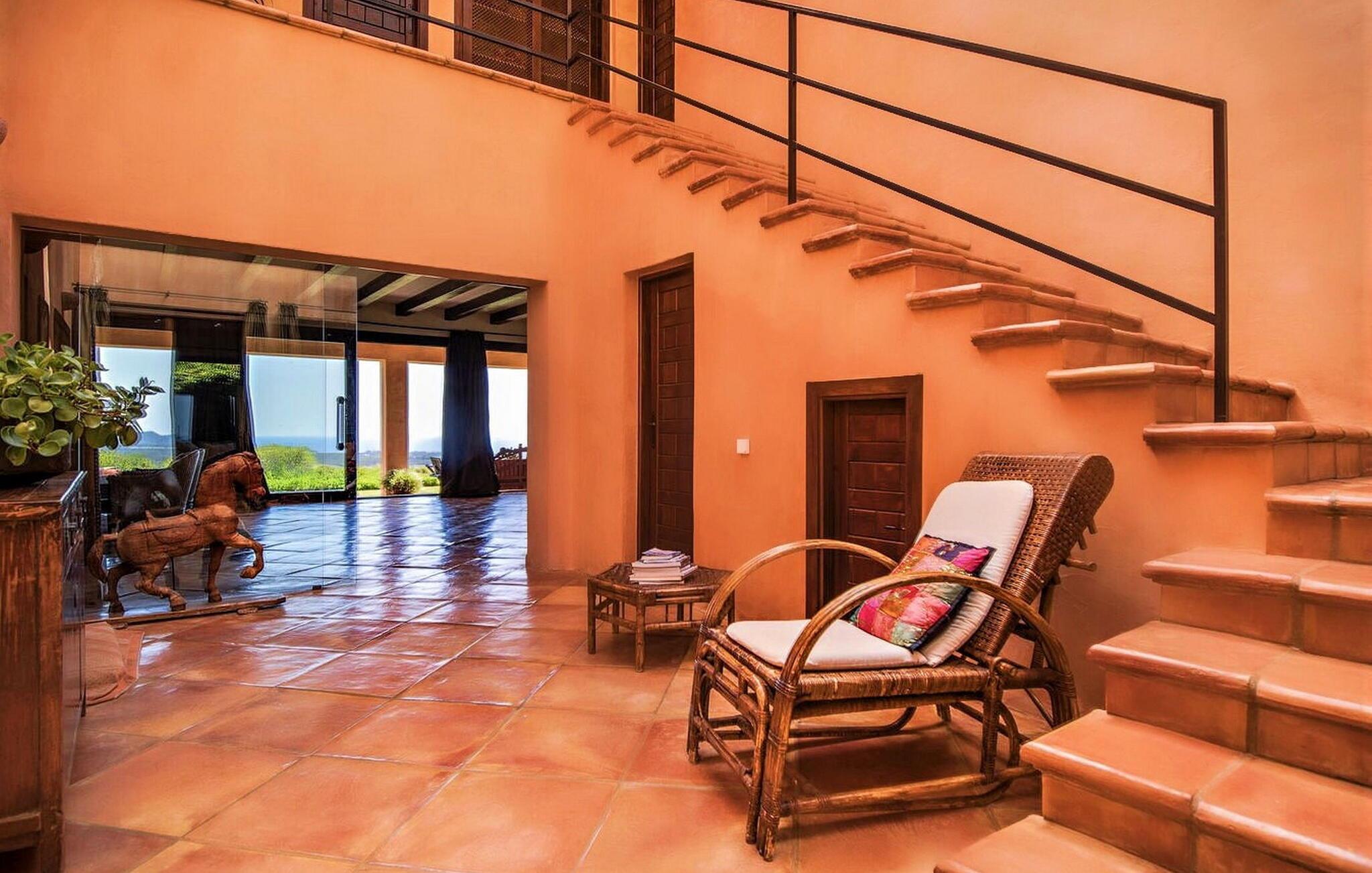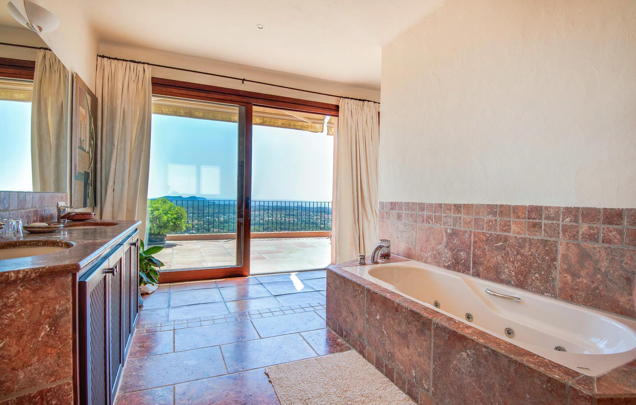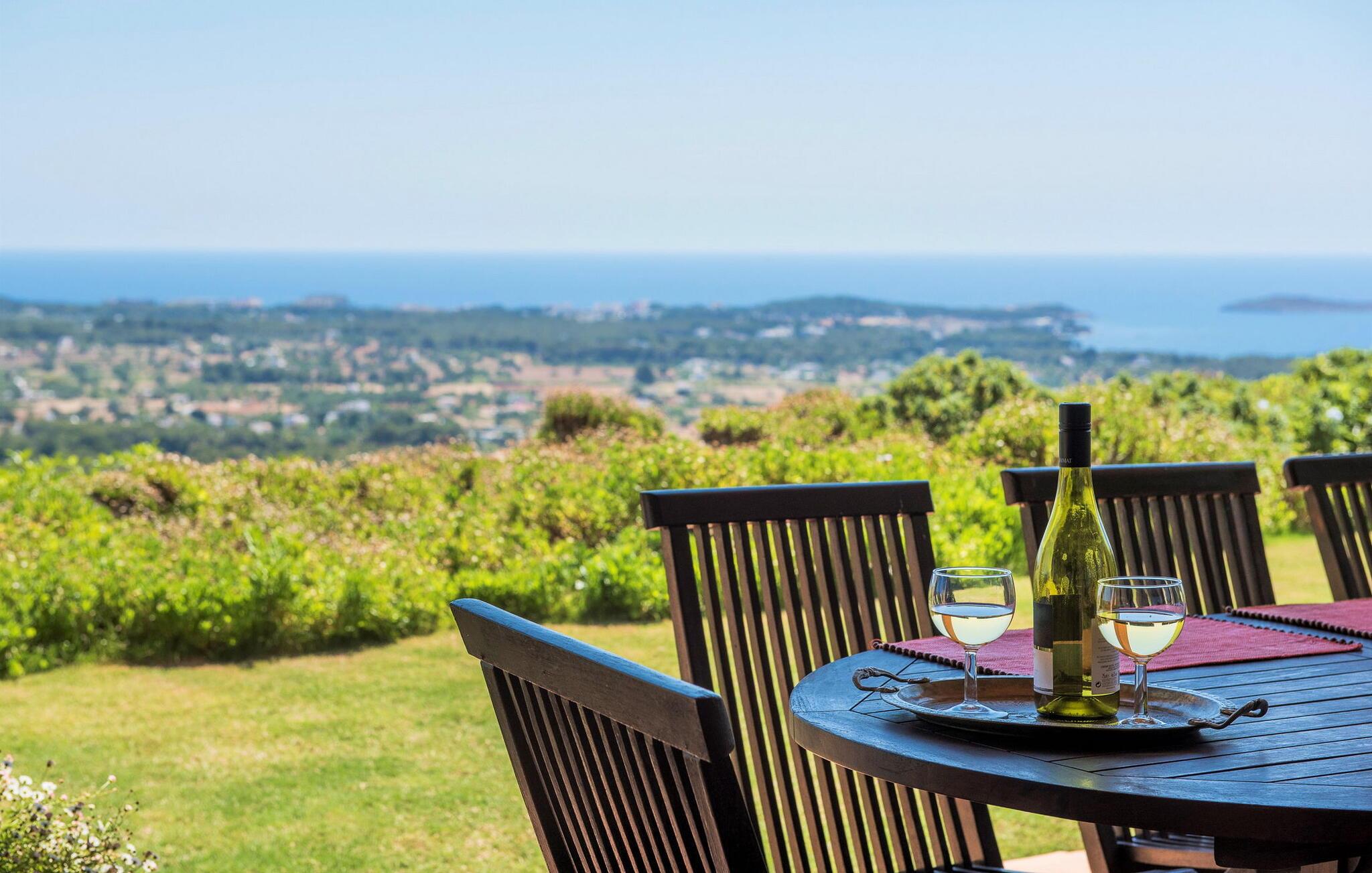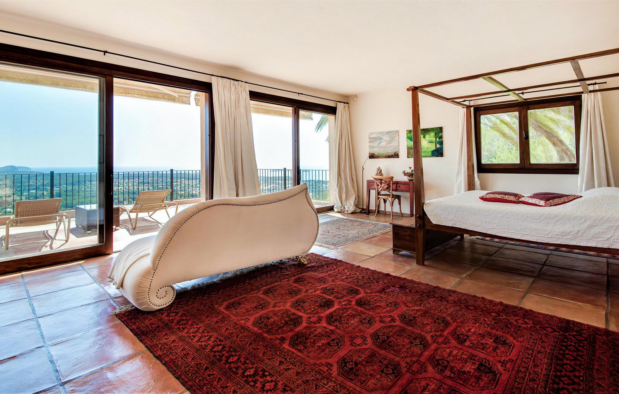 Denne fortryllende villa, beliggende på en stille bjergskråning og omgivet af 35.000 m² privat skov, tilbyder en betagende udsigt over landskabet og østkysten af Ibiza. På trods af sin rolige beliggenhed er det kun fem minutters kørsel fra den pulserende by og promenaden Santa Eulalia. Dette er et Fincallorca feriehus. En stor entré med et to-etagers glasloft byder jer velkommen i villaen og oversvømmer rummet med naturligt lys. Til højre tilbyder et arbejdsværelse med fiberoptisk internet, sofa og adgang til terrasse et roligt tilflugtssted. Til venstre er stuen med skydedøre, komfortable siddepladser, pejs, fjernsyn og stereoanlæg. Spisepladsen forbinder til et fuldt udstyret køkken med spisekammer, vaskemaskine og tørretumbler og åbner til en terrasse med have-, landskabs- og havudsigt. På denne etage er der også et soveværelse med dobbeltseng med en 160x200 cm seng, hydromassagebruser, aircondition og udgang til terrasse med havudsigt, samt et gæstetoilet. Det store soveværelse på første sal er en oase af luksus og har en 180x200 cm seng, en sofa, aircondition, et stort badeværelse med badekar, separat bruser og udgang til terrassen med vidunderlig havudsigt. Et andet soveværelse byder på en 160x200 cm seng, privat bruser, aircondition og adgang til terrassen. Et tredje soveværelse har en 160x200 cm seng, et en-suite badeværelse med bruser over badekarret, aircondition og en terrasse med vidunderlig udsigt. Udenfor skaber villaens smukt anlagte have et idyllisk uderum med frodige græsplæner, der omgiver store dele af huset. Slap af på terrassen, spis al fresco eller nyd den store pool omgivet af et soldæk med hængekøjer, mens I nyder den spektakulære landskab og havudsigt. Med en grundlæggende rengøring to gange om ugen, sikrer denne villa komfort, hvilket gør den til et perfekt tilflugtssted for dem, der søger privatliv og naturlig skønhed uden at gå på kompromis med nærheden til Ibizas attraktioner.