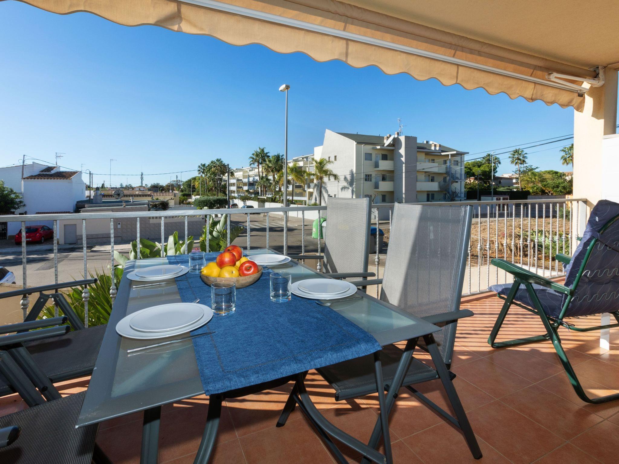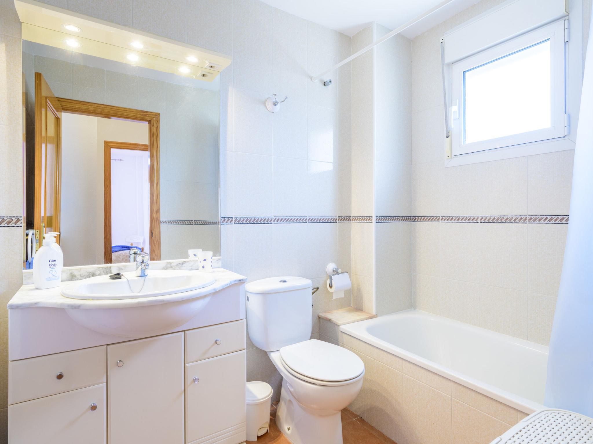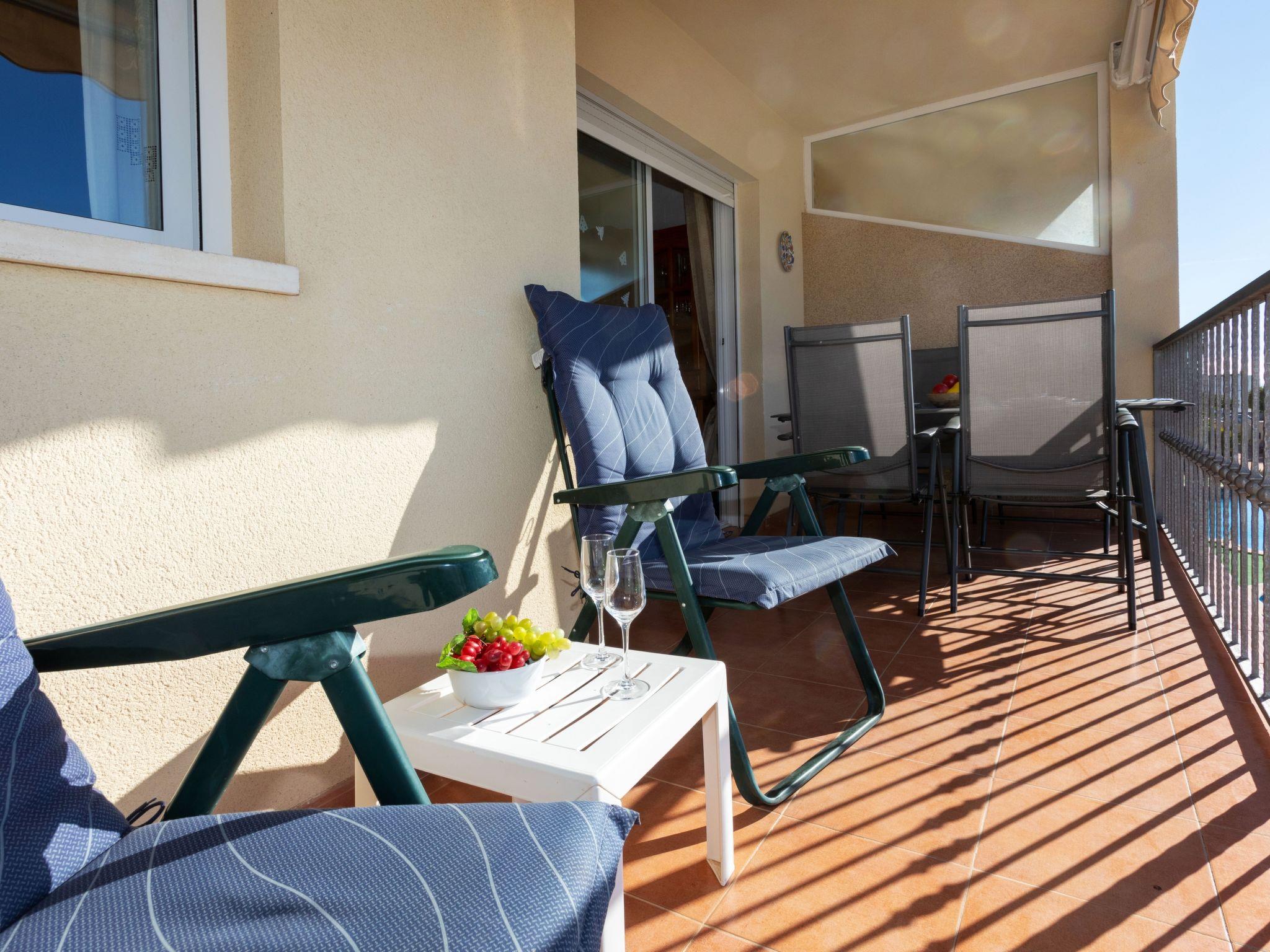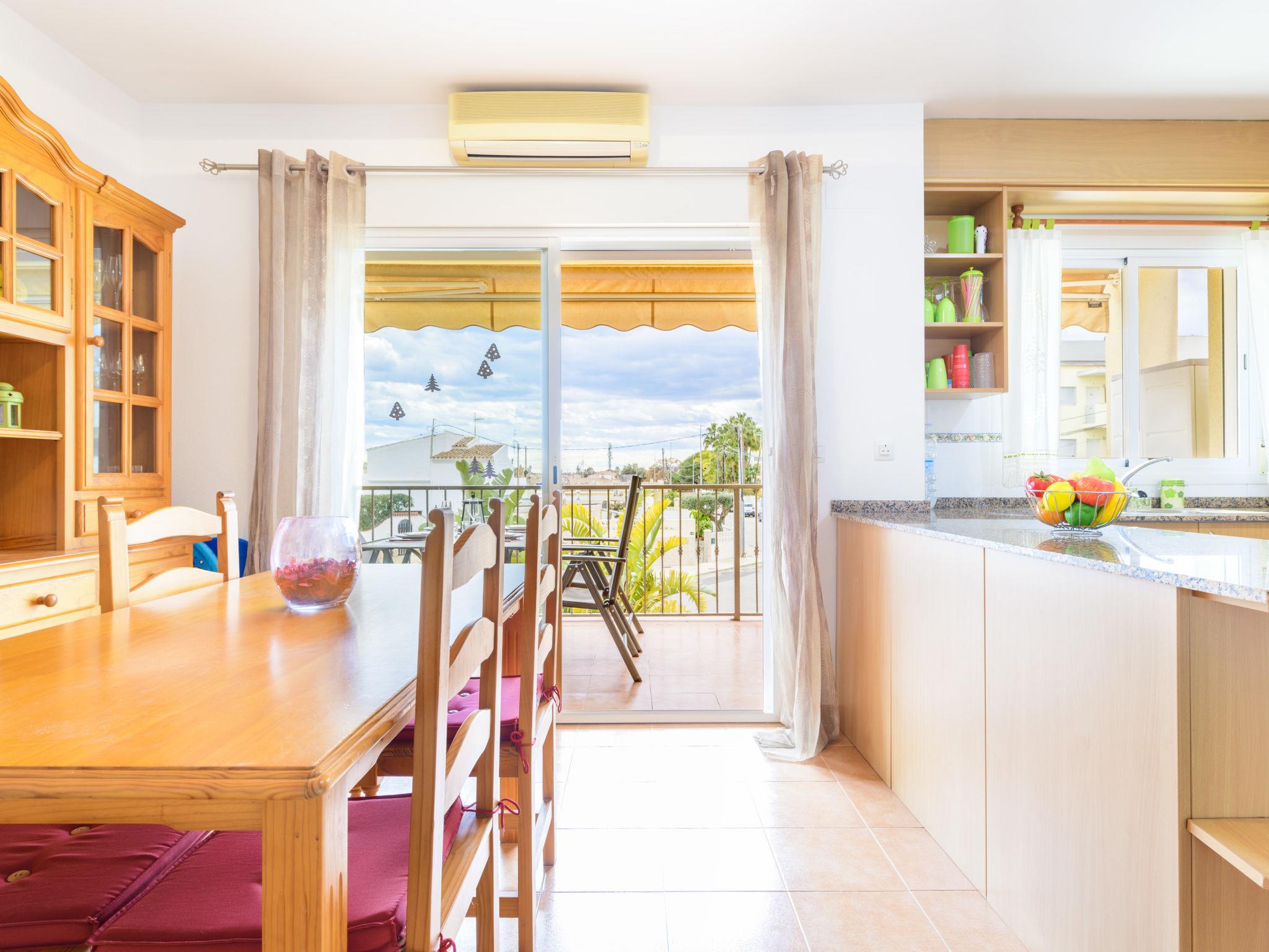 "Majari", 3-room apartment 76 m2 on 2nd floor. Object suitable for 4 adults. Bright, practical and beautiful furnishings: open living/dining room with dining table, digital TV and air conditioning. Exit to the terrace. 1 room with 1 french bed (1 x 150 cm, length 190 cm), fan. 1 room with 2 beds (90 cm, length 190 cm), fan. Open kitchen (oven, 4 ceramic glass hob hotplates, toaster, kettle, microwave, freezer, electric coffee machine) with bar, boiler (60 litres). Bath/WC. Electric heating. Heating not available in all rooms. Large terrace. Terrace furniture, deck chairs (2). Side view of the sea and the swimming pool. Facilities: washing machine, dryer, iron, hair dryer. Internet (WiFi, free). Parking space n 2, garage at the house. Please note: suitable for families apartment street side. Non-smoking house. Maximum 1 pet/ dog allowed. TV only ES. No lift. Airfryer in the kitchen. VT-42230CS // Reg. Nr.: ESFCTU000012009000245959000000000000000000VT-42230CS4