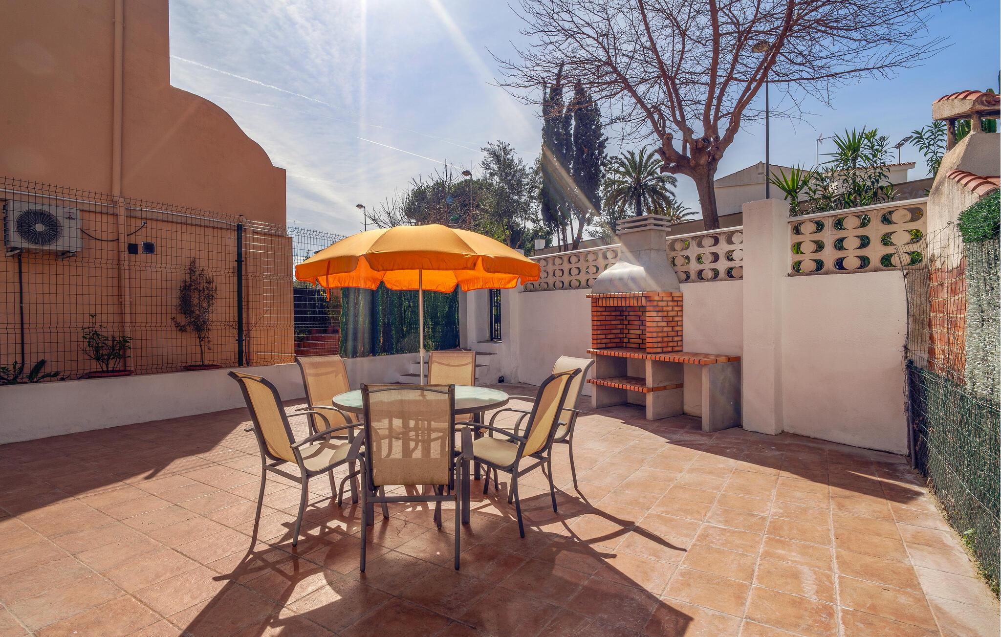 Udendørsområdet byder på en rummelig solterrasse med en skyggefuld spiseplads - ideel til en solid morgenmad i den friske luft eller en hyggelig grillaften. Forkæl jer selv med et glas vin ved solnedgang og lad middelhavsstemningen sænke sig.