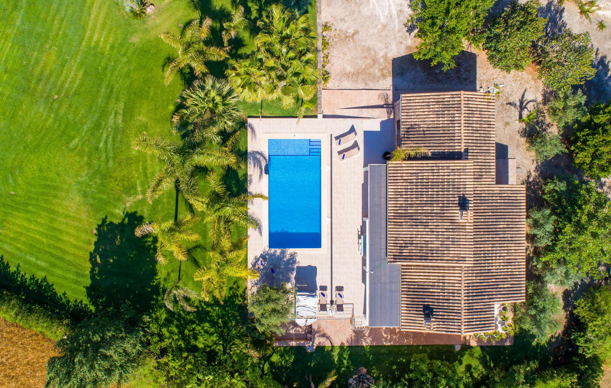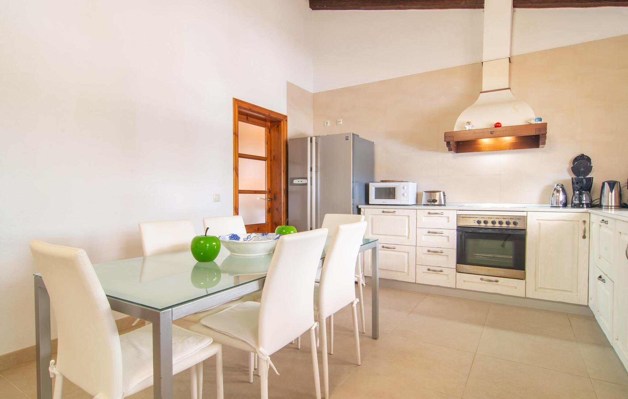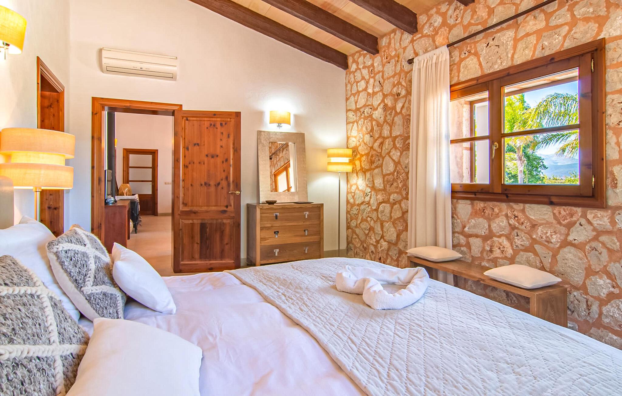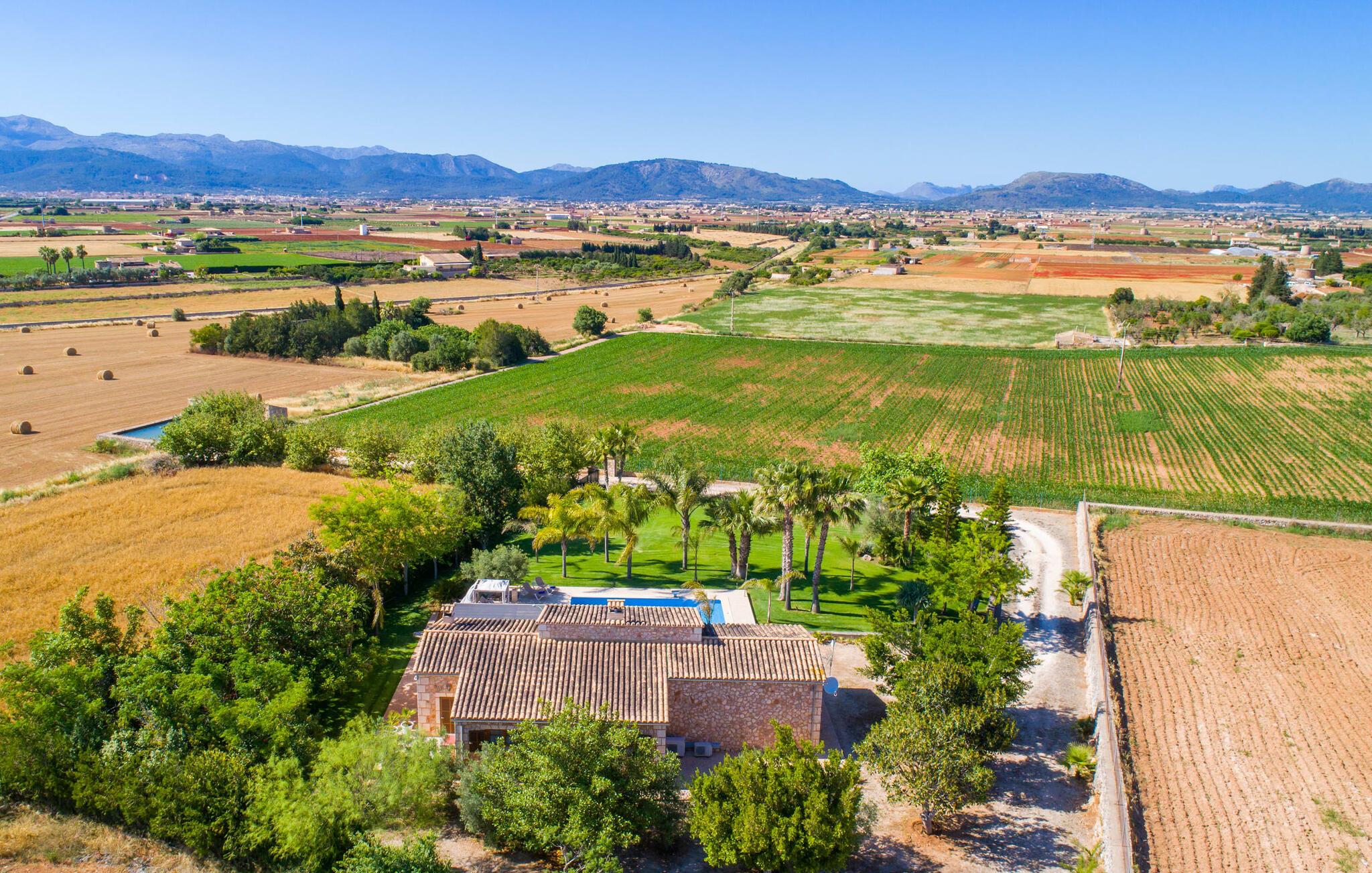 Livet på landet er ikke nødvendigvis fuld af afsavn – tværtimod: Drømmer I om en villaferie tæt på naturen i en rolig, men ikke isoleret beliggenhed med alle bekvemmelighederne i et moderne sommerhus, så er "Vinroma" det perfekte valg for jer ! Naturstenshuset i 1 plan ligger på en smukt anlagt, kærligt anlagt ejendom og byder på en vidunderlig udsigt over de omkringliggende marker og bjerge i det fjerne. Bag huset er der ikke kun en overdækket terrasse med spisebord, stole og komfortable havemøbler, men også en stor, lavvandet pool med integreret spabad og et behageligt lydende stilfuldt vandfald. Her kan I virkelig forkæle jer selv i fuldstændig privatliv og efter en forfriskende svømmetur i det kølige vand nyde en velfortjent siesta på en af de indbydende liggestole. Når I kigger søvnigt over jeres solbriller, kan I kun se de imponerende, høje palmer plantet langs poolens lange side - en drøm! Og det samme gælder indretningen: Kom og føl jer godt er feriemantraet her. Interiøret er gennemgående designet i en lys, frisk og klassisk stil. Hvide og creme vægge veksler med rustikke naturstensvægge, suppleret af smukke mørkebrune træbjælker på lofterne. Et særligt højdepunkt ved den yderst velholdte villa er konstruktionen i et plan. Ingen skal gå op ad trapper her – hvilket kan være en kæmpe lettelse, især med børn, men også for alle andre. I den åbne og rummelige spise- og opholdsstue kan I enten sidde ved det enkle, moderne træbord med smarte stole og nyde et afslappet måltid sammen eller sætte jer ned i de elegante læderlænestole eller den tilhørende sofa og nyde en krimi-thriller på tv med en glas vin. I kan også sidde ved det stilrene glasbord med delvist gennemsigtige stole i køkkenet, som er udstyret med højkvalitets hvidevarer og et stort køleskab. Og når I er træt, kan I bare trække jer tilbage til et af de tre stilfulde dobbeltværelser, hvoraf det ene har eget badeværelse. Beboerne i de to andre soveværelser deler endnu et rummeligt badeværelse. jeres villa "Vinroma" er omgivet af smukke landskaber, der er typiske for den nordlige del af øen. Den ligger midt i den såkaldte "grøntsagskurv" på Mallorca, i en særlig grøn, frugtbar slette. Nyd et par afslappende gåture på opdagelse eller en cykeltur gennem naturen, som altid inkluderer den vidunderlige udsigt over bjergene i det fjerne. Bymidten i Muro er også let tilgængelig til fods - så I har adskillige indkøbsmuligheder, restauranter og caféer lige uden for døren. Muro er blevet skånet for masseturisme og er en rustik lille mallorcansk by i ordets bedste betydning, med smalle gader, smukke sandstenshuse og et museum, der er værd at se, Museo Museu Etnologico de Muro. Her kan I lære en masse om livet på landet på øen gennem århundreder og beundre udstillinger lige fra kunsthåndværk til musikinstrumenter. Foretrækker I at tage til stranden, skal I blot køre cirka 11 km til Alcúdia-bugten, hvor I finder en fin, hvid sandstrand og grønne klitter. Et smukt etplanshus, omgivet af en velholdt have med grøn græsplæne, duftende blomster og en stor pool, indlejret i et fantastisk middelhavslandskab: Dette er villaen "Vinroma" nær Muro på det nordlige Mallorca. Her kan I nyde jeres familieferie i fred - men I kan også gå til byen kun 0,6 km væk, prøve de lokale restauranter og shoppe. Og den nærmeste strand ligger kun omkring 11 km væk og kan hurtigt nås med lejebil.