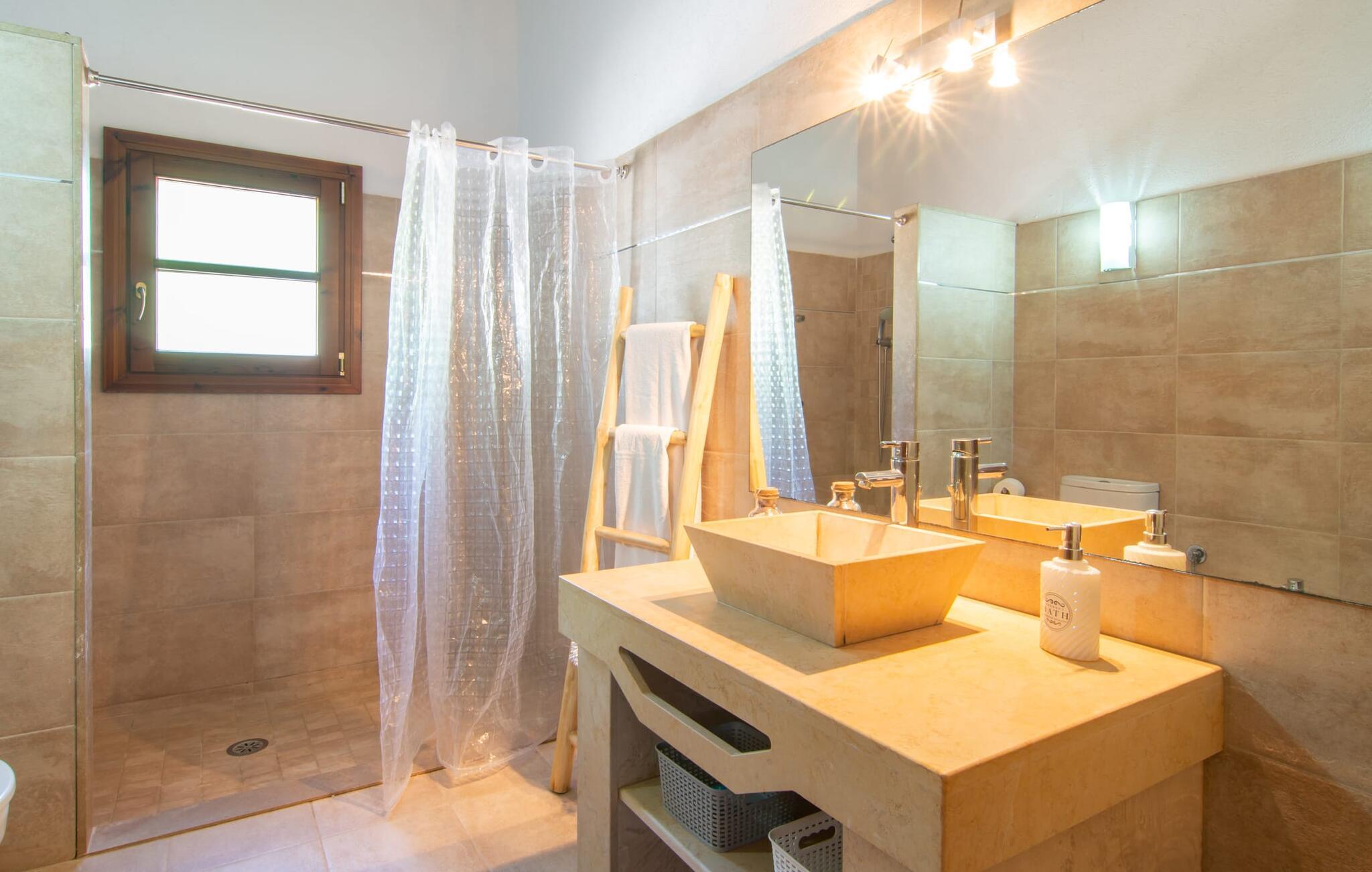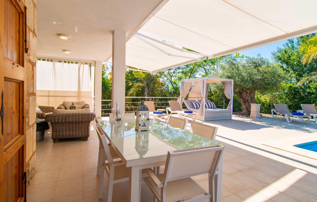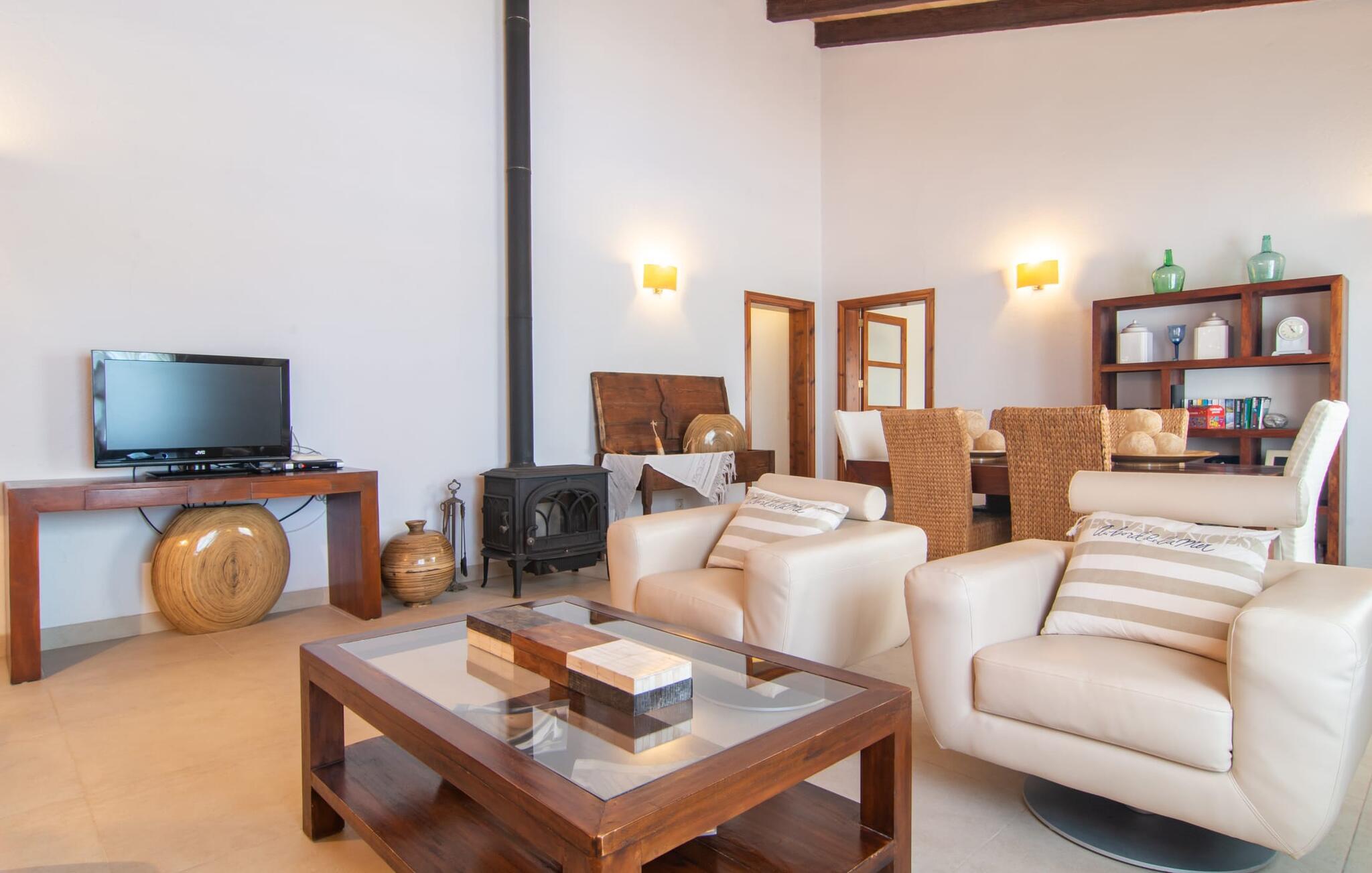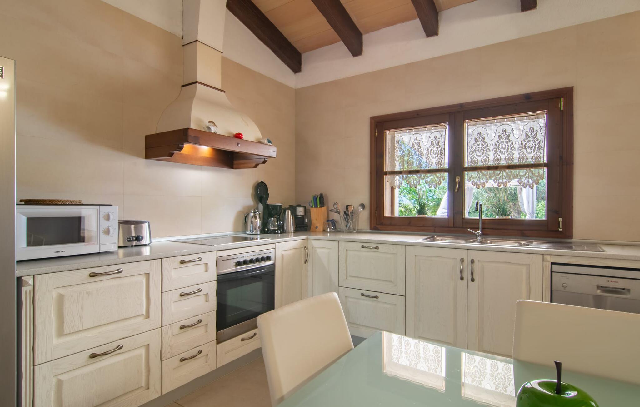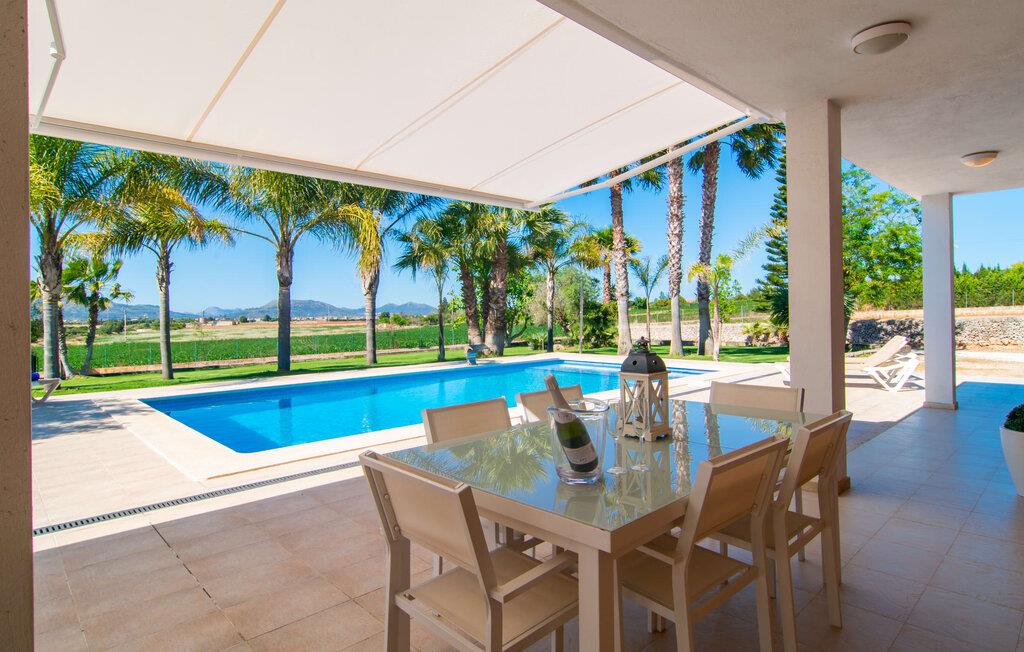 Livet på landet er ikke nødvendigvis fuld af afsavn – tværtimod: Drømmer I om en villaferie tæt på naturen i en rolig, men ikke isoleret beliggenhed med alle bekvemmelighederne i et moderne sommerhus, så er "Vinroma" det perfekte valg for jer ! Naturstenshuset i 1 plan ligger på en smukt anlagt, kærligt anlagt ejendom og byder på en vidunderlig udsigt over de omkringliggende marker og bjerge i det fjerne. Bag huset er der ikke kun en overdækket terrasse med spisebord, stole og komfortable havemøbler, men også en stor, lavvandet pool med integreret spabad og et behageligt lydende stilfuldt vandfald. Her kan I virkelig forkæle jer selv i fuldstændig privatliv og efter en forfriskende svømmetur i det kølige vand nyde en velfortjent siesta på en af de indbydende liggestole. Når I kigger søvnigt over jeres solbriller, kan I kun se de imponerende, høje palmer plantet langs poolens lange side - en drøm! Og det samme gælder indretningen: Kom og føl jer godt er feriemantraet her. Interiøret er gennemgående designet i en lys, frisk og klassisk stil. Hvide og creme vægge veksler med rustikke naturstensvægge, suppleret af smukke mørkebrune træbjælker på lofterne. Et særligt højdepunkt ved den yderst velholdte villa er konstruktionen i et plan. Ingen skal gå op ad trapper her – hvilket kan være en kæmpe lettelse, især med børn, men også for alle andre. I den åbne og rummelige spise- og opholdsstue kan I enten sidde ved det enkle, moderne træbord med smarte stole og nyde et afslappet måltid sammen eller sætte jer ned i de elegante læderlænestole eller den tilhørende sofa og nyde en krimi-thriller på tv med en glas vin. I kan også sidde ved det stilrene glasbord med delvist gennemsigtige stole i køkkenet, som er udstyret med højkvalitets hvidevarer og et stort køleskab. Og når I er træt, kan I bare trække jer tilbage til et af de tre stilfulde dobbeltværelser, hvoraf det ene har eget badeværelse. Beboerne i de to andre soveværelser deler endnu et rummeligt badeværelse. jeres villa "Vinroma" er omgivet af smukke landskaber, der er typiske for den nordlige del af øen. Den ligger midt i den såkaldte "grøntsagskurv" på Mallorca, i en særlig grøn, frugtbar slette. Nyd et par afslappende gåture på opdagelse eller en cykeltur gennem naturen, som altid inkluderer den vidunderlige udsigt over bjergene i det fjerne. Bymidten i Muro er også let tilgængelig til fods - så I har adskillige indkøbsmuligheder, restauranter og caféer lige uden for døren. Muro er blevet skånet for masseturisme og er en rustik lille mallorcansk by i ordets bedste betydning, med smalle gader, smukke sandstenshuse og et museum, der er værd at se, Museo Museu Etnologico de Muro. Her kan I lære en masse om livet på landet på øen gennem århundreder og beundre udstillinger lige fra kunsthåndværk til musikinstrumenter. Foretrækker I at tage til stranden, skal I blot køre cirka 11 km til Alcúdia-bugten, hvor I finder en fin, hvid sandstrand og grønne klitter. Et smukt etplanshus, omgivet af en velholdt have med grøn græsplæne, duftende blomster og en stor pool, indlejret i et fantastisk middelhavslandskab: Dette er villaen "Vinroma" nær Muro på det nordlige Mallorca. Her kan I nyde jeres familieferie i fred - men I kan også gå til byen kun 0,6 km væk, prøve de lokale restauranter og shoppe. Og den nærmeste strand ligger kun omkring 11 km væk og kan hurtigt nås med lejebil.